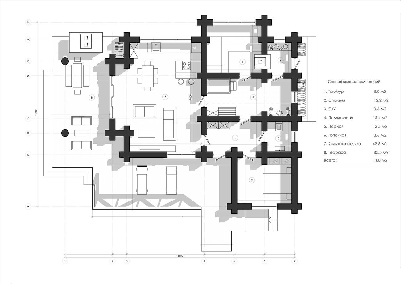 Пологие крыши (20 гр) и большой вылет карнизов, зрительно и фактически, занижают объем и усиливают его связь с ландшафтом. Перед баней на участке предусматривается искусственный пруд и благоустройство прилежащей территории.