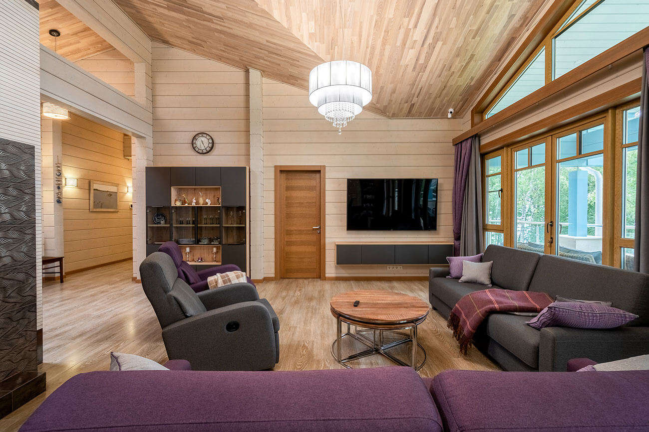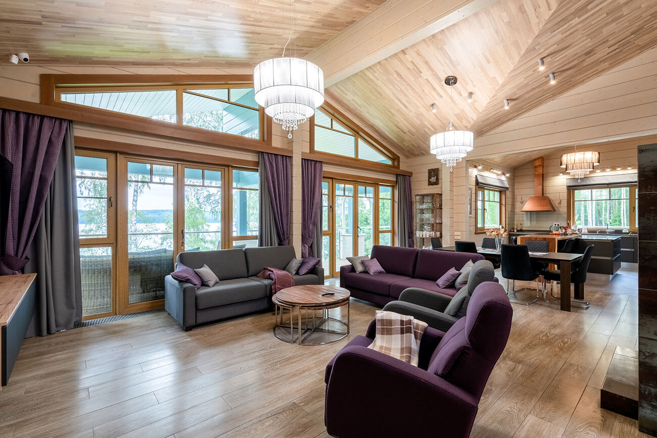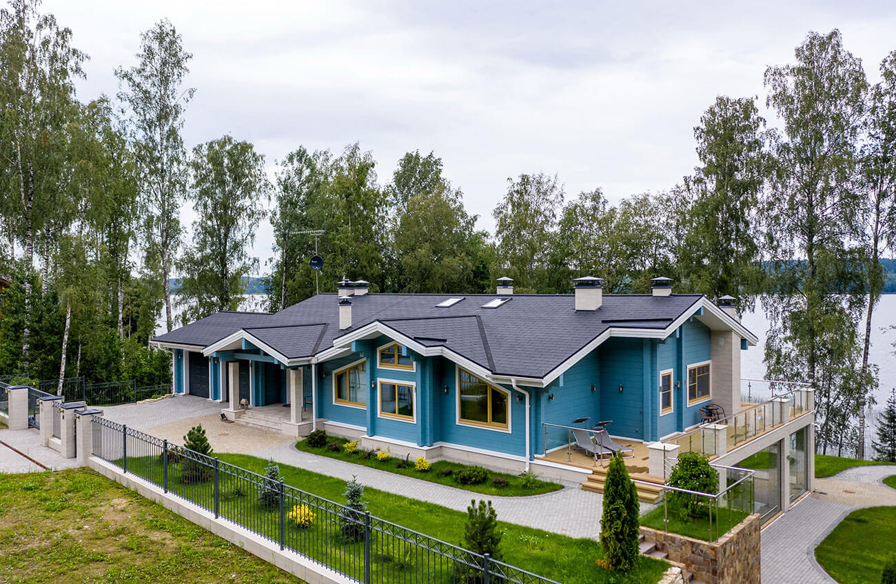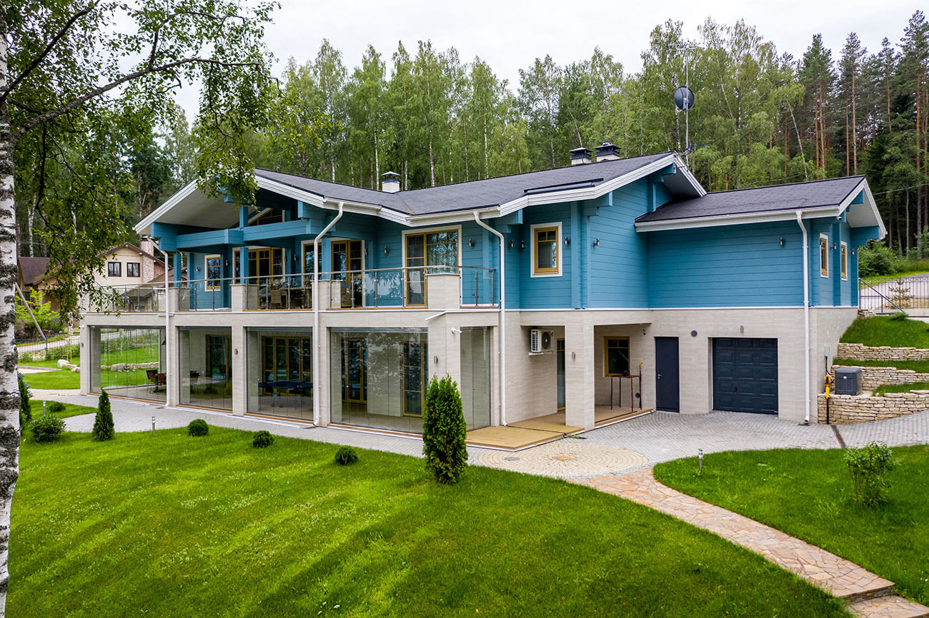 Частный двухуровневый дом с обширными террасами расположен на живописном берегу озера в поселке «Солнечный берег» Ленинградской области.