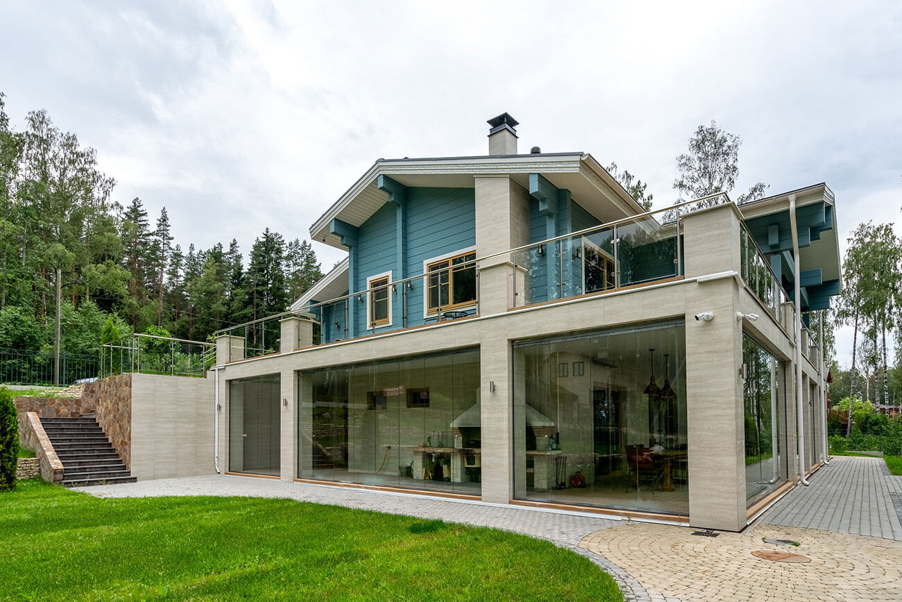 В стилистистическом решении объединены элементы современного шале и кантри. Свободная планировка помещений визуально ориентирована на видовое пространство участка. Первый этаж выполнен полностью деревянным и легким; цоколь, уходящий вниз по рельефу, напротив, сделан на контрасте — массивным и каменным. Безрамное остекление террасы цоколя, зрительно переходящее в ограждение первого этажа, придает постройке стилистическую актуальность и органично связывает с окружением, которое в нем отражается.