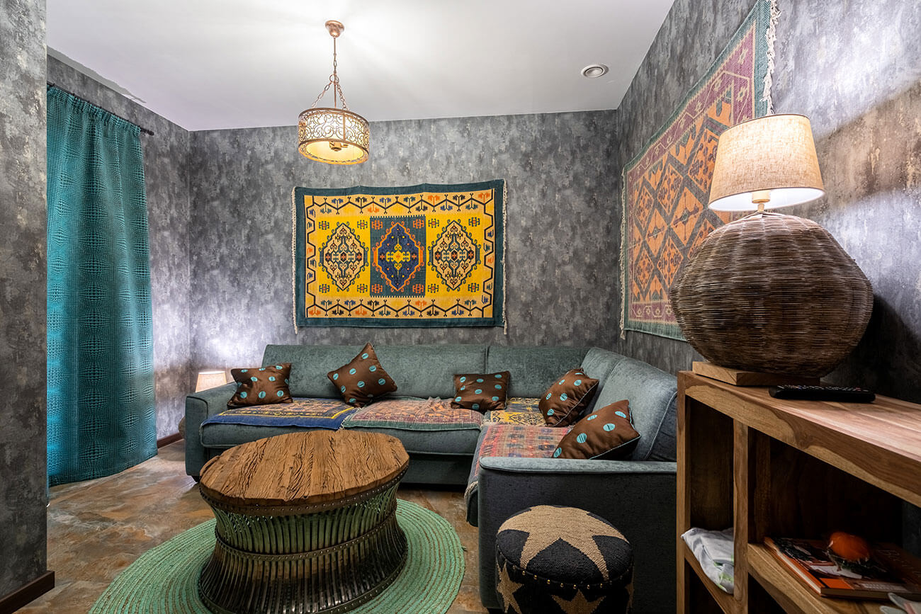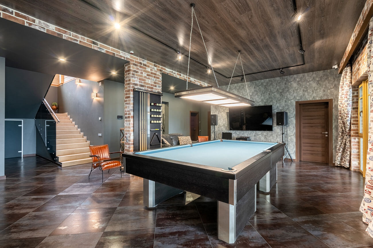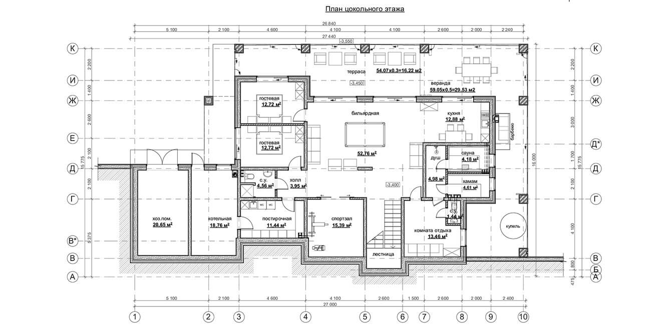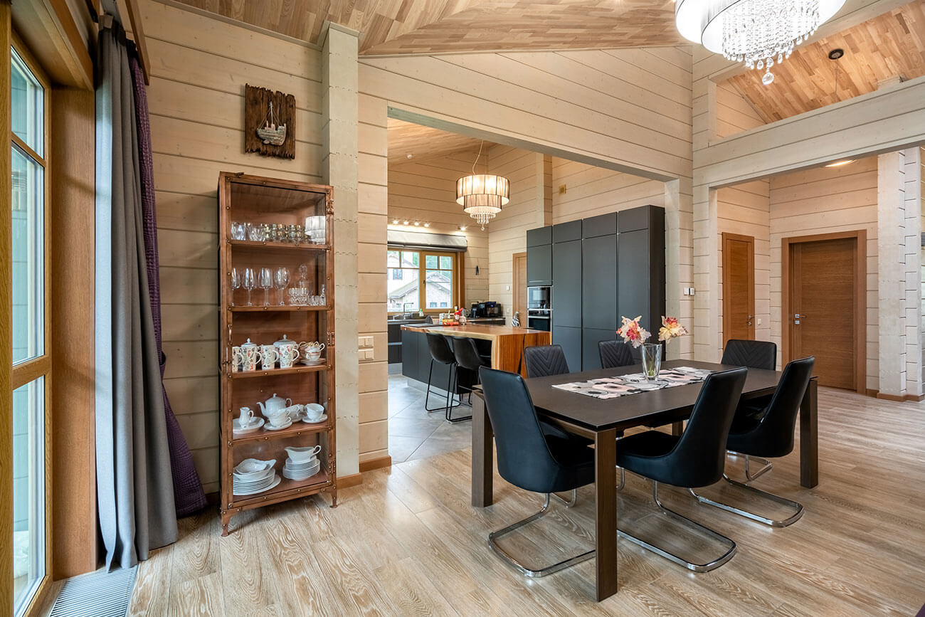 Функционально дом разделен на приватный и гостевой этажи. Все помещения и комнаты семейного круга расположены на первом этаже. Это — основная гостиная-кухня-столовая с кладовой, две детские с санузлом, хозяйская спальня с санузлом и гардеробом, входная группа с гаражом, гардеробом и санузлом, а также выход на большую террасу первого этажа. Цокольный этаж включает две гостевые спальни с санузлом, бильярдную, спортзал, кухню, спа-комплекс с сауной и хаммамом, санузлом, душевой и комнатой отдыха, а также имеет выход на остекленную террасу с зоной для барбекю.