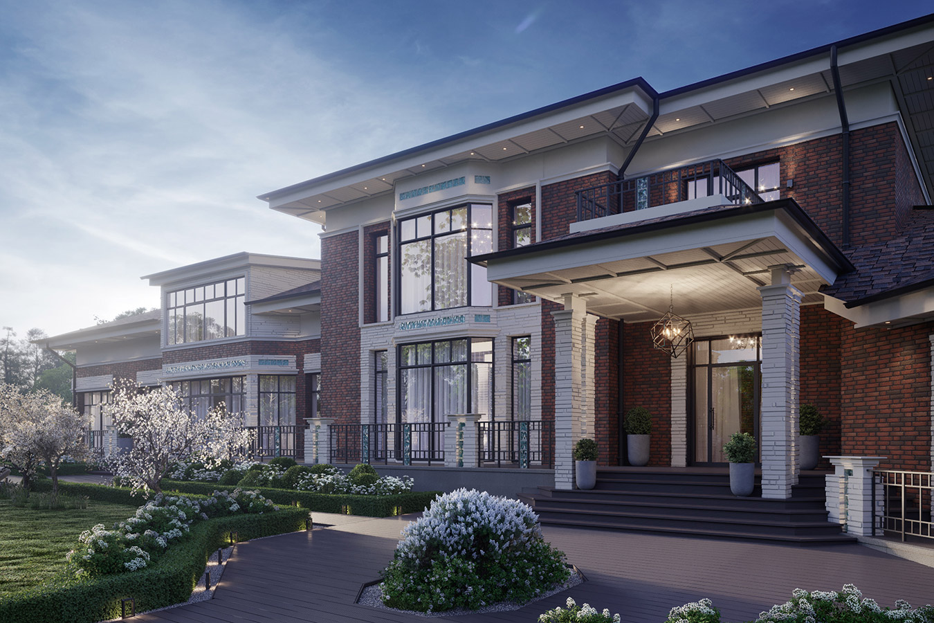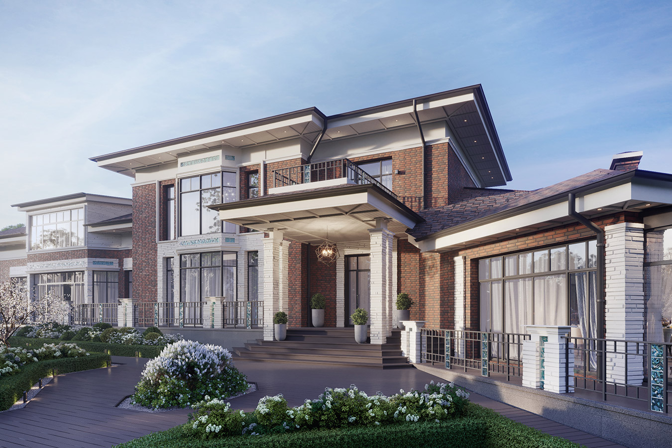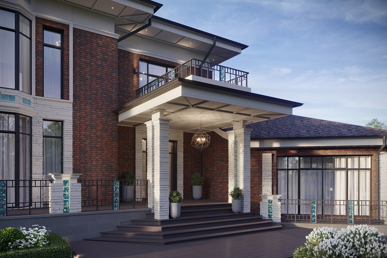 Клинкерный кирпич, белый камень, декоративные вставки из стекла, панорамные окна — все это отражает авторское прочтение американского модерна.