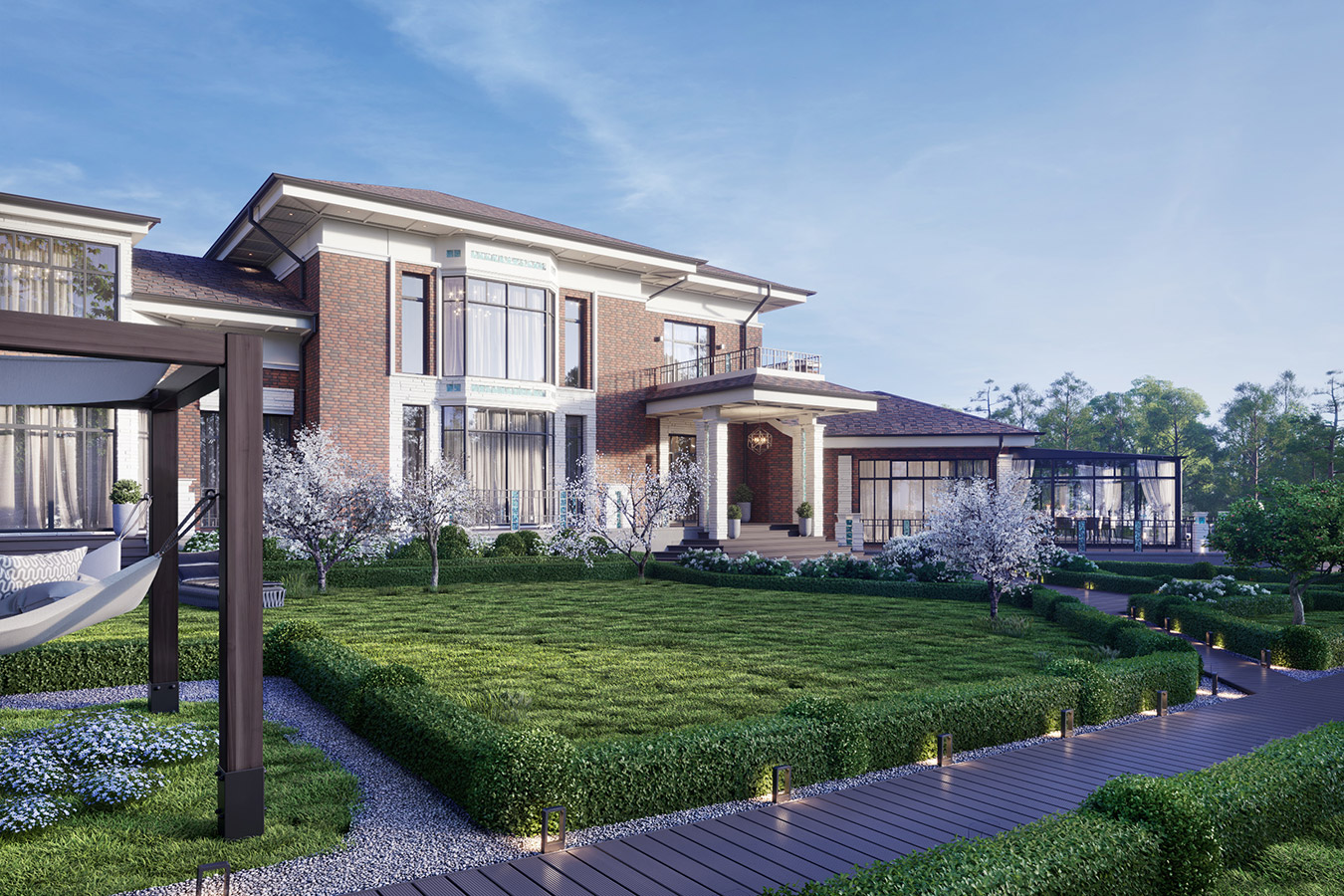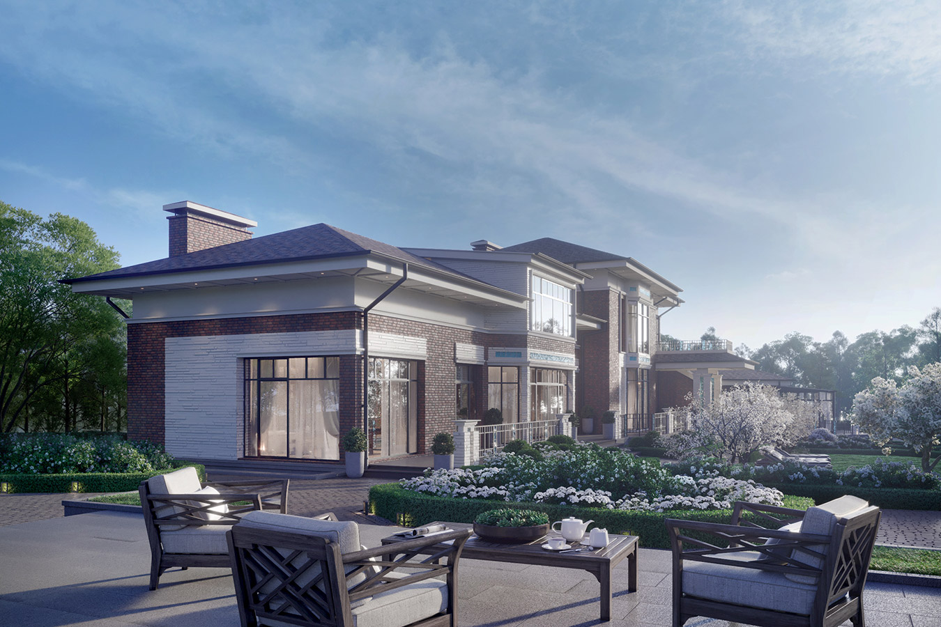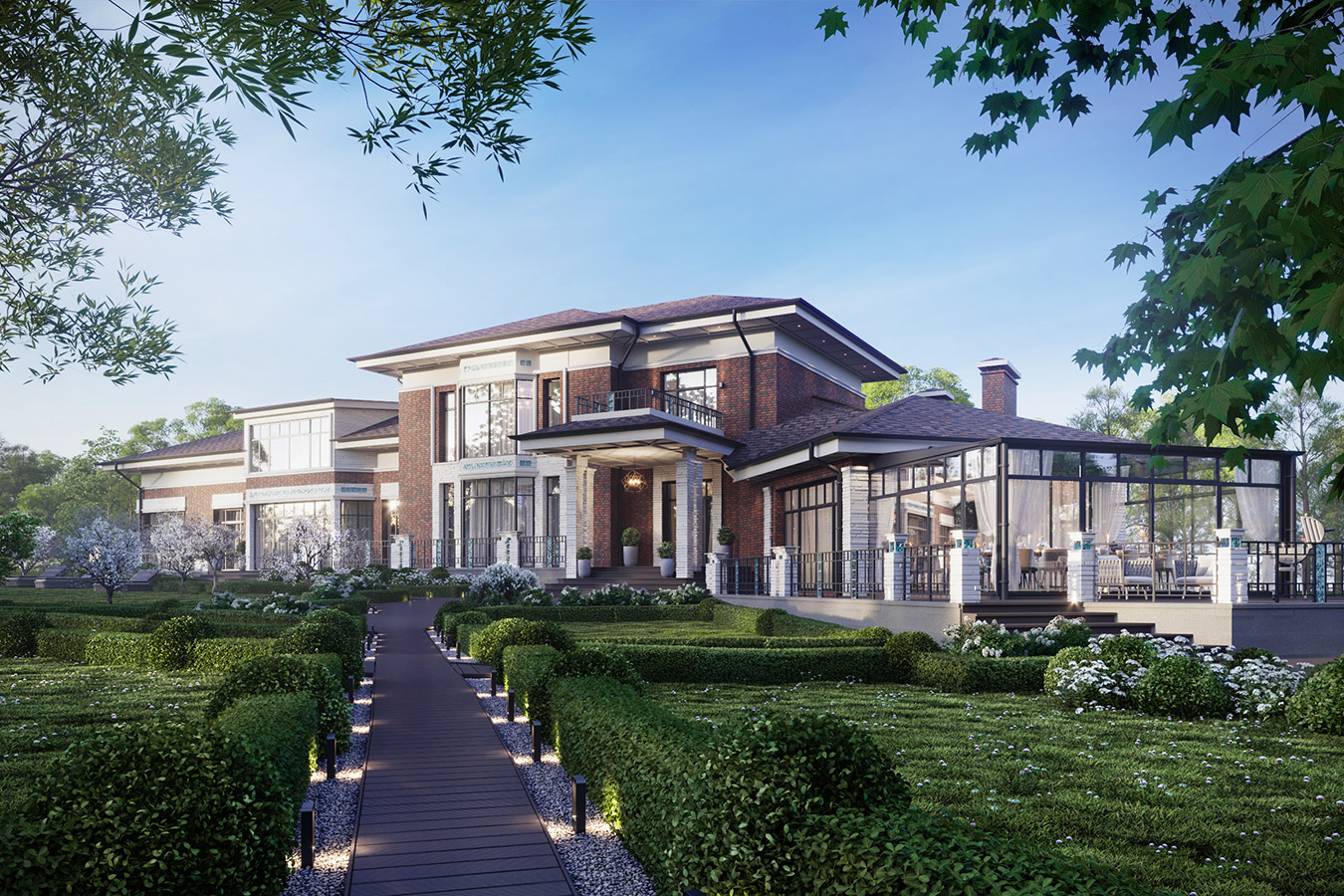 Клинкерный кирпич, белый камень, декоративные вставки из стекла, панорамные окна — все это отражает авторское прочтение американского модерна.