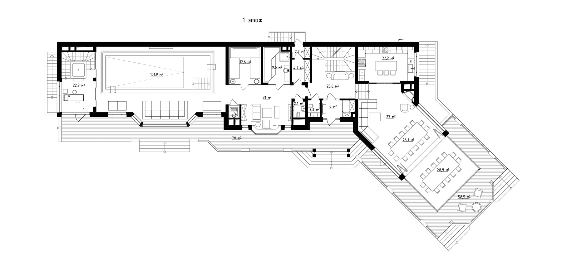 Помимо гостиной, кухни, столовой, входной зоны на первом этаже размещена внушительная спа-зона с 11-метровым бассейном, зоной отдыха, хаммамом, парной, массажным кабинетом и гидромассажной ванной. Последняя занимает угловое помещение с панорамными окнами, через которые открывается прекрасный вид на сад. На втором этаже располагаются спальни и спортивый зал.