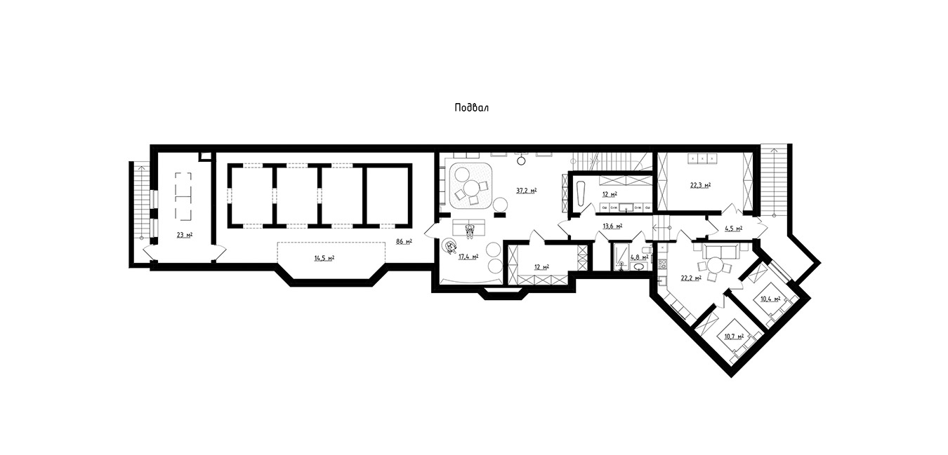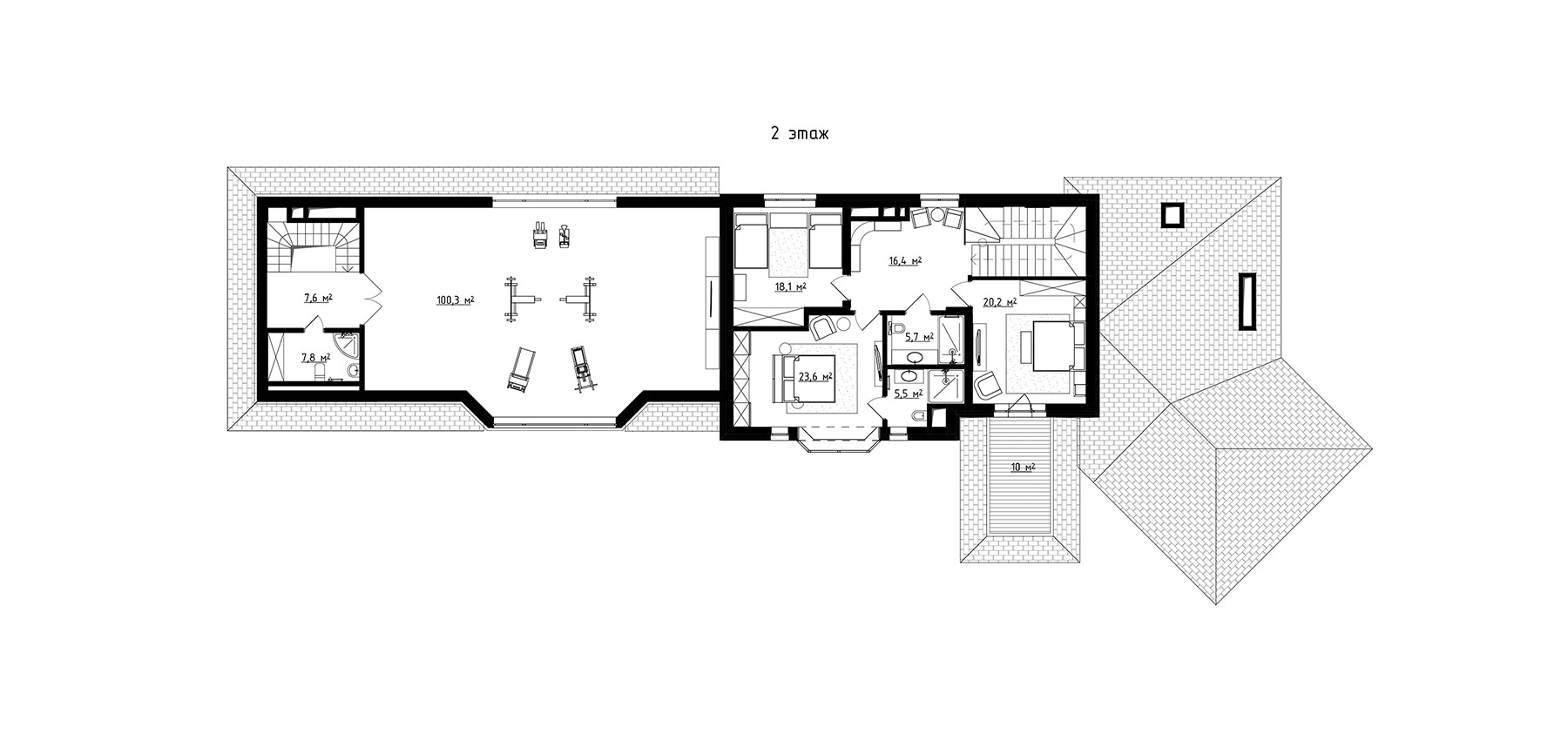 Протяженность здания в длину обусловила вытянутая конфигурация участка. Благодаря компоновке помещений под разноуровневыми крышами фасад приобрел динамичность и выразительность.