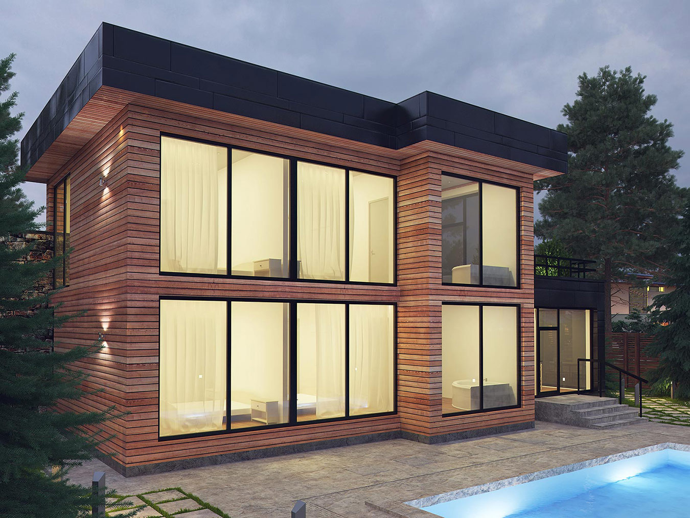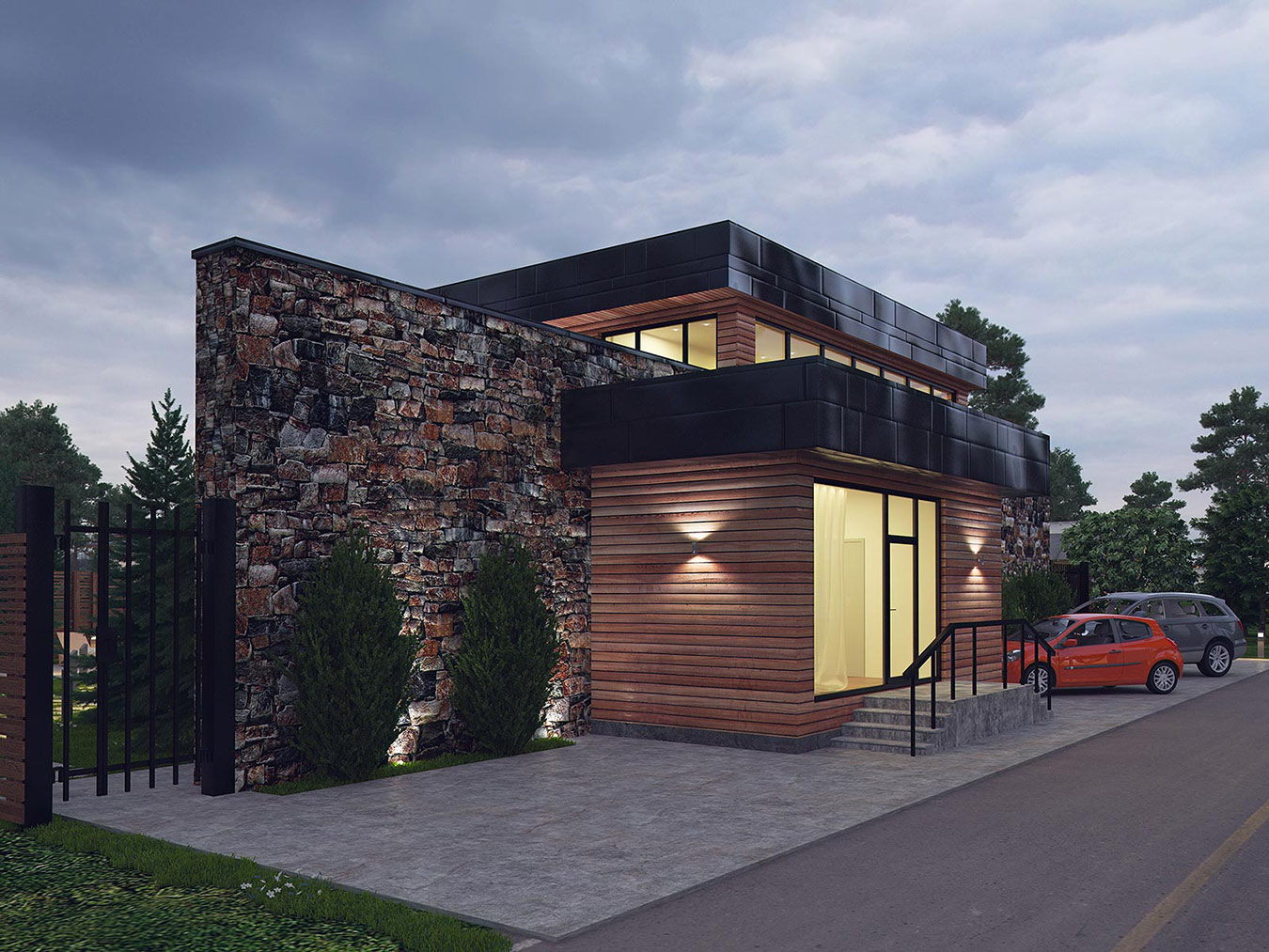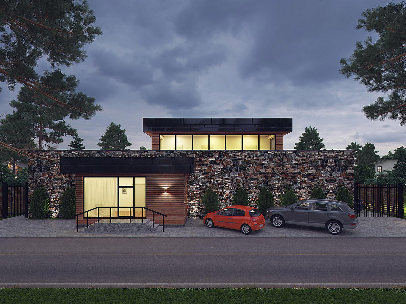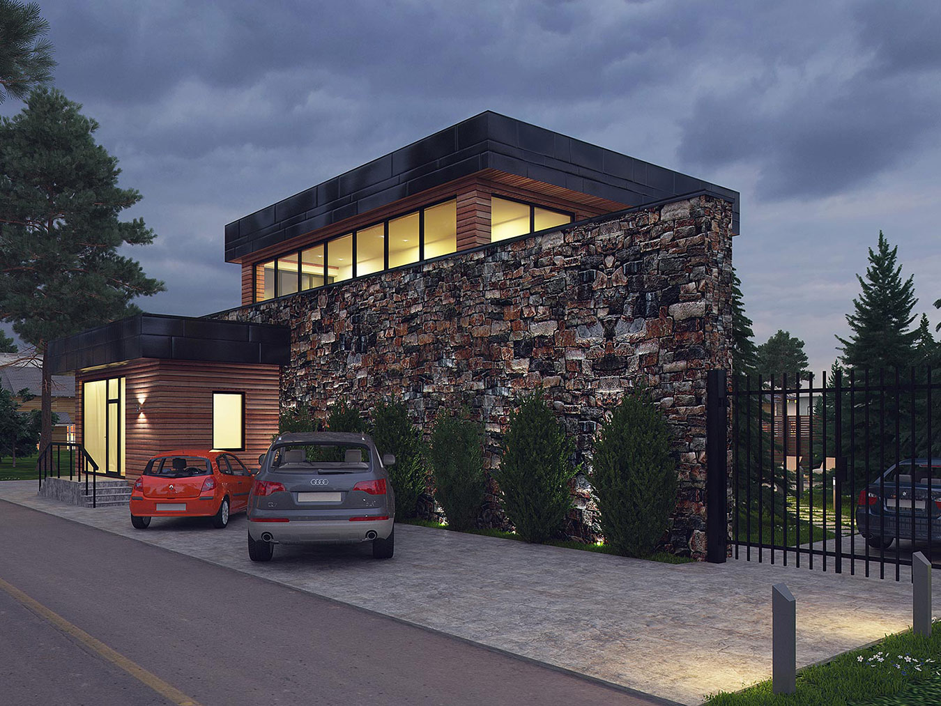 Дом-стена проектировался для большой и дружной семьи. Его отличительной чертой является каменная стена, рассекающая здание в продольном направлении. Она делит дом на две несимметричные части и недвусмысленно дает понять, что все семейные тайны находятся под надежной защитой. Такое архитектурное решение создает в общественной зоне две дополнительные части: внешнюю, куда входят прихожая и гардеробная, и внутреннюю, включающую в себя кухню, столовую и гостиную.