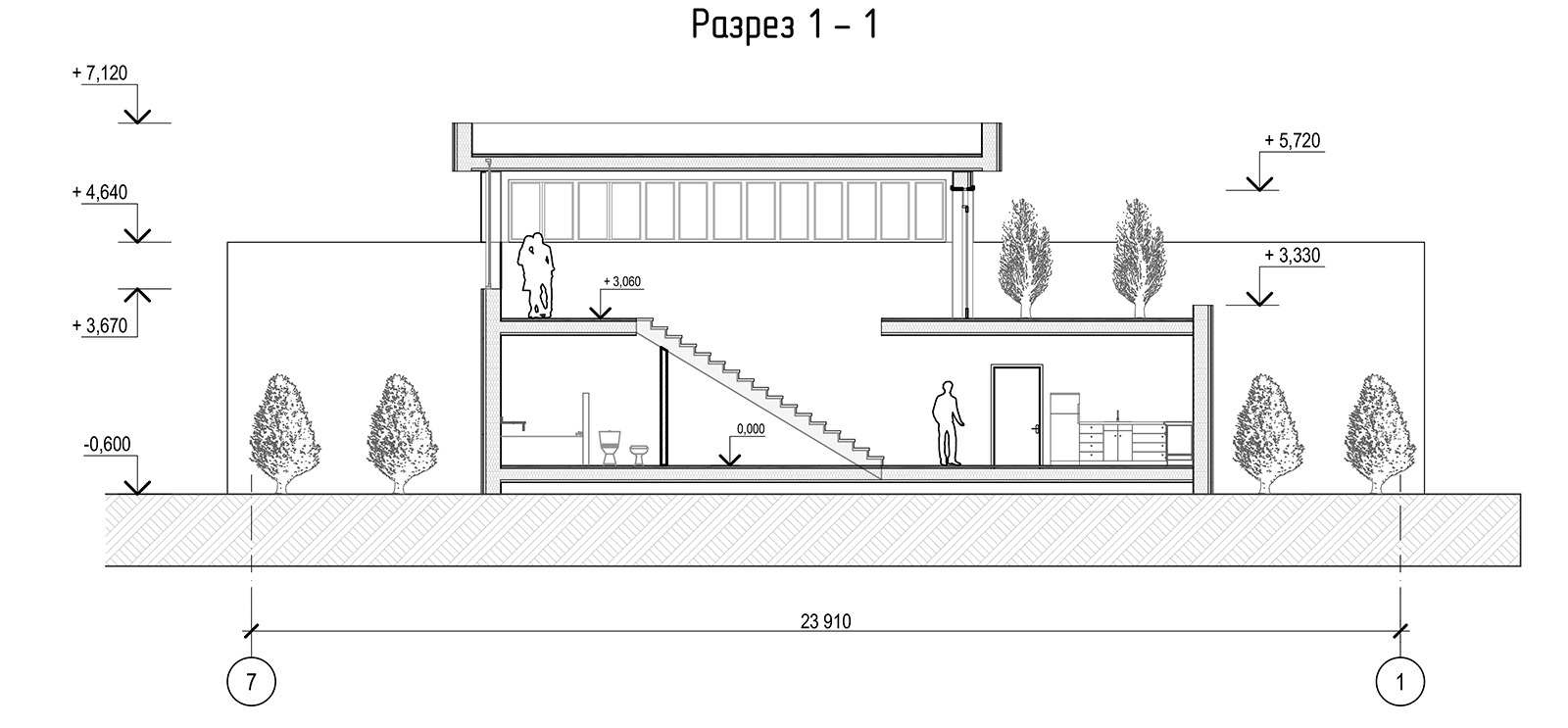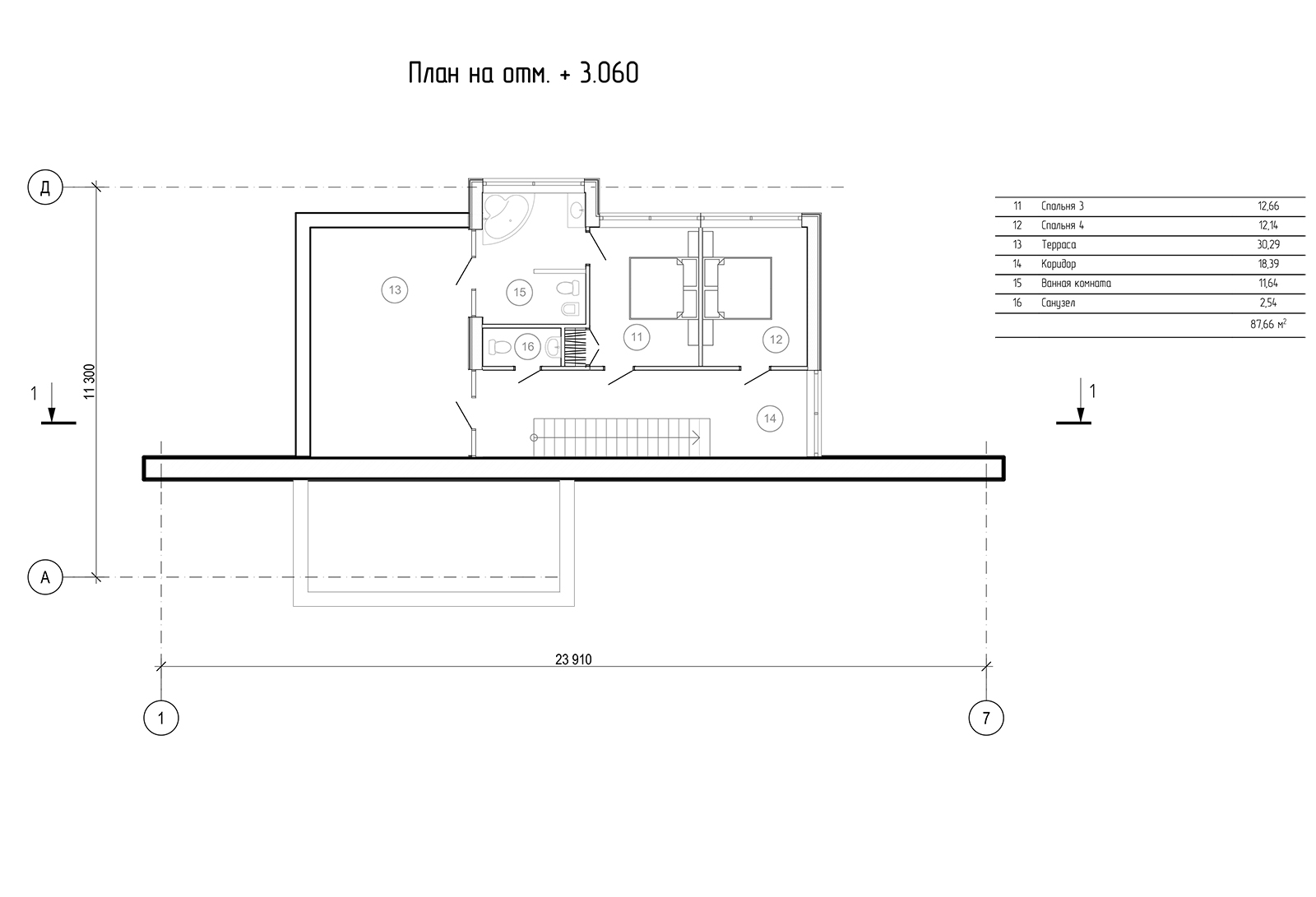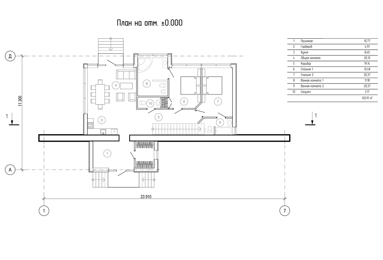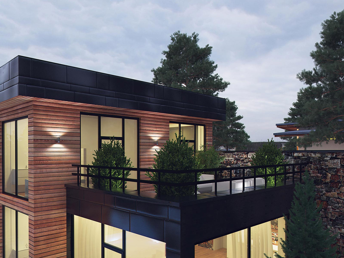 На уровне второго этажа над гостиной запроектирована терраса с переносными элементами озеленения.