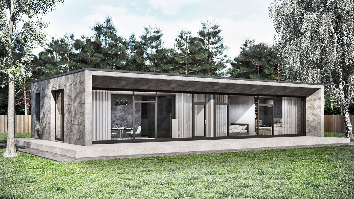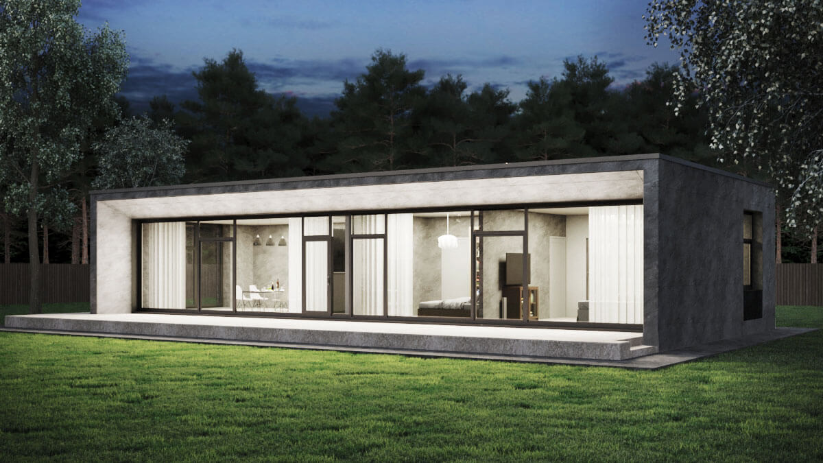 Одноэтажный дом с плоской кровлей спроектирован для участка вблизи г. Чехова.