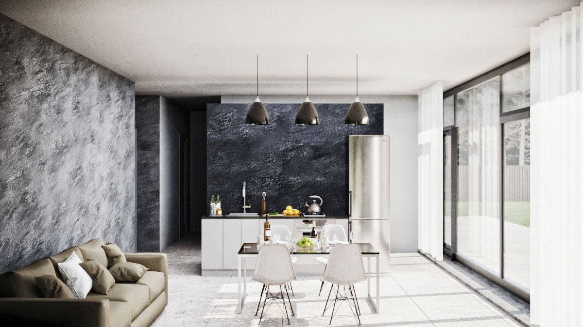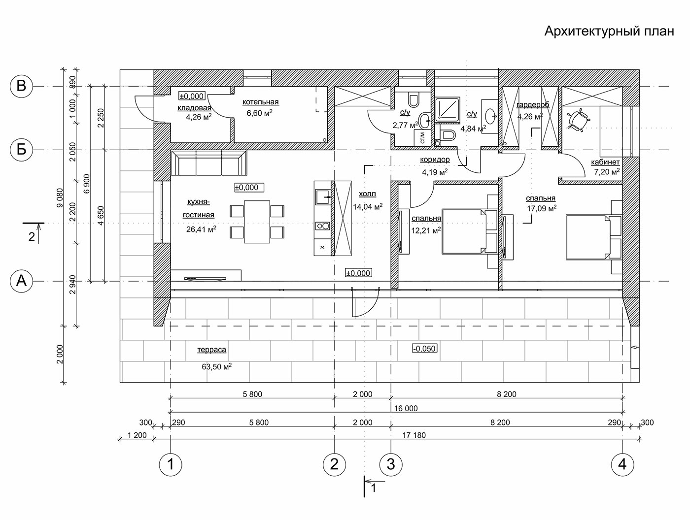 Внутри размещены кухня-гостиная, 2 спальни, кабинет и технические помещения.
