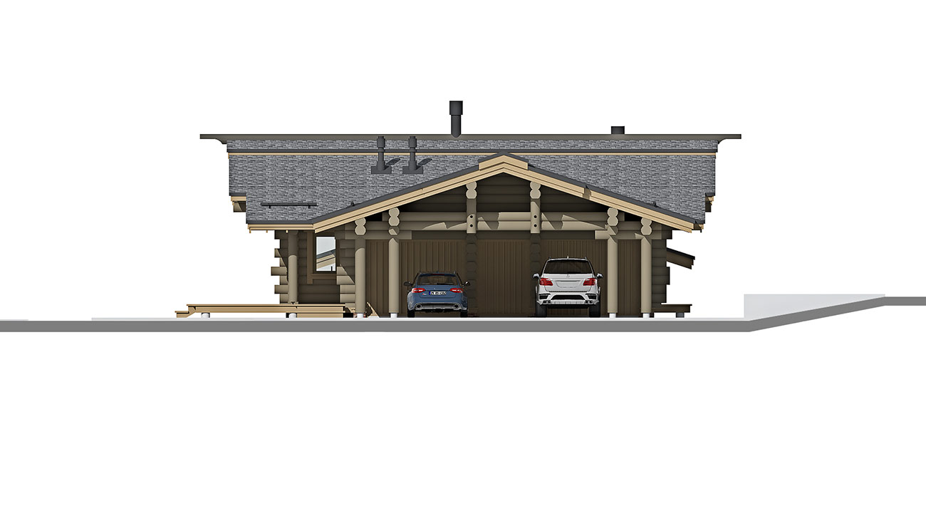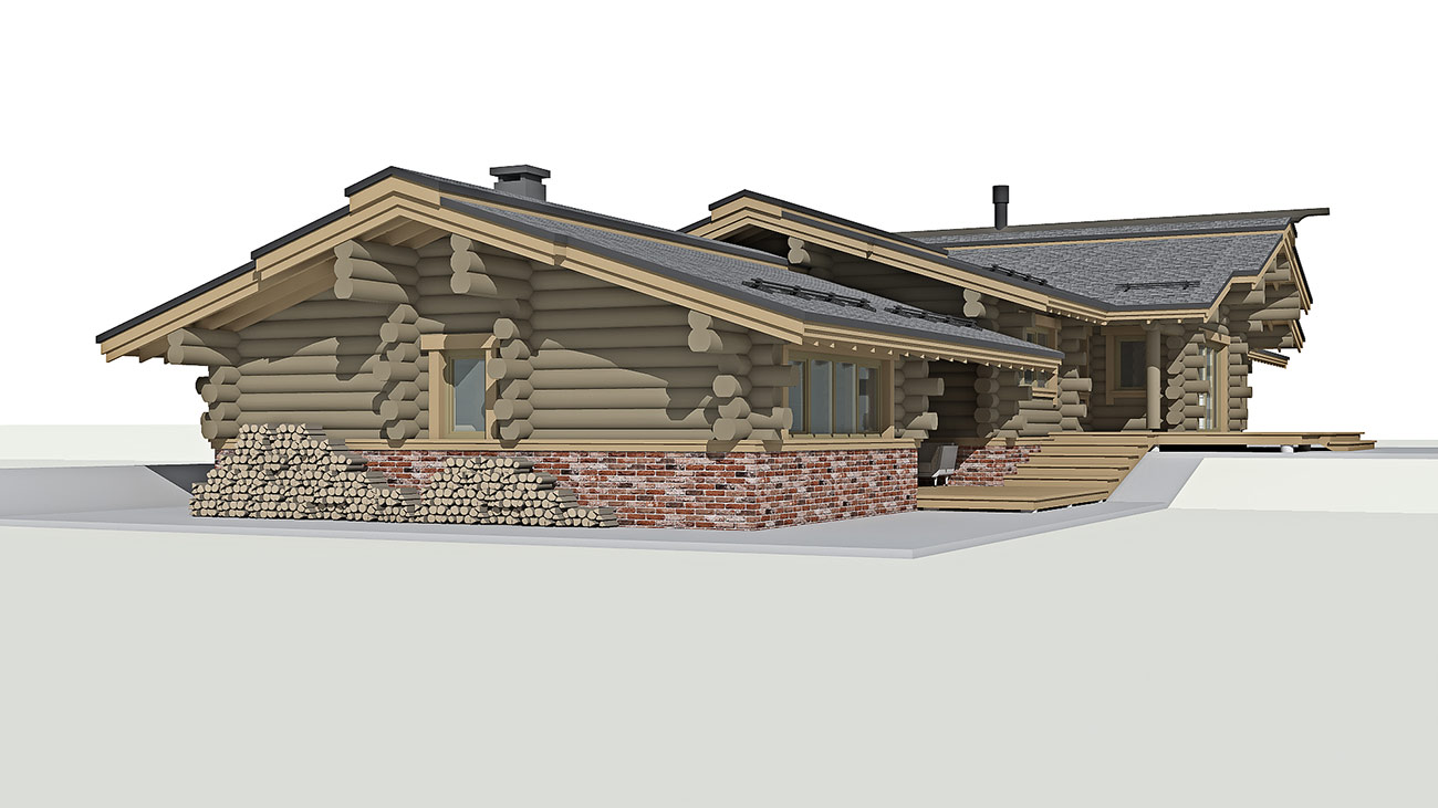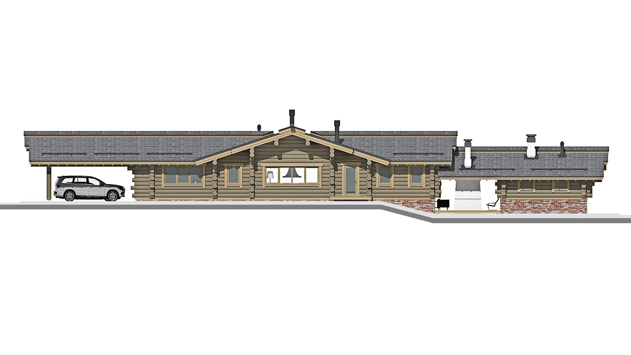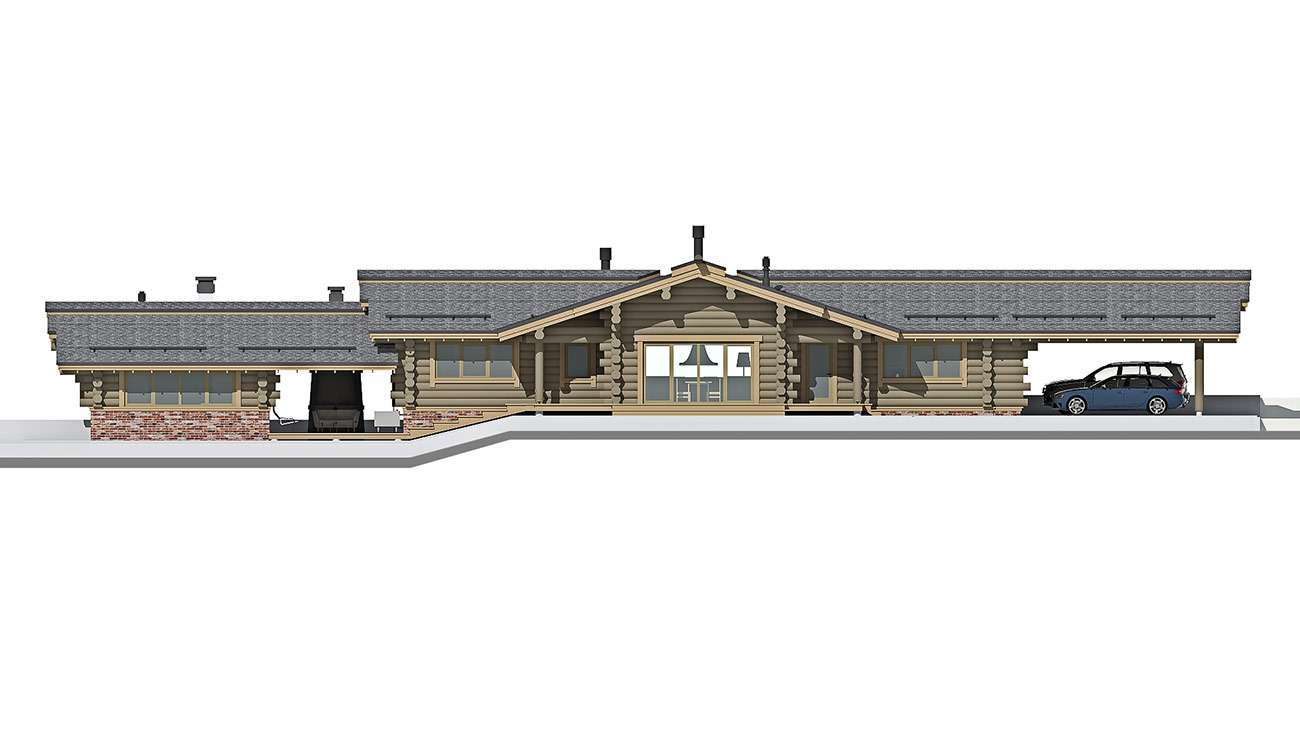Планировка дома и бани решена в одном уровне и учитывает функциональное зонирование помещений на гостевые и приватные зоны. Дом и баня объединены в один объем, с понижением уровня бани, что продиктовано рельефом участка. При доме предусмотрен крытый навес на два машино-места и закрытые стеллажи глубиной 800 мм для хранения садового инвентаря.