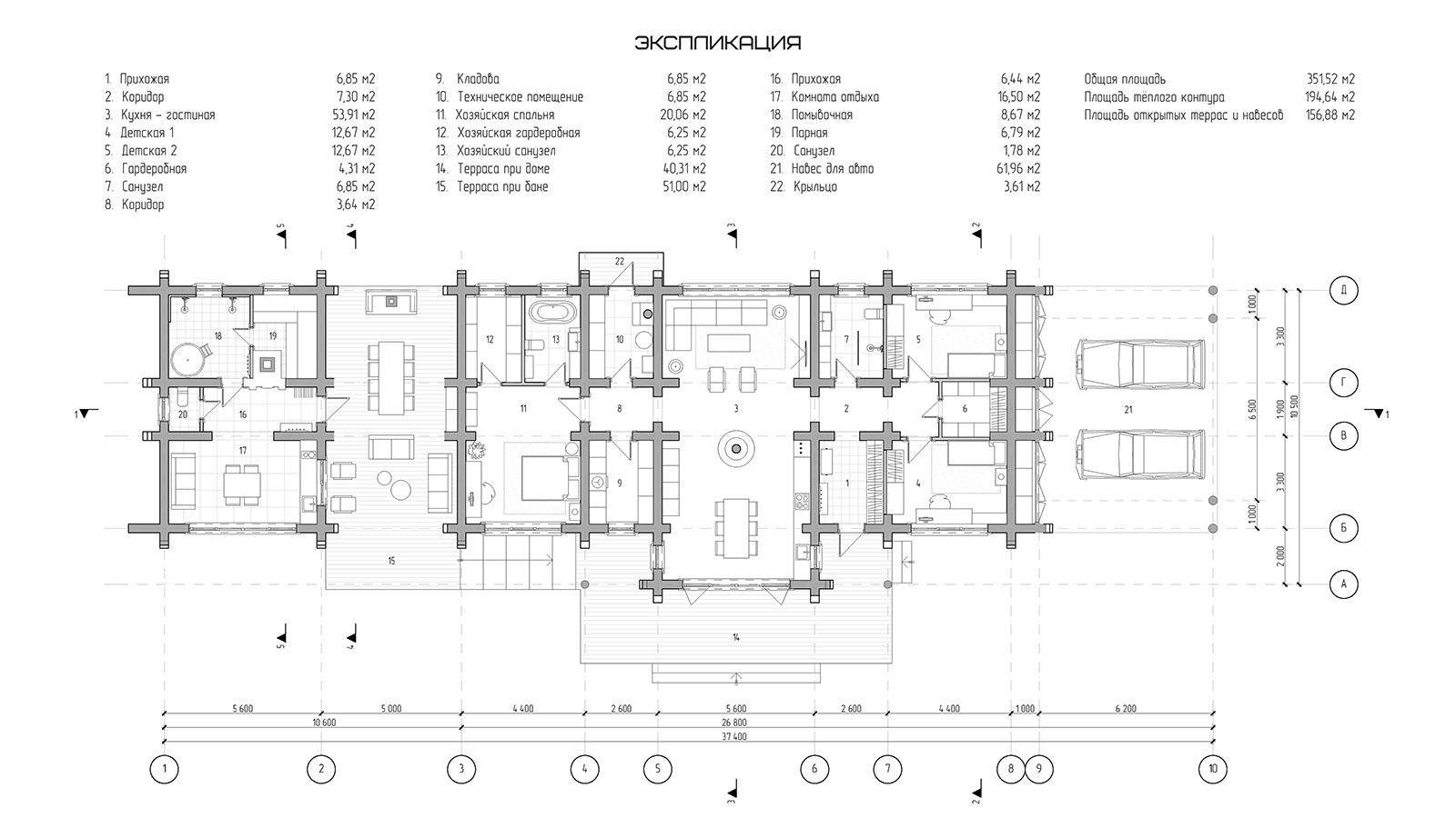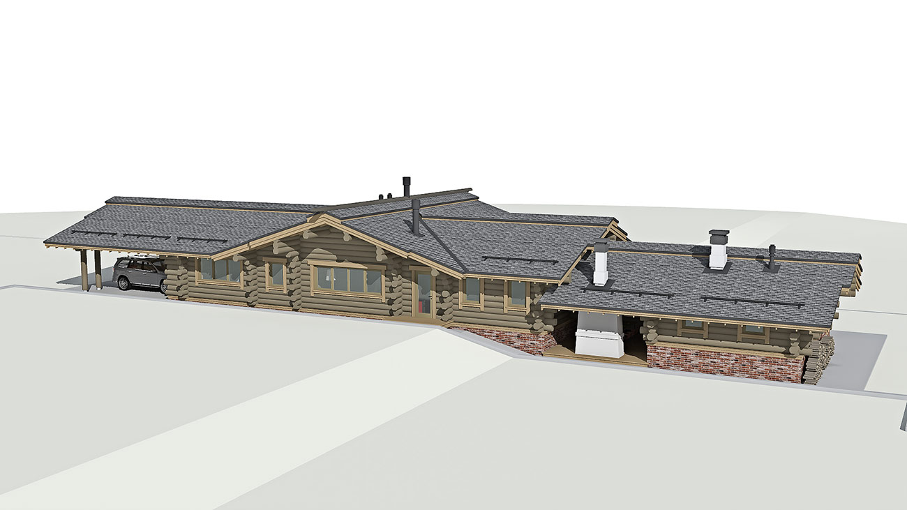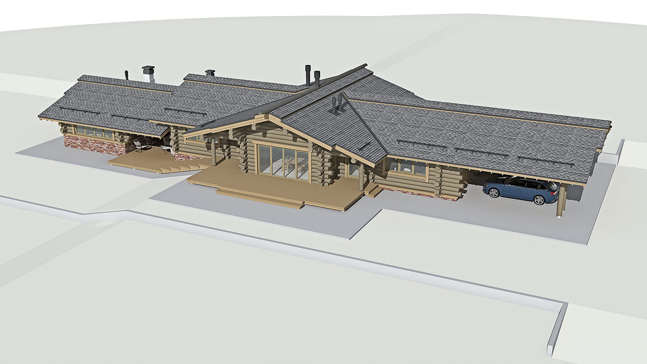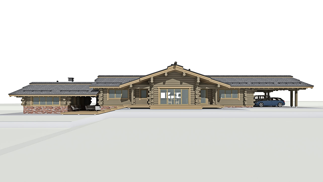 Планировка дома и бани решена в одном уровне и учитывает функциональное зонирование помещений на гостевые и приватные зоны. Дом и баня объединены в один объем, с понижением уровня бани, что продиктовано рельефом участка. При доме предусмотрен крытый навес на два машино-места и закрытые стеллажи глубиной 800 мм для хранения садового инвентаря.