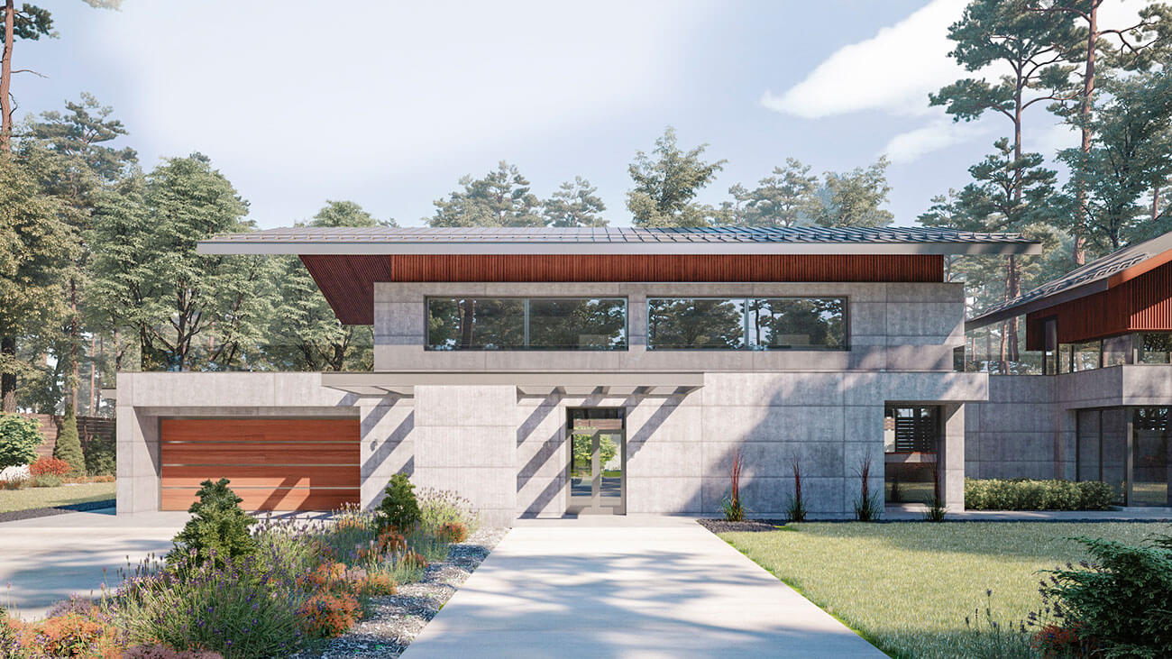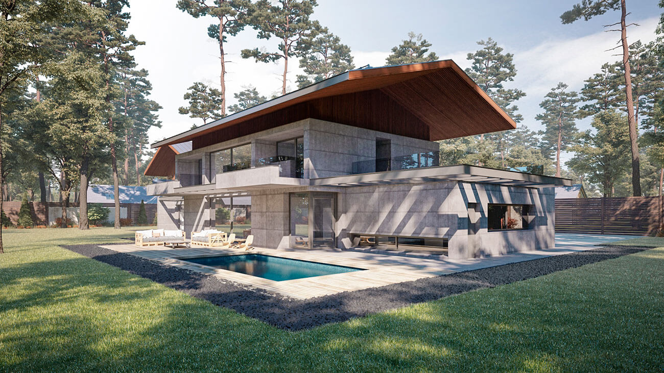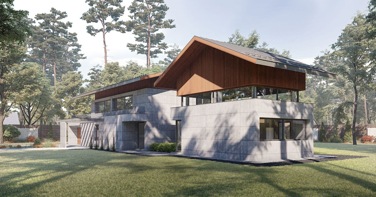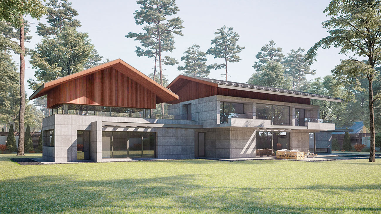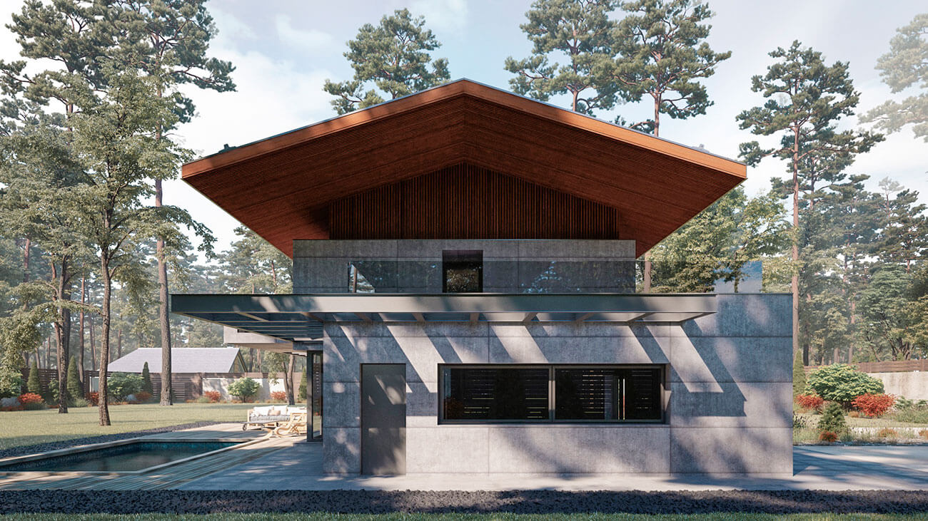 В отделке использованы два основных материала, отвечающие концепции «твердый» (защищающий, основательный) и «мягкий» (теплый, домашний). Твердый — фиброцементные плиты с ярко выраженной фактурой бетона. Весь первый этаж и часть второго облицованы ими. Мягкий — дерево, планка из термодревесины, примененная в облицовке 2-го этажа домашнего кинозала, подшивке свесов кровли и карнизной отбивке основного блока.