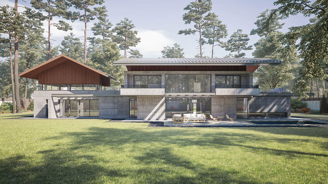Дом расположен в пригородной зоне в окружении хвойного леса. Объем дома разделен на два блока, основной блок и приватный (спальня хозяев).