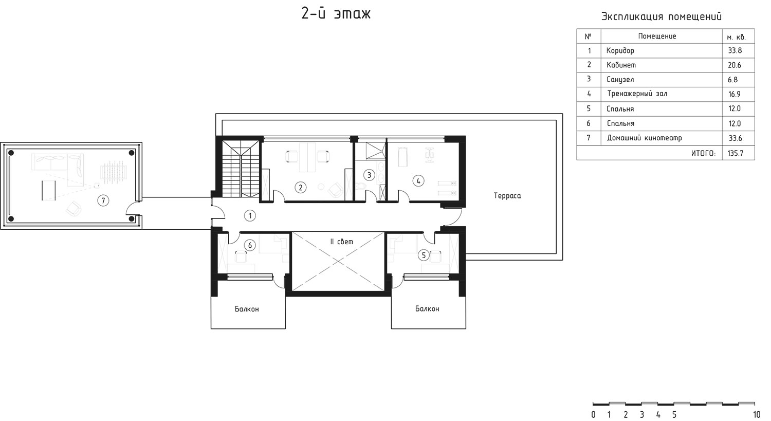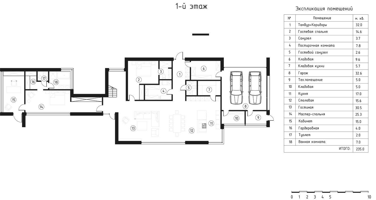 В состав помещений основного блока входят гостиная, гостевая спальня, кухня-столовая с сопутствующими помещениями, две детские, два санузла, также спортзал и кинозал.