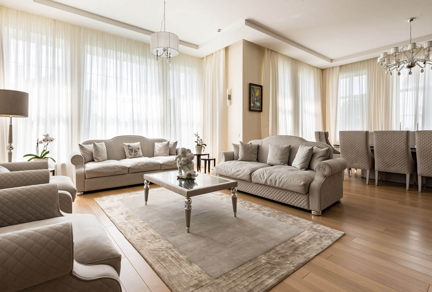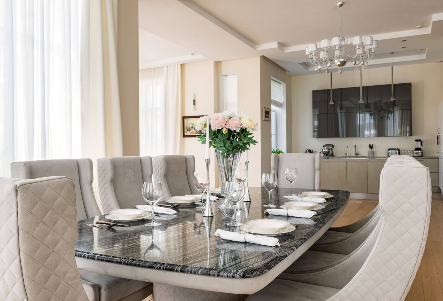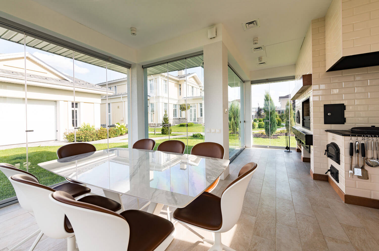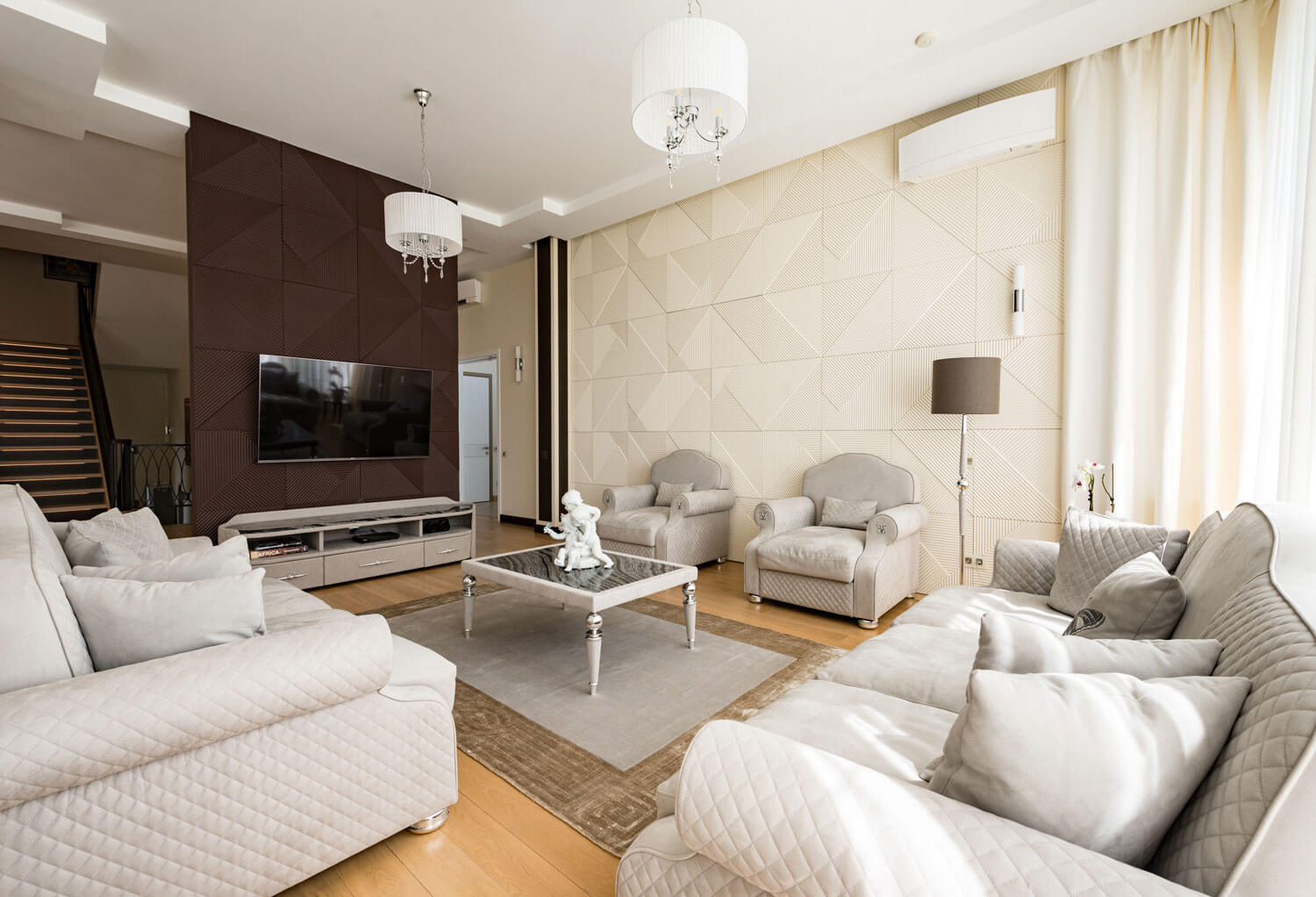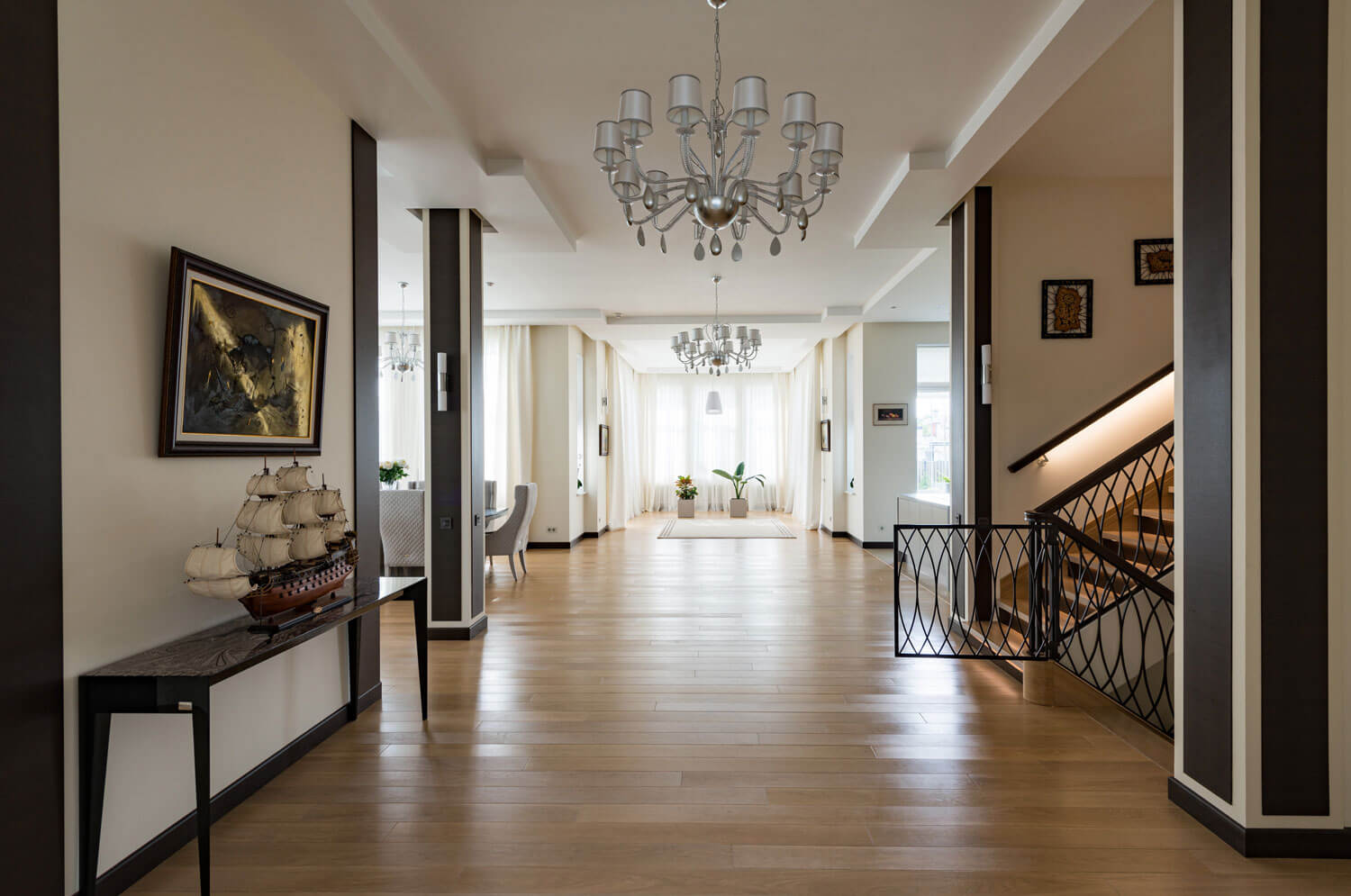 Умный дом: В проекте предусмотрена система на основе оборудования Crestron. На сенсорные панели и выключатели выведены системы для управления: видеонаблюдение, домофония, пассивная безопасность от протечки воды, управление окнами (открыть и закрыть) и управление светом, шторами и климат-контролем, мультимедиа, различные сценарные работы: «День», «Ночь», «Я ушел», «Я пришел», «Сон» и «Утро», «Семейный ужин» и «Вечеринка», «Времена года» и т.д.