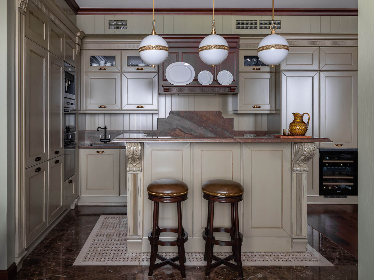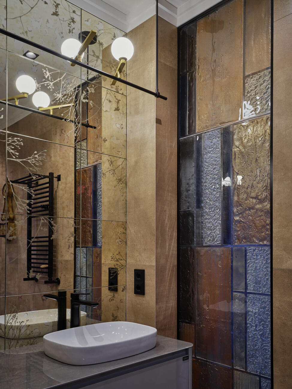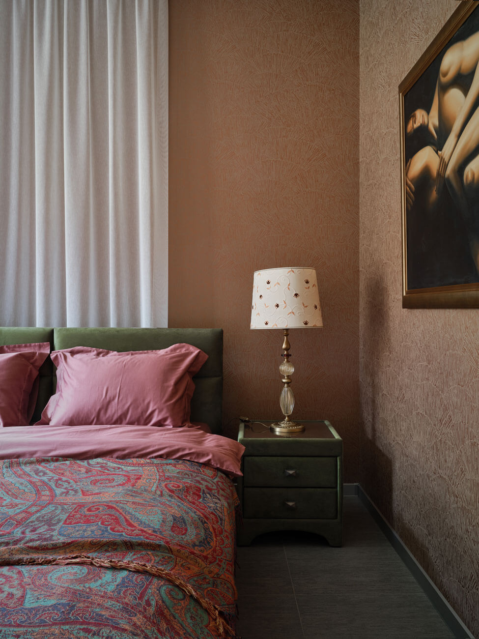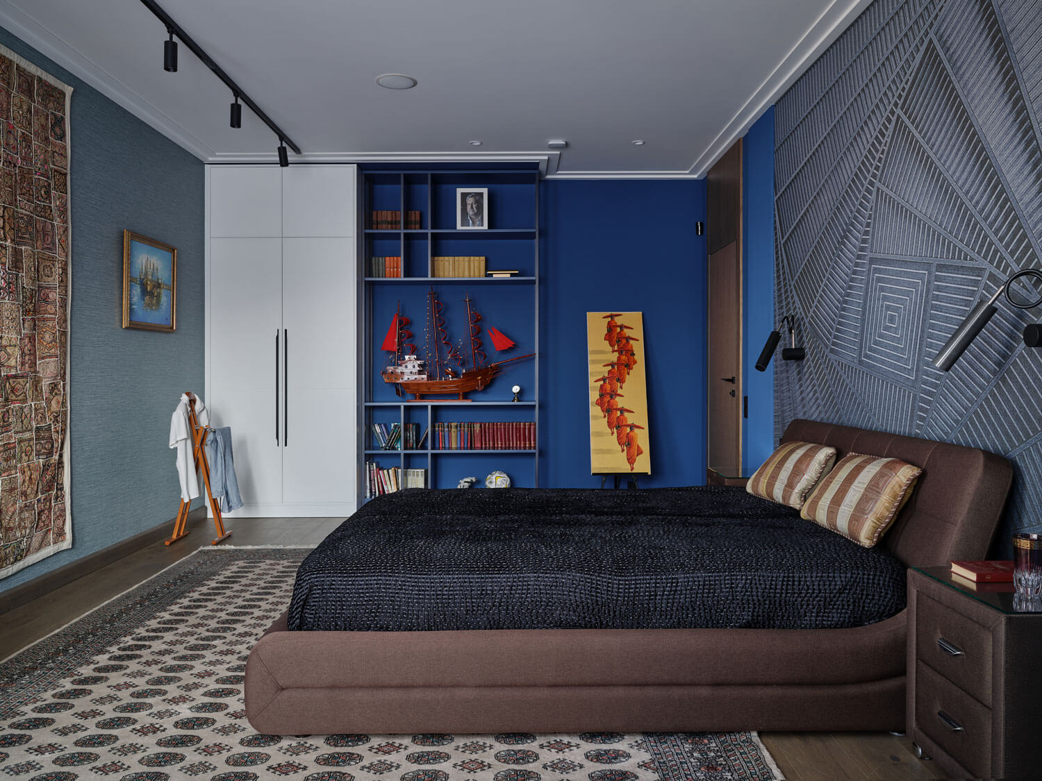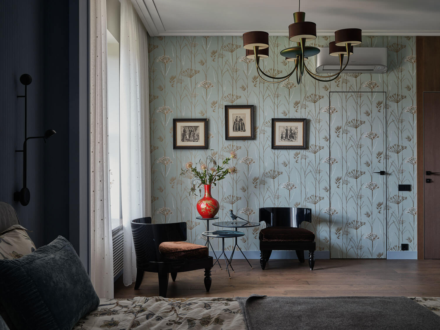 И такое можно сказать почти о любом предмете искусства в этом доме. Для предмета определялось место, затем в проекте к нему подбирался максимально подходящий фон в сложных оттенках и фактурах. Если на первом этаже, который отведен под общие зоны, точкой особого приложения сил и повышенного внимания стала кухня в комплексе с гостиной и террасой, то на втором, приватном этаже, больше всего внимания потребовали спальни хозяев, выходящие в большой нарядный холл с фасетированными зеркалами. Интересна конфигурация спален, объединенных зоной ванных комнат, собственно, с просторными помещениями санузлов, оборудованных раковинами и мебелью на вкус каждого из супругов, в центре находится большая душевая. То есть через такую двойную ванную комнату можно попасть из одной в спальни в другую, как и через холл. Комнаты хозяев при этом выдержаны в совершенно разной стилистике, отражающей их индивидуальные предпочтения. В спальне хозяина дома более темная гамма отделки, он очень любит графику Эшера. Обои-панно с геометричным рисунком как раз близки по теме сюжетам художника, их подобрали в темных цветах. Мебель в кабинетном углу его комнаты винтажная, благородных цветовых сочетаний и материалов, к ней в тон подобрана современная минималистичная кровать. Спальня хозяйки дома, напротив, собрана в легких прохладных цветах.