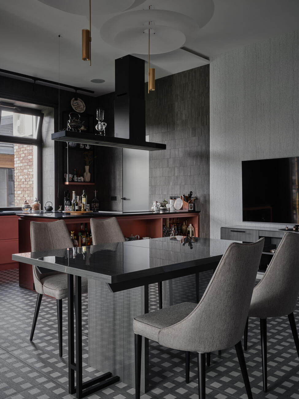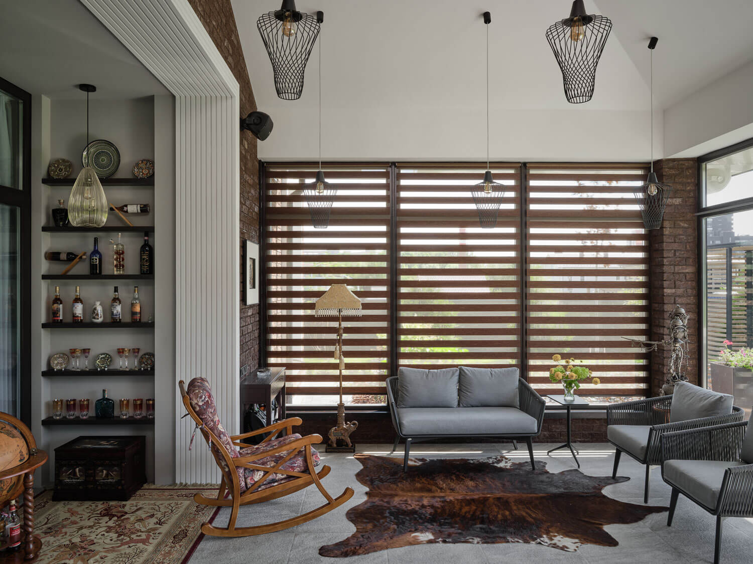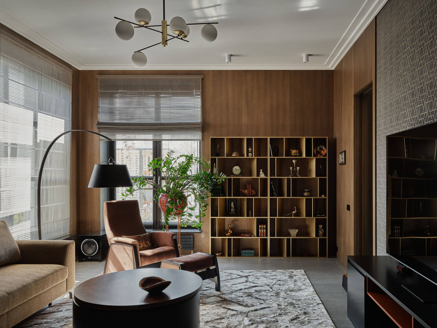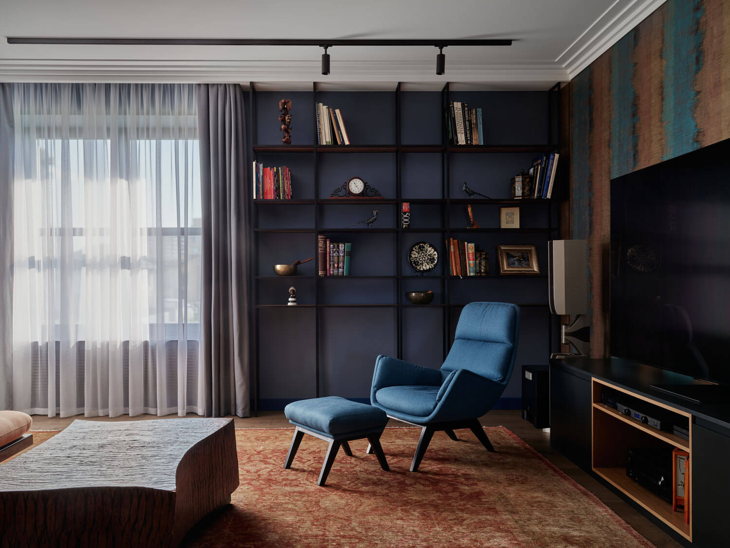 Вторую часть верхнего этажа занимает просторная комната, которую можно принять за гостиную, по сути, это она и есть, но с функцией библиотеки и домашнего кинотеатра. Хозяин дома является экспертом в этой области в силу специфики своей работы, и, помимо коллекционирования, смотреть кино в домашних условиях еще одно важное для него хобби. И если гостиная на нижнем этаже из-за открытых проемов не может идеально «звучать», то верхний зал создавался именно для того, чтобы быть звукоизолированным и акустически выверенным.