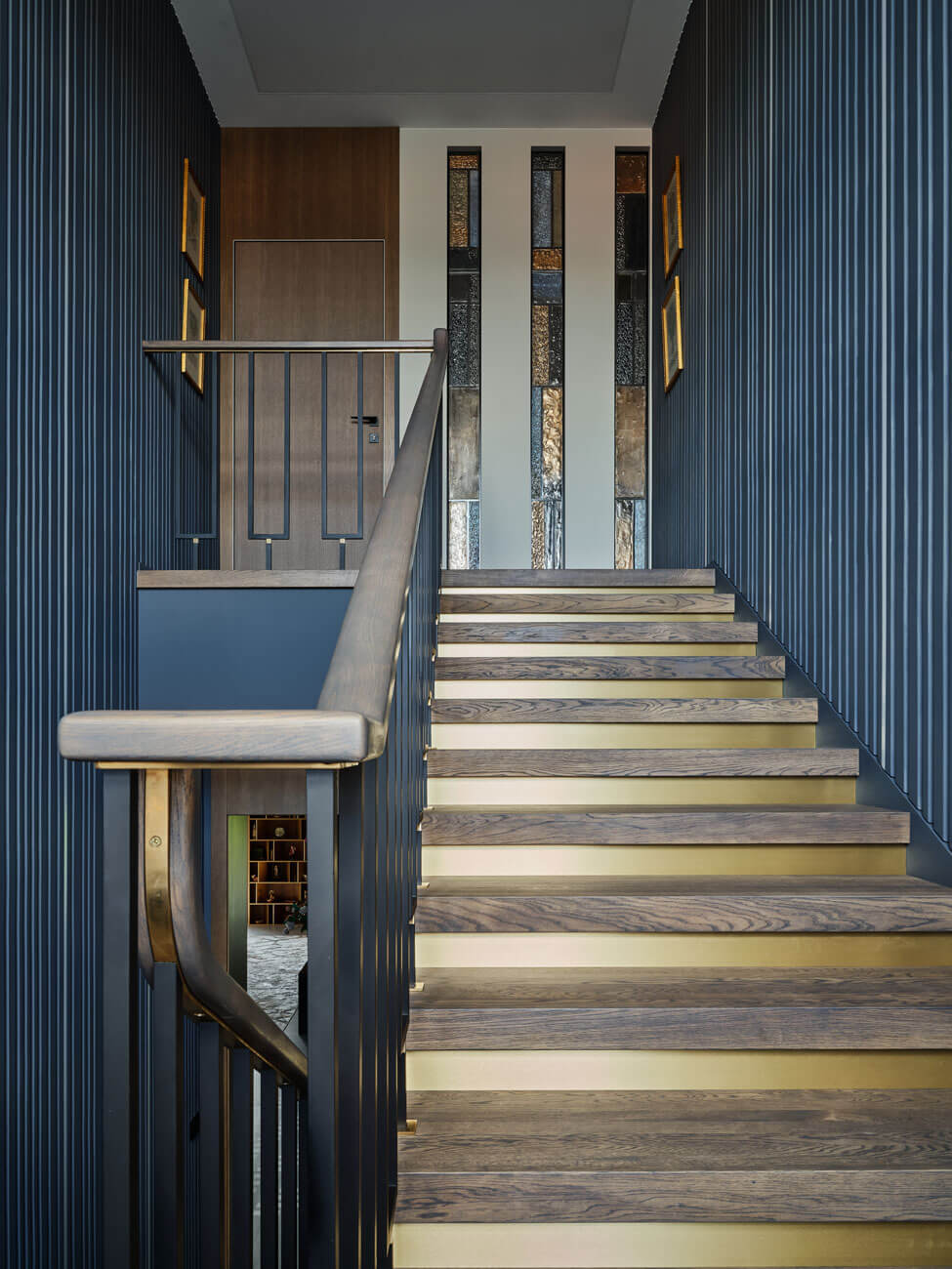 Для некоторых помещений оформление стен подобрано как отражение того искусства или коллекций, которые планировались там к развеске. Например, в зоне главной лестницы с латунными подступенками оформление стен серое с графичными полосами, оно подобрано как фон для парных картин в восточном стиле.