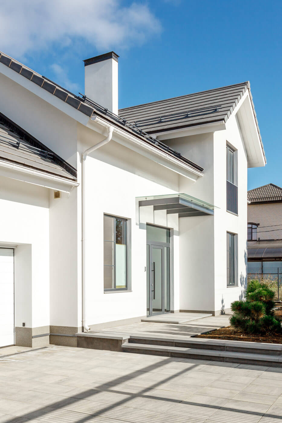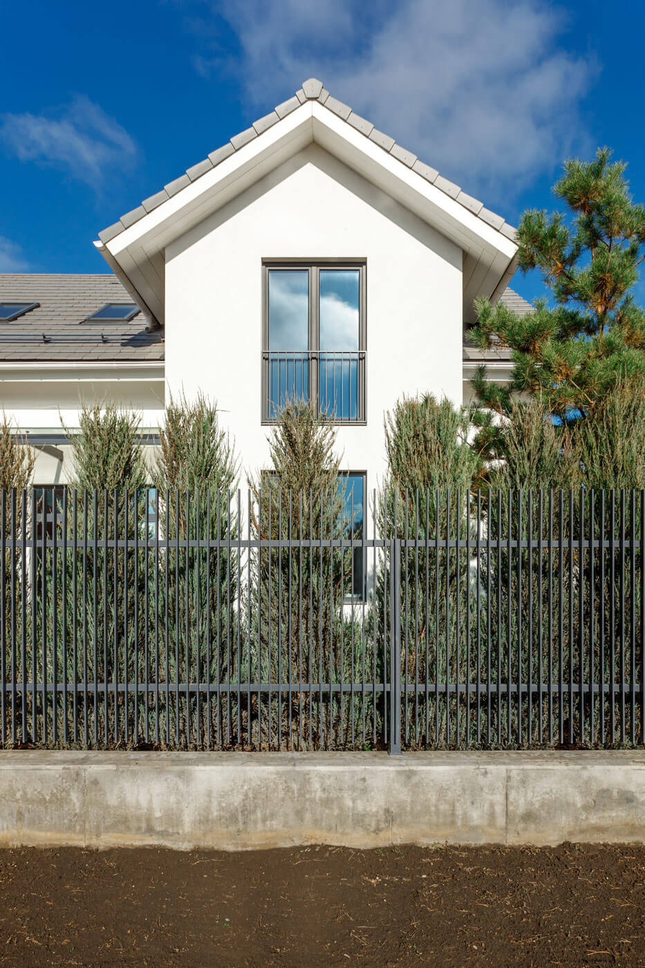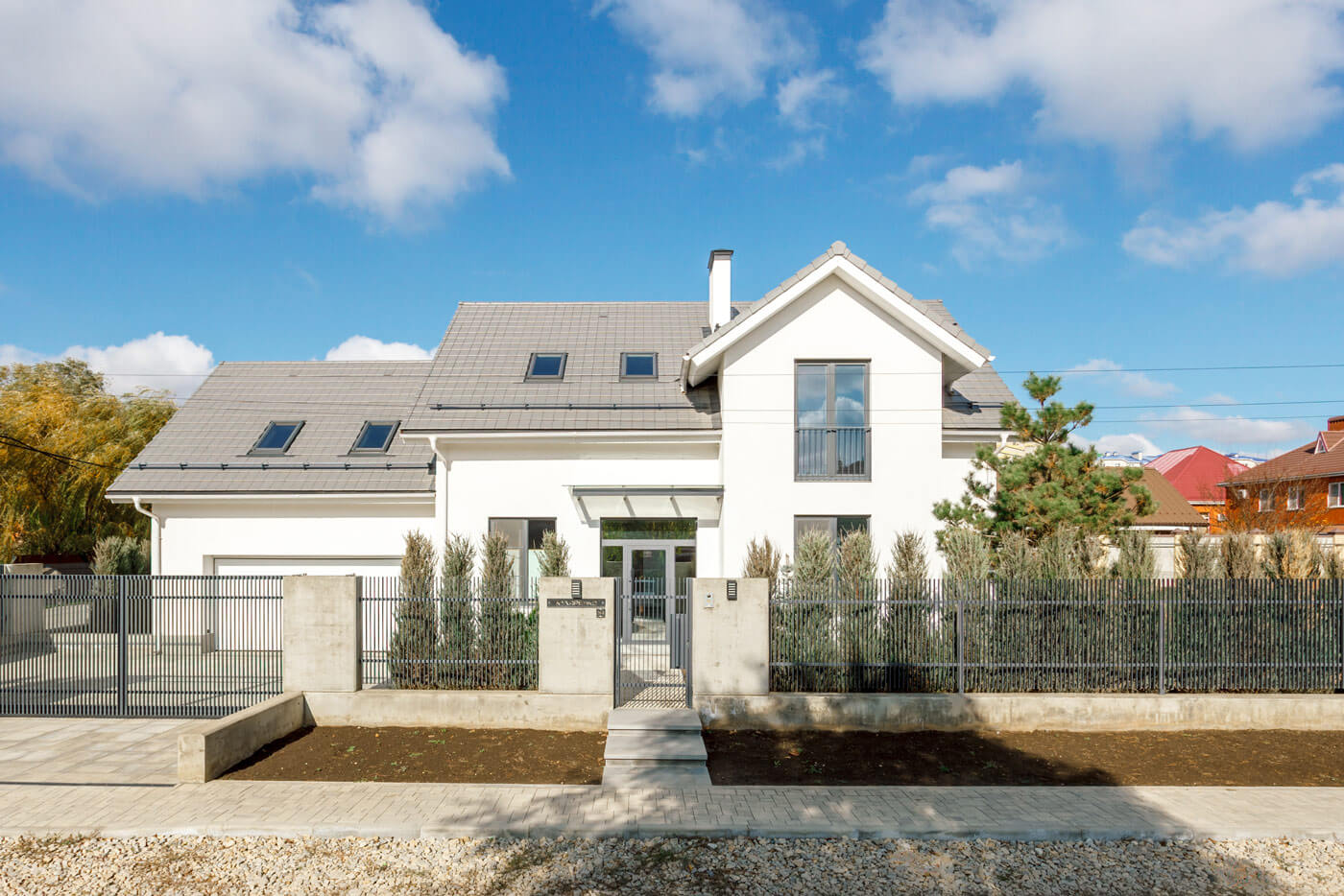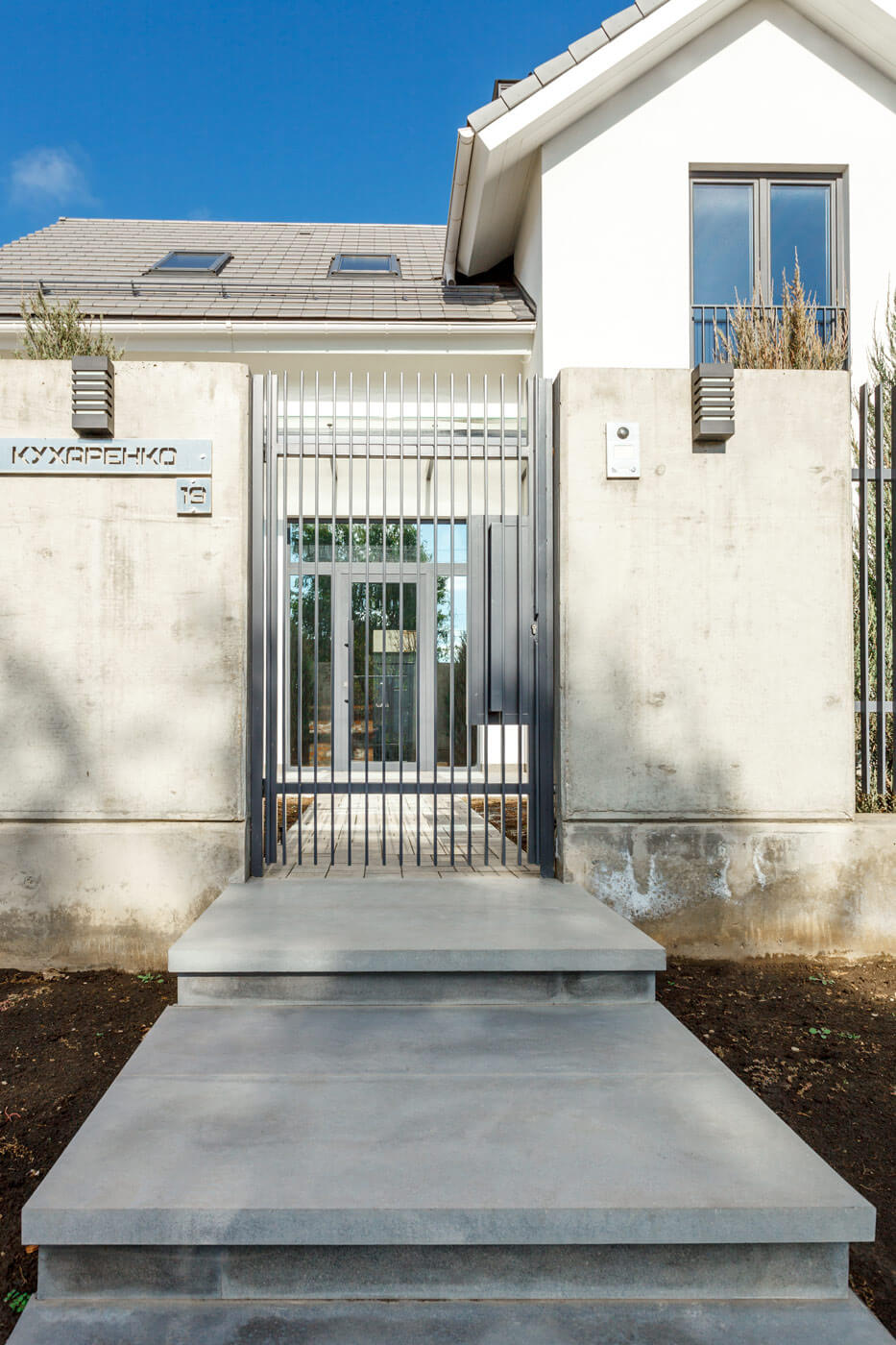 Двухэтажный дом для семьи из четырех человек в г. Краснодар расположен на участке пять соток. Первый этаж объединяет в себе кухню-столовую, гостиную, кабинет/гостевую, тамбур, совмещенный санузел, тех. помещение и гараж. Также на первом этаже расположен дровяной камин. Второй этаж отдан для размещения двух спален и ванной комнаты, второй гостиной и мастер-спальни с гардеробом. В наружной отделке использованы монотонные сплошные материалы: белая крупнодисперсная штукатурка, опалубочный бетон, базальтовые плиты. Простые объёмы, графичное обрамление участка выделяют объект на фоне желто-красной квартальной застройки.