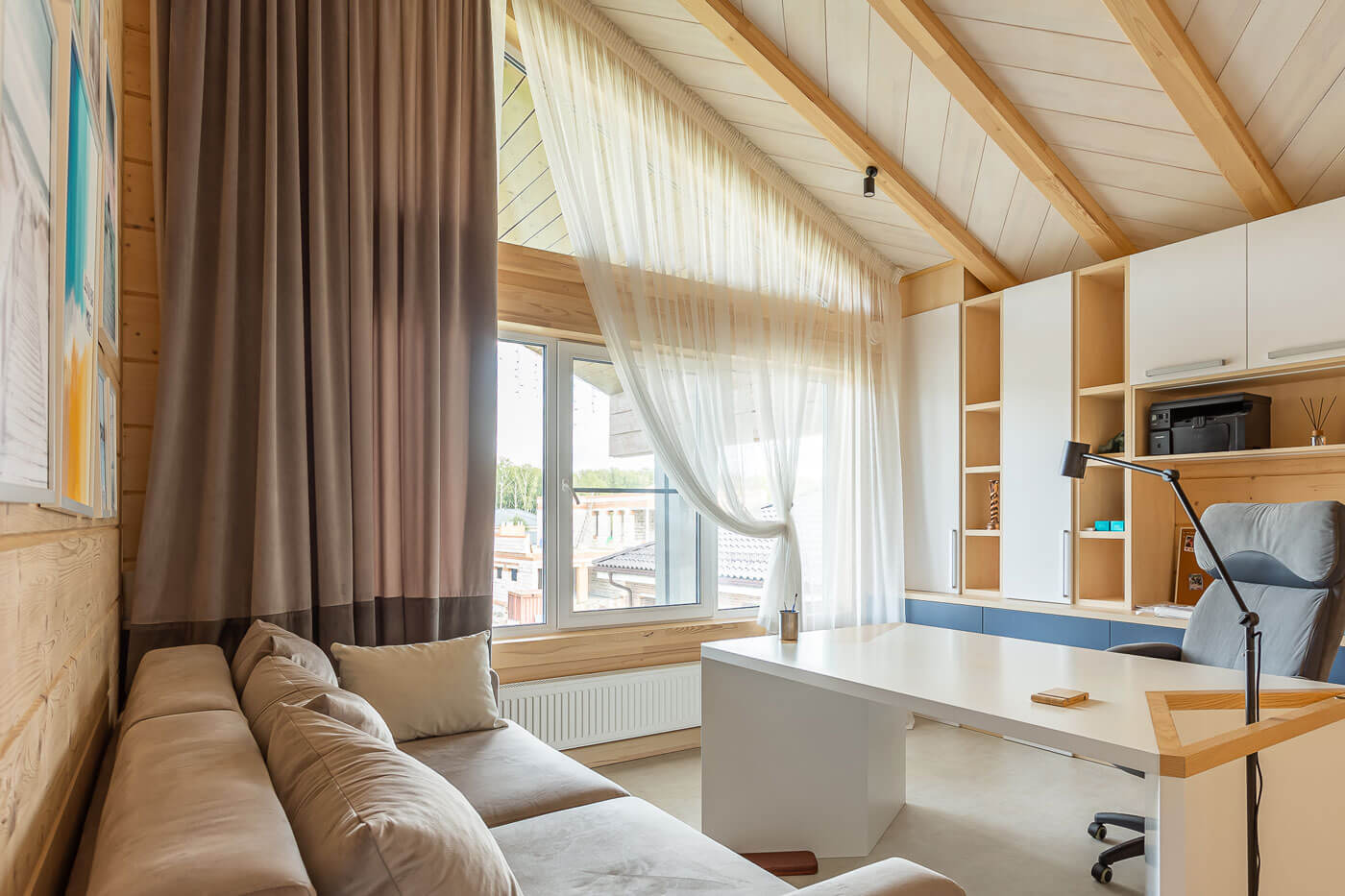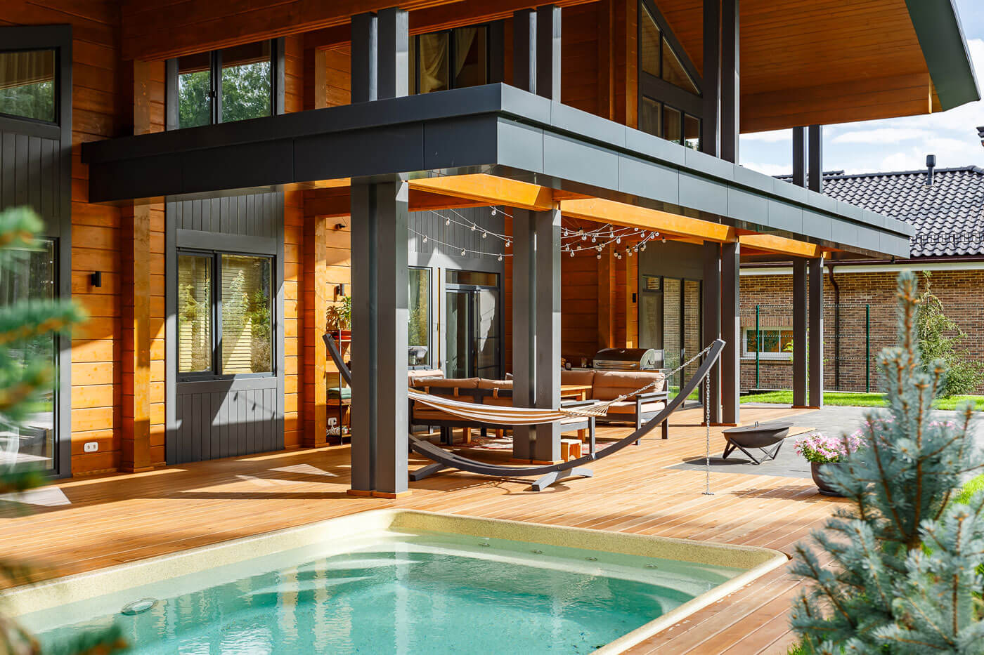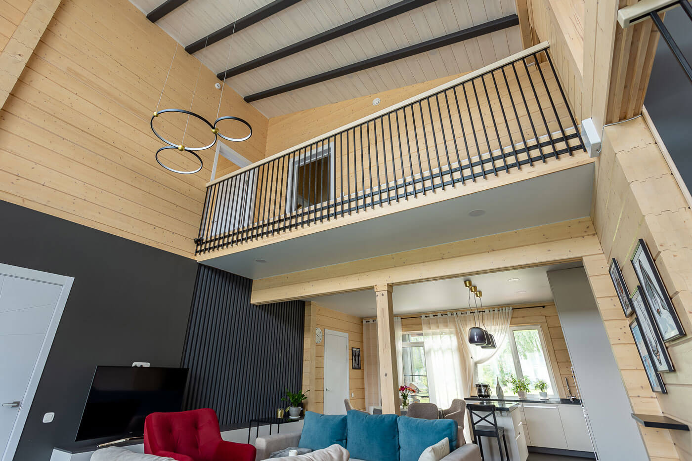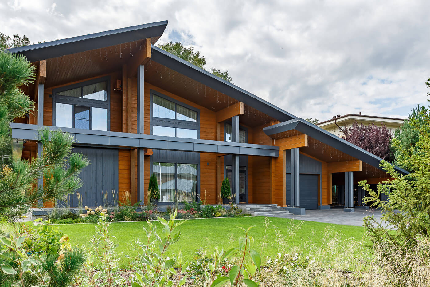 Особую выразительность внешнему облику дома придают большие свесы крыши, массивные скошенные лобовые доски из алюмокомпозитных панелей, и декоративный межэтажный пояс из тех же панелей. Для монтажа стен использован клееный брус высотой 250 мм. Покрытие кровли – гибкая черепица «Шинглас».