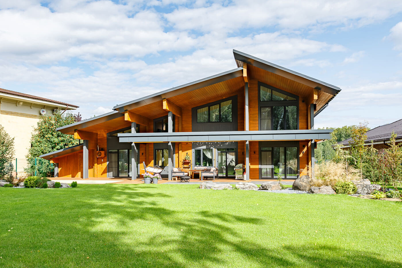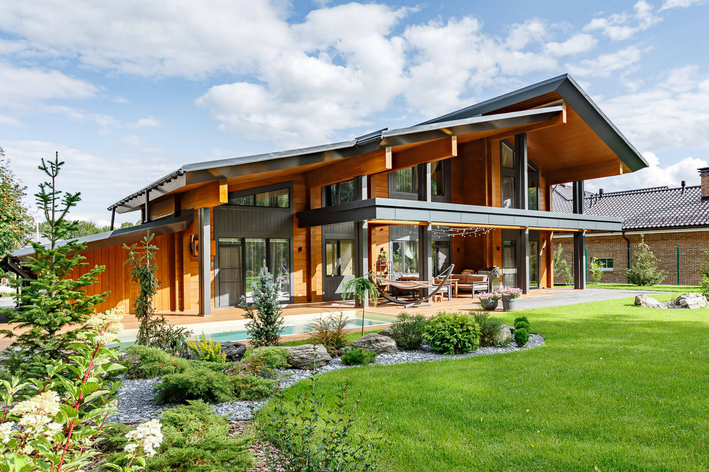 Дом расположен в клубном поселке, поэтому хозяйка отказалась от устройства забора со стороны дороги, и это придало дому и участку особый дух открытости миру и ощущение простора.