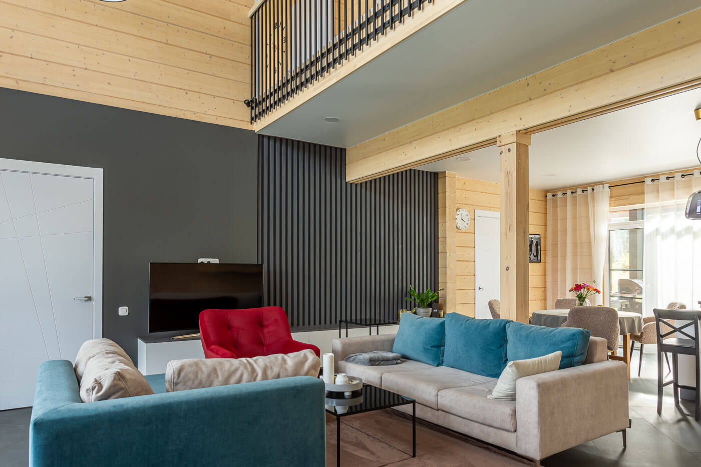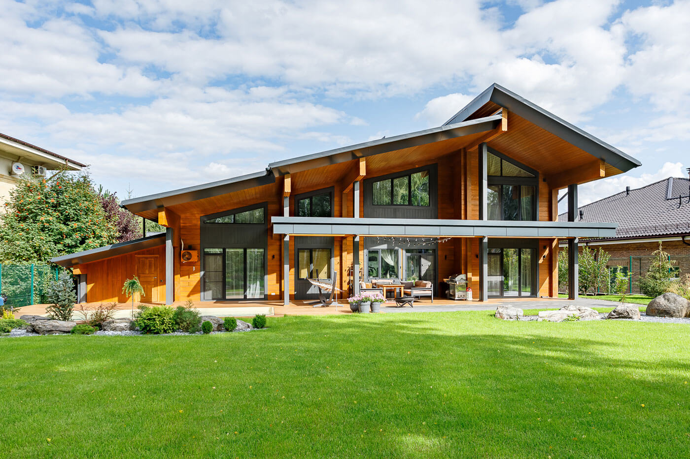 Хозяйка дома - энергичный, целеустремленный и организованный человек, и строительство дома от фундамента до заселения заняло менее года: в июне 2021 года начались фундаментные работы, в мае 2022 года хозяйка отметила новоселье. А к концу лета 2022 года завершились ландшафтные работы на участке.