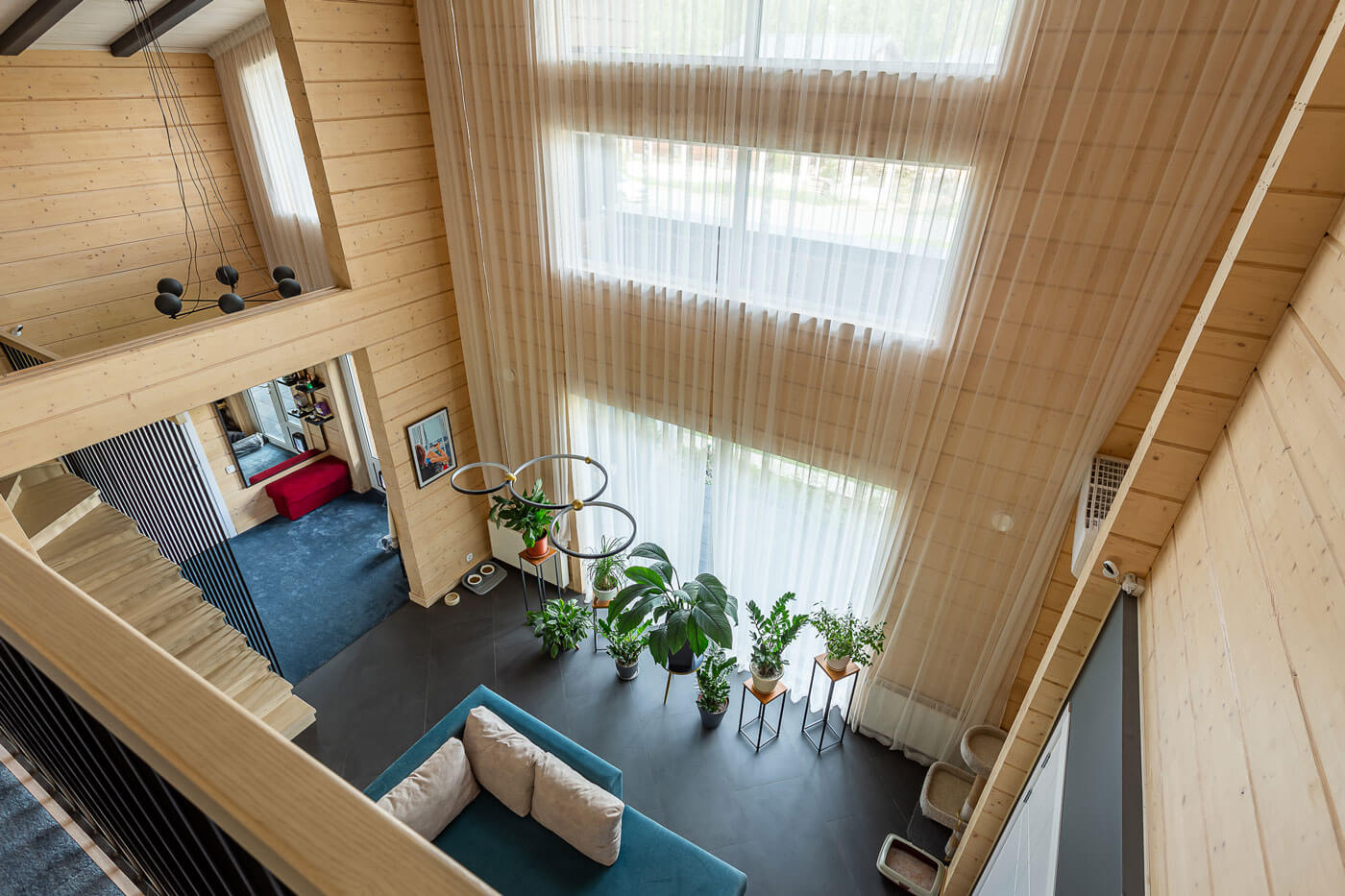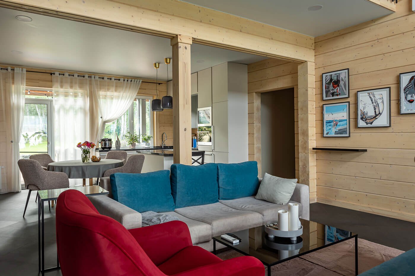 Этот дом из клееного бруса - не первый дом заказчицы. Прежний дом, каменный, площадью более 500 м2, расположен на соседнем участке. Но дети взрослеют и в какой-то момент приходит понимание, что такие площади больше не нужны. Да и душа просила деревянный дом. В качестве материала выбрали клееный брус. Основные пожелания заказчицы к архитектуре нового дома: современные формы и большое остекление.