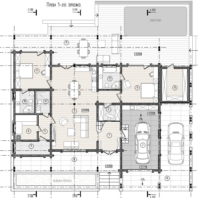 Требования к функционалу дома: комфортная кухня-гостиная с окнами в пол и вторым светом, две спальни со своими санузлами - на первом этаже; второй этаж дома - территория хозяйки, включающая спальню, просторный санузел, гардеробную и кабинет. Также в доме есть гостевой санузел, парная, постирочная, гараж и навес для автомобилей. За домом на просторной, обращенной к роще, террасе размещен бассейн.