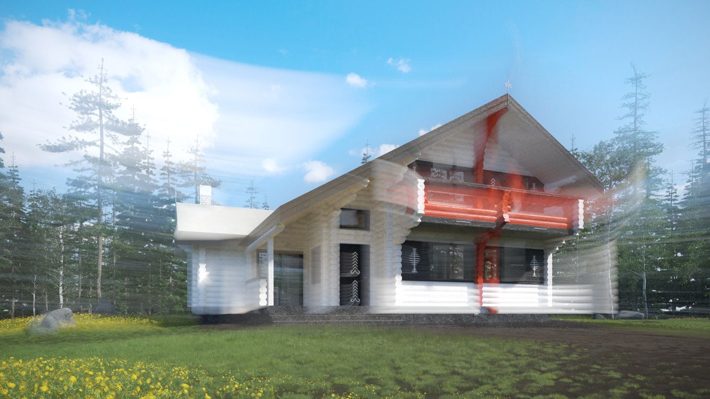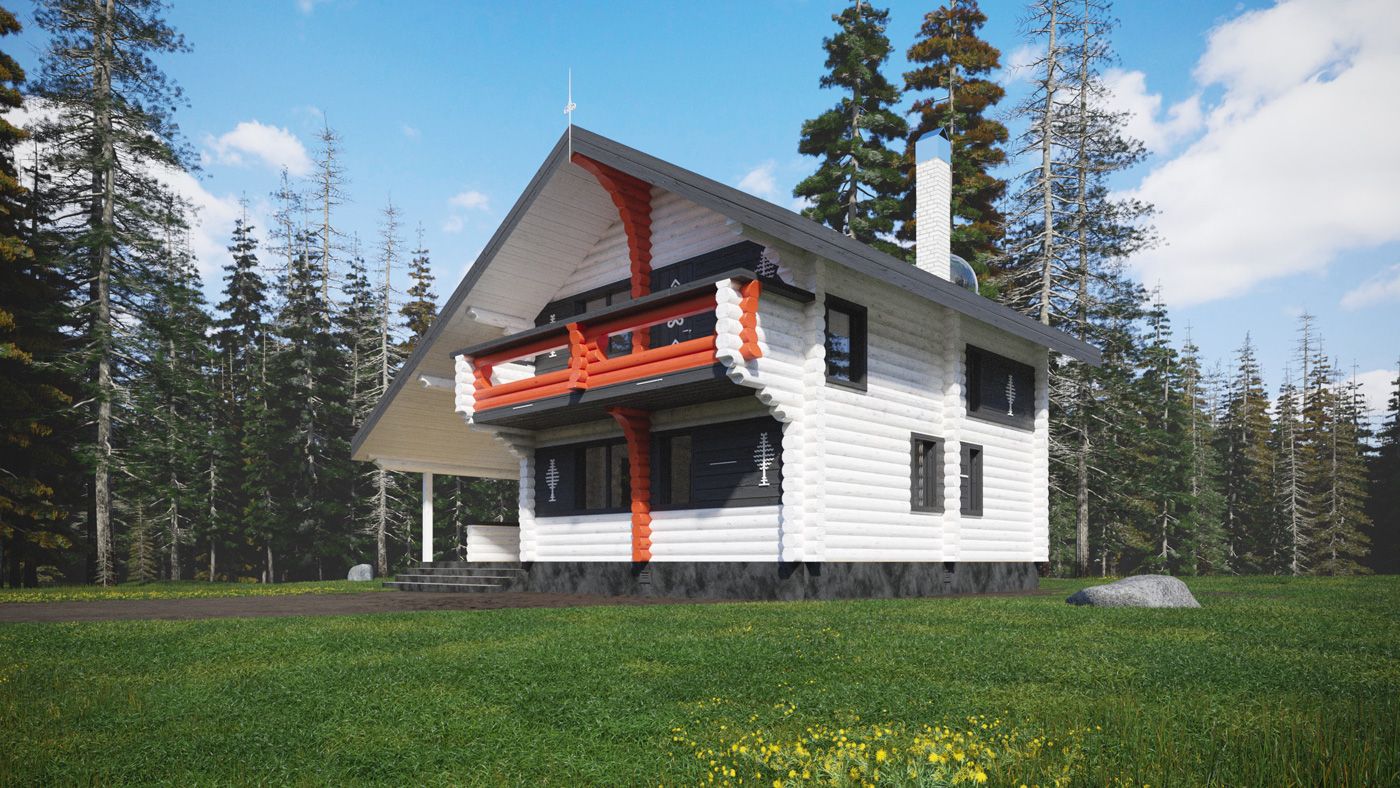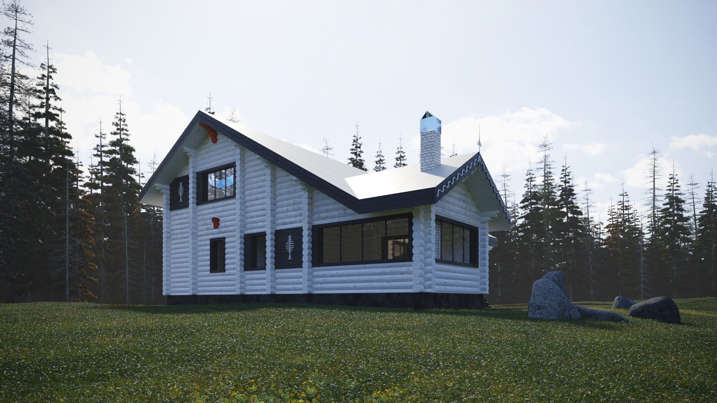 Проектируемое здание представляет собой двухэтажное строение, прямоугольной формы в плане, с жилыми и банными помещениями, верандой для барбекю. Стены дома выполнены из бревен круглого диаметра, которые обрабатываются природными пигментами, как и в мезенской росписи (гидрид оксида железа, примеси глины, охры), для получения выразительной цветовой гаммы и полной стилизации объекта. Кровля здания двускатная, с покрытием белой ПВХ-мембраной. В кровле предусмотрено мансардное окно-«полусфера».