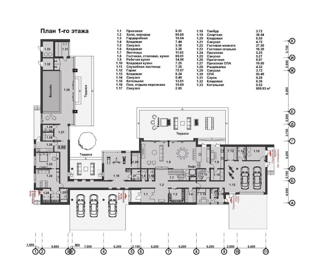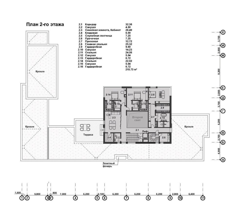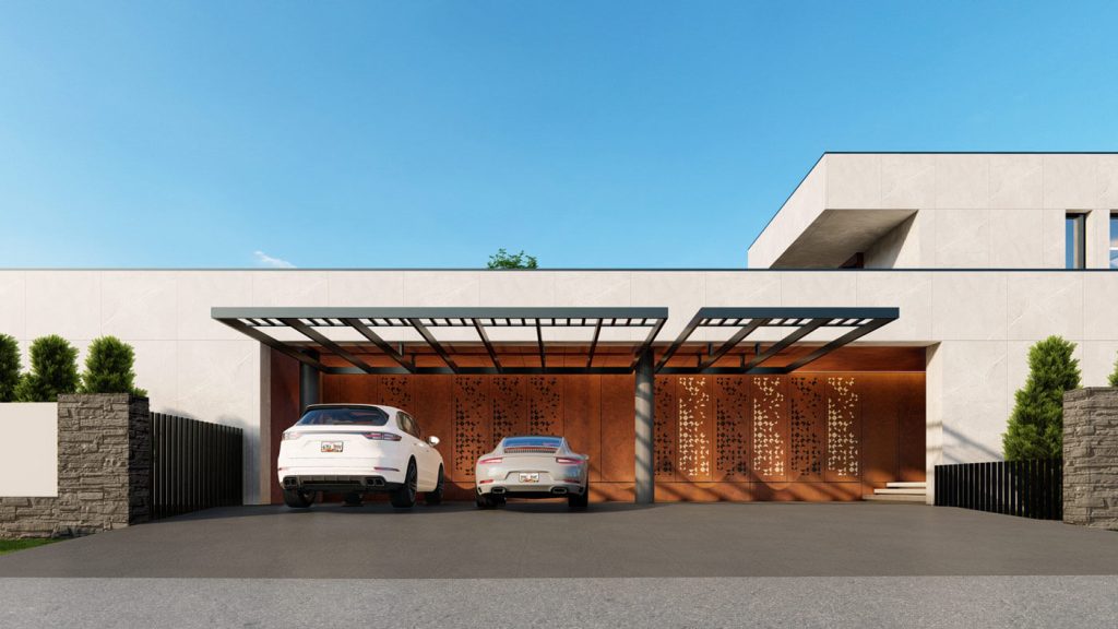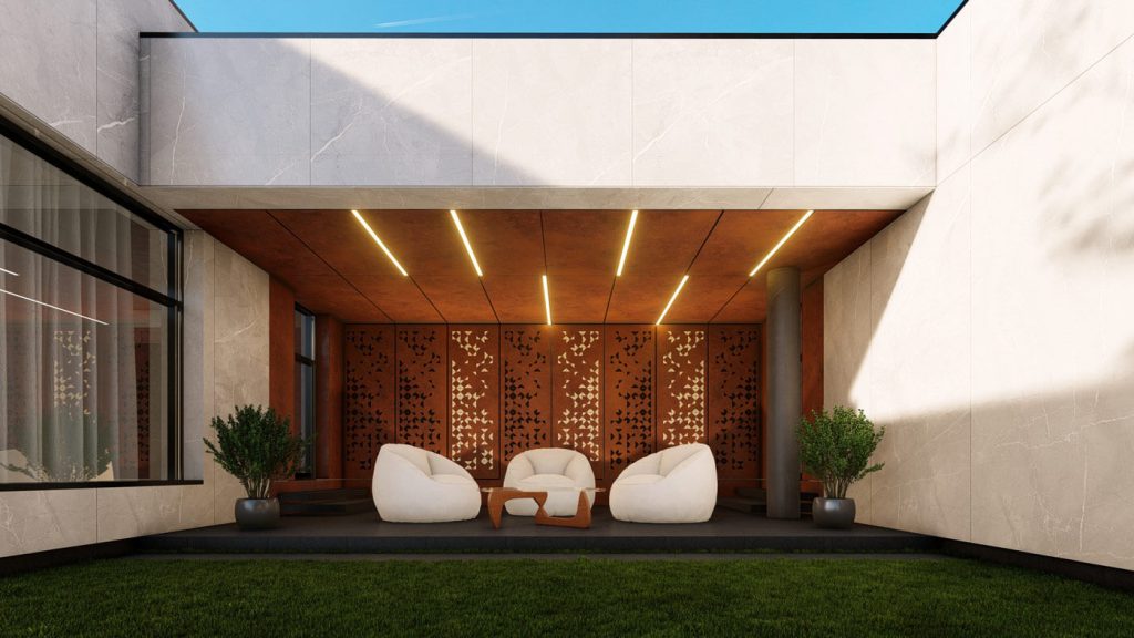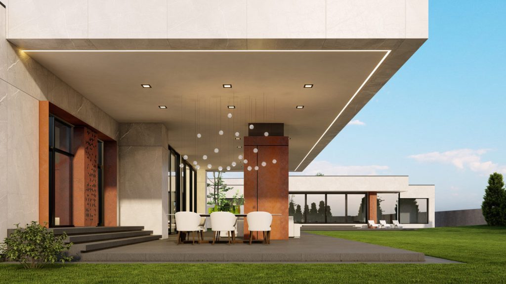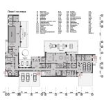 В основе планировочной структуры лежит принцип функционального зонирования, обеспечивающий удобные и независимые пути передвижения для жителей и обслуживающего персонала. Первый этаж занимает общественные зоны: гостиная, столовая и SPA, ориентированные на участок и раскрытые панорамным остеклением. Второй этаж сформирован как приватное пространство со спальнями. Верхний объём имеет значительный консольный вынос, образующий перед гостиной защищённое от осадков пространство — открытую «летнюю гостиную», служащую продолжением внутреннего пространства и связывающую дом с природным окружением. Такое решение обеспечивает комфорт, уединение и визуальную связь интерьера с ландшафтом.