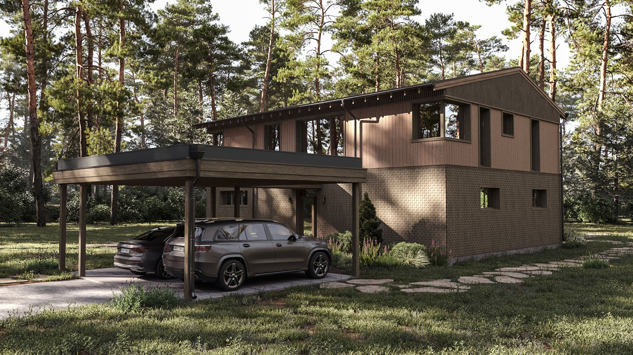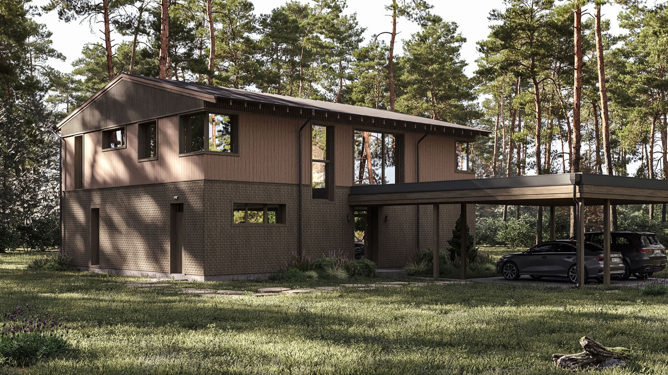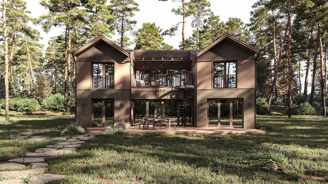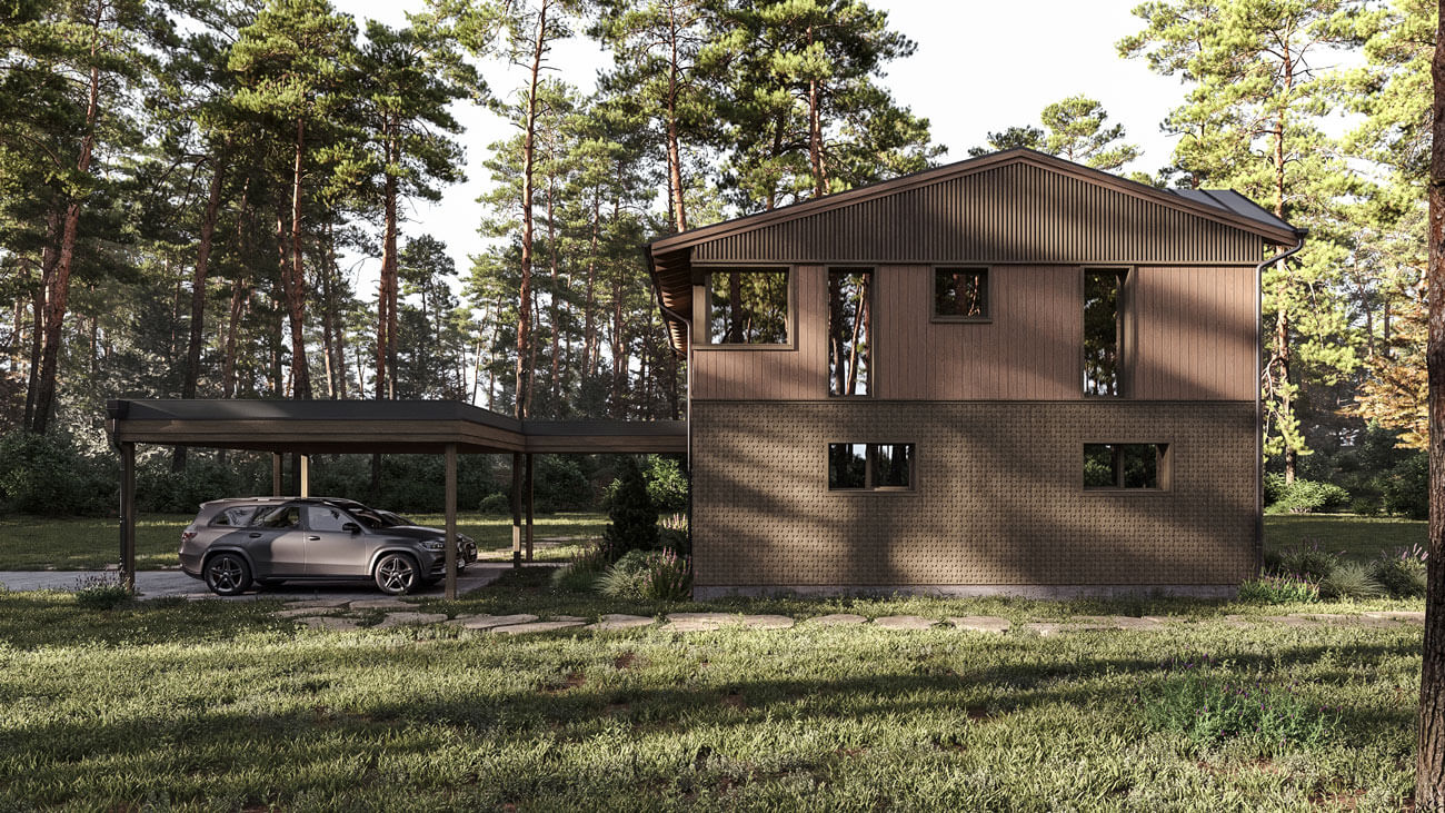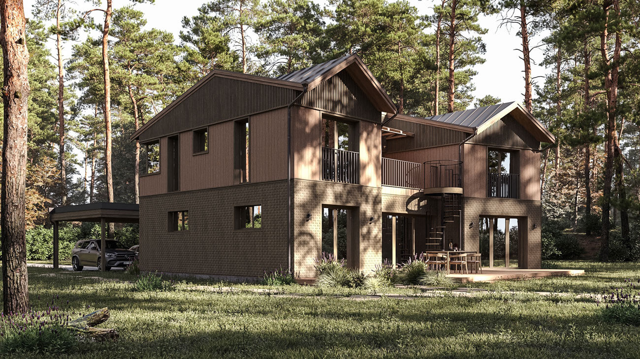 Двухэтажный объём дома расположен посреди небольшой поляны вблизи лесного массива. Мягкий тёмный оттенок дерева и разная текстура отделки уровней дома размывает контраст между природой и сооружением, делает дом «своим» в контексте окружения. Несущая конструкция – деревянный каркас, с облицовкой окрашенной термодревесиной. В уровне первого этажа дом отделан объёмной планкой Jukola, выше – чередование гладкой доски и бруска, кровля из фальцевой стали серого цвета.