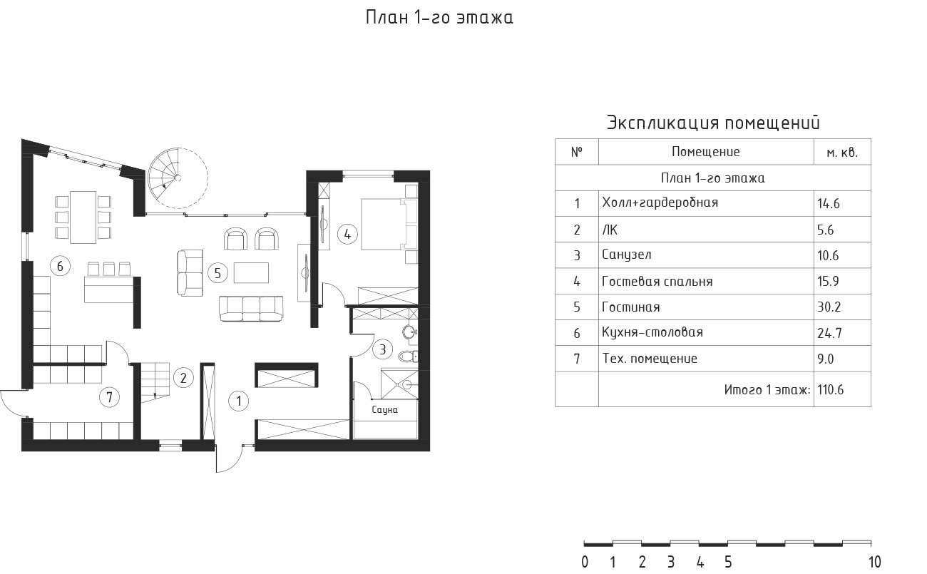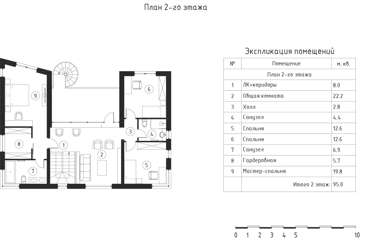 Дом имеет 2 этажа. На первом этаже набор комнат общего использования, помещения гостиной, кухни-столовой, входной зоны не имеют дверей и составляют один перетекающий объём. Дополнительно, в санузле первого этажа заказчик попросил установить традиционную кабину сауны. На втором этаже предусмотрены 2 детские спальни, общая комната (по функциям – вторая гостиная) и комплекс помещений мастер-спальни. Перед въездом запроектирована парковка на 2 машино-места, в дом с неё можно попасть по крытой галерее. Ориентация дома по сторонам света север-юг, где с севера расположен въезд, а на юг направлен дворовой фасад.