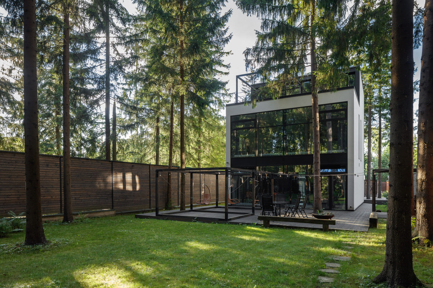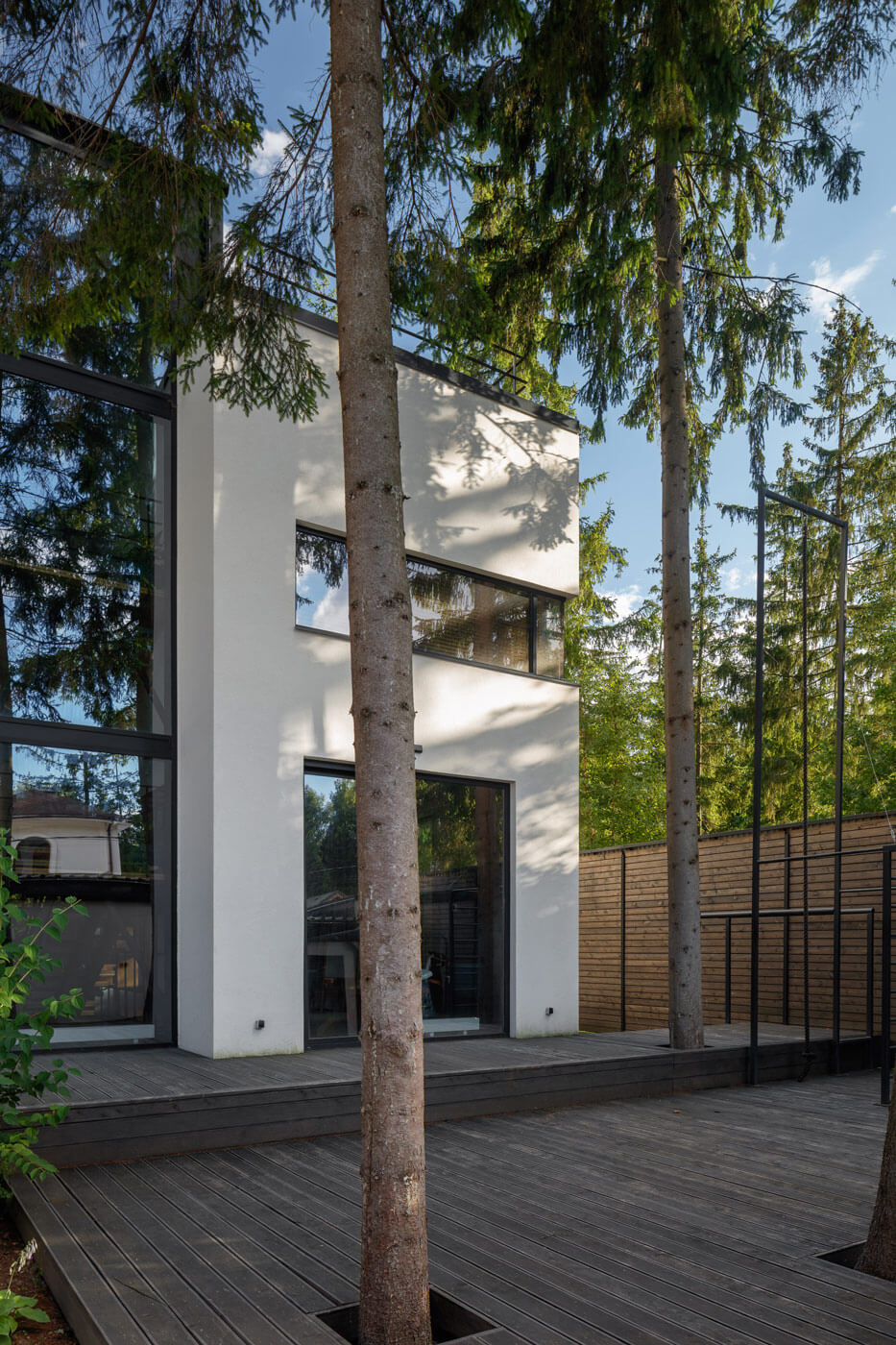 С целью обеспечения хорошей видовой характеристики применяются панорамные окна в пол. Это обеспечивает дом хорошей инсоляцией и позволяет любоваться окружающим ландшафтом из всех его помещений. Дом расположен таким образом, чтобы самое большое панорамное окно на 1-м этаже гостиной и на 2-м этаже в спальне были обращены в дикую часть участка. Там расположены основная часть сосен, благоустройство дорожек в виде отсыпки круглой галькой и плавные линии газона, покрывающего декоративные горки. Аскетичный минималистичный интерьер дома компенсируется богатым природным окружающим разнообразием. Данный прием использования остекления в пол позволяет создать ощущение без барьерной среды с природным окружением.