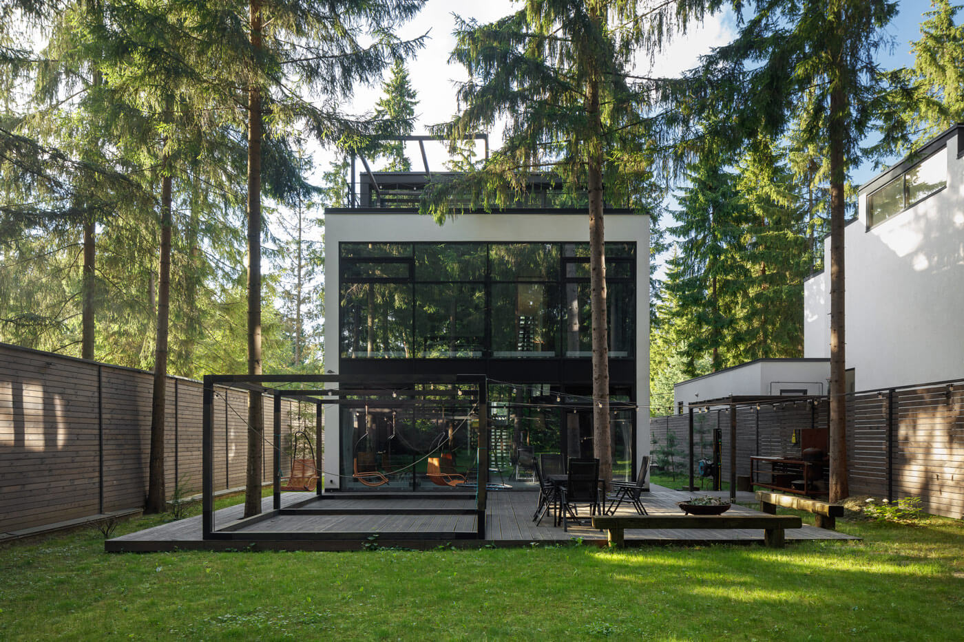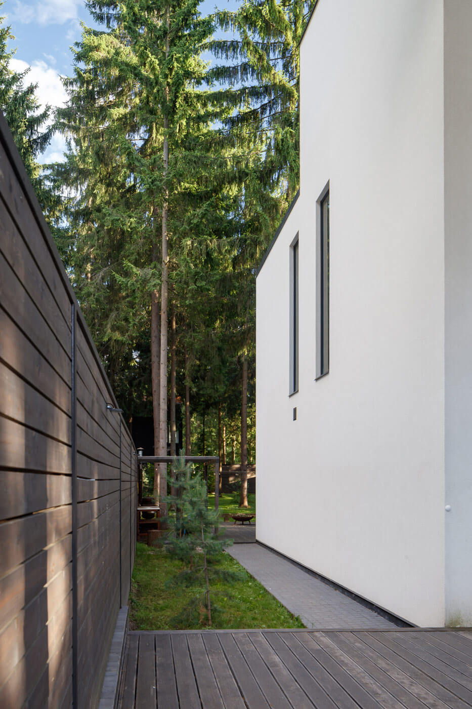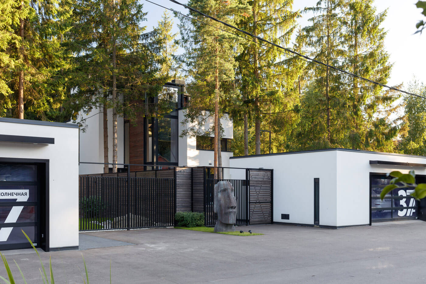 Главный дом располагается в сосновом бору на участке, имеющем вытянутую форму протяженностью 68 на 14 метров. Это и обусловило расположение и форму всех построек гаража, основного дома, зоны барбекю и беседки в конце участка, которые вытянуты практически по одной оси. В процессе разработки проекта хотелось сохранить максимальное количество окружающих деревьев. Поэтому проектируемые сооружения, ландшафт участка, его благоустройство и малые формы вписаны в природный кластер.