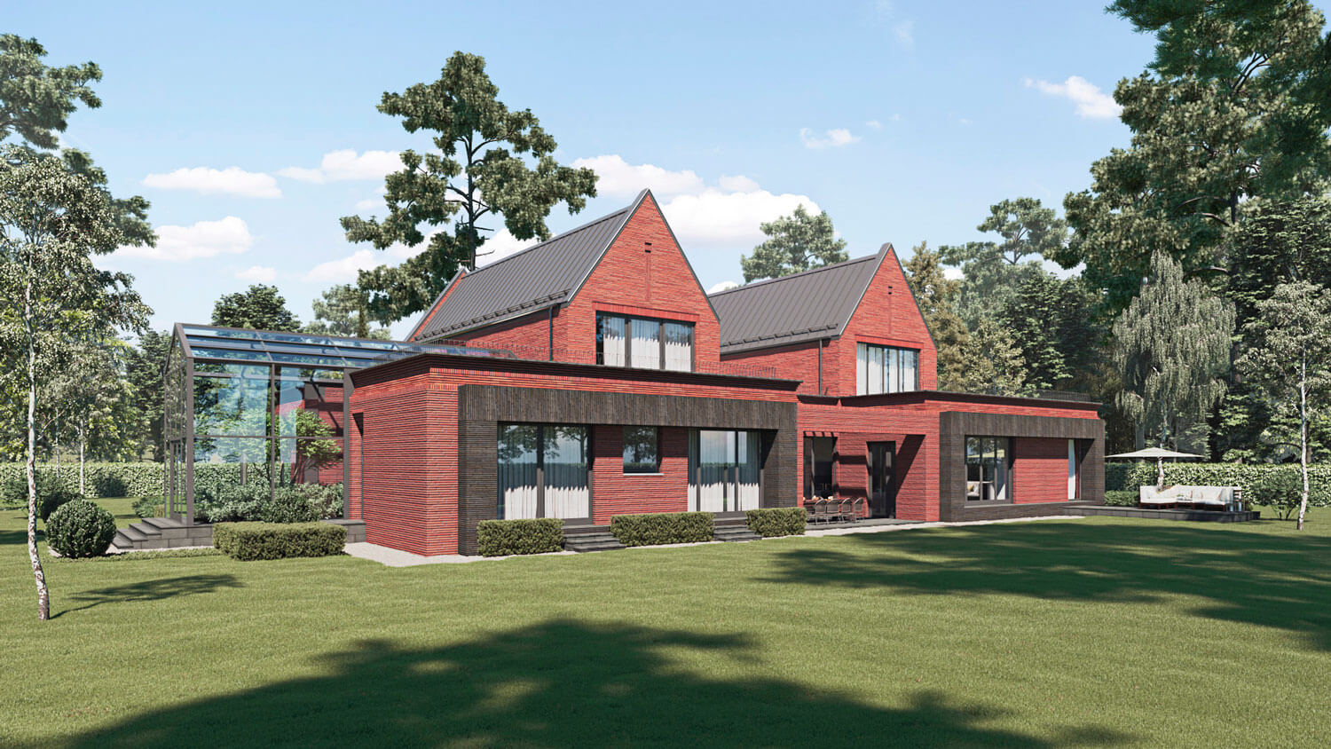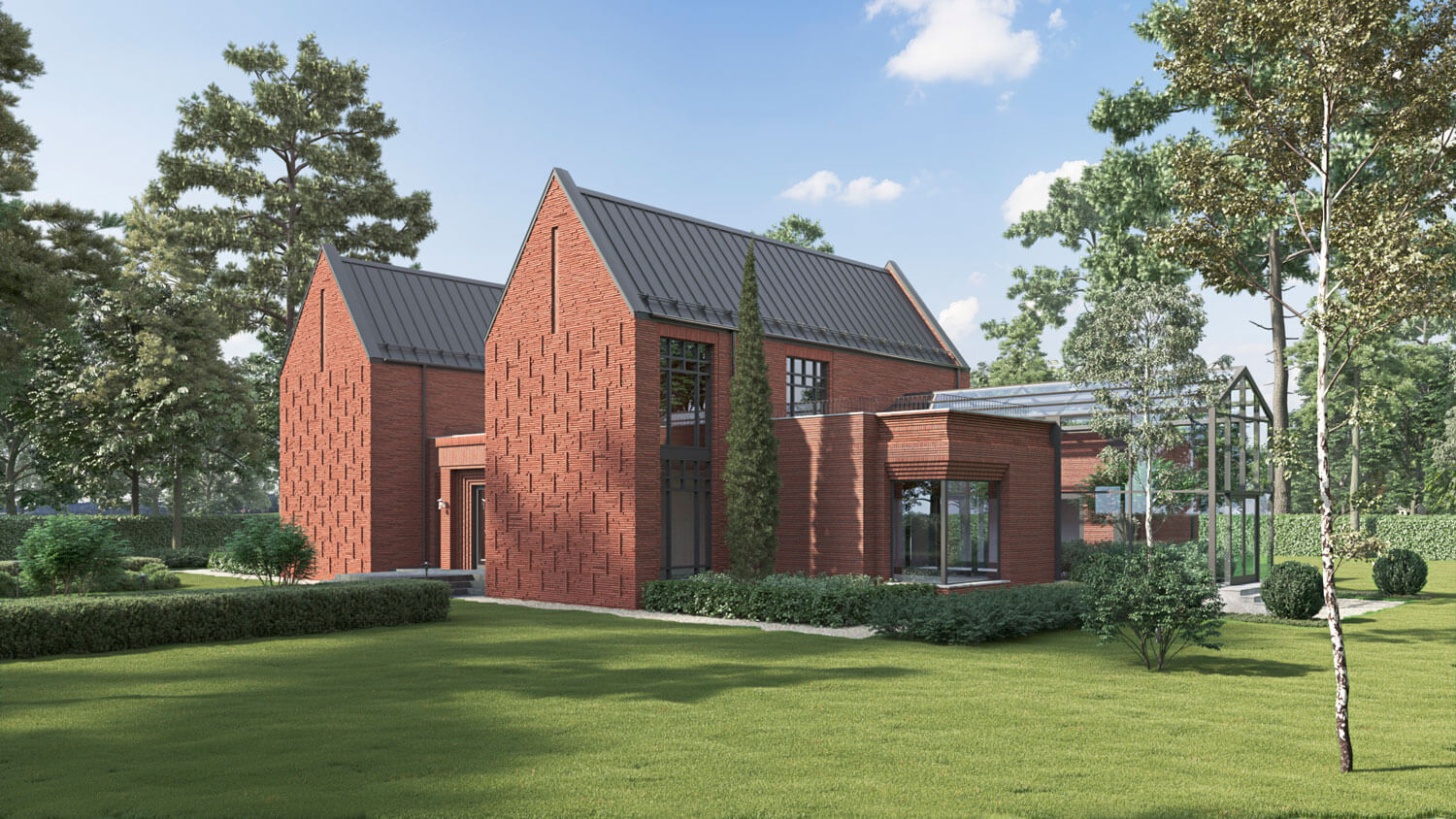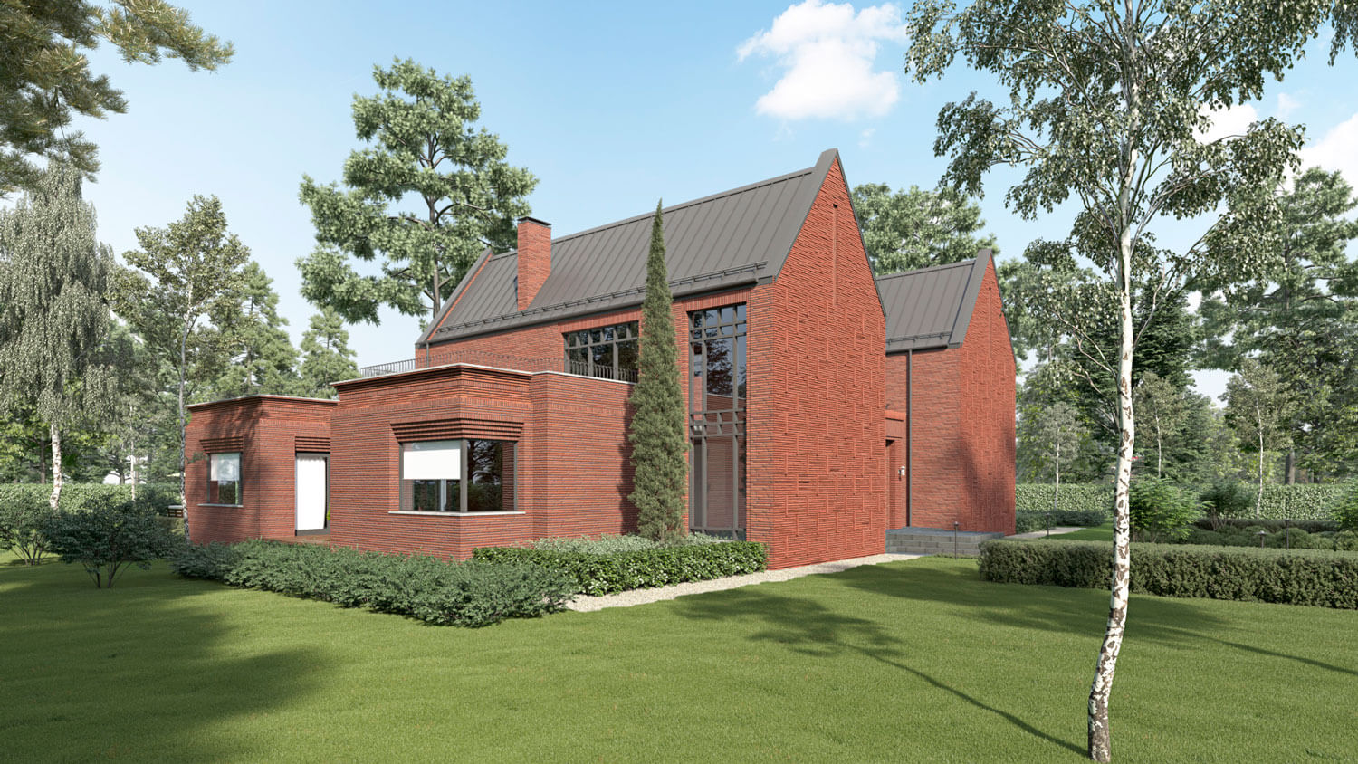 Главный дом располагается в сосновом бору на участке, имеющем вытянутую форму протяженностью 68 на 14 метров. Это и обусловило расположение и форму всех построек гаража, основного дома, зоны барбекю и беседки в конце участка, которые вытянуты практически по одной оси. В процессе разработки проекта хотелось сохранить максимальное количество окружающих деревьев. Поэтому проектируемые сооружения, ландшафт участка, его благоустройство и малые формы вписаны в природный кластер.