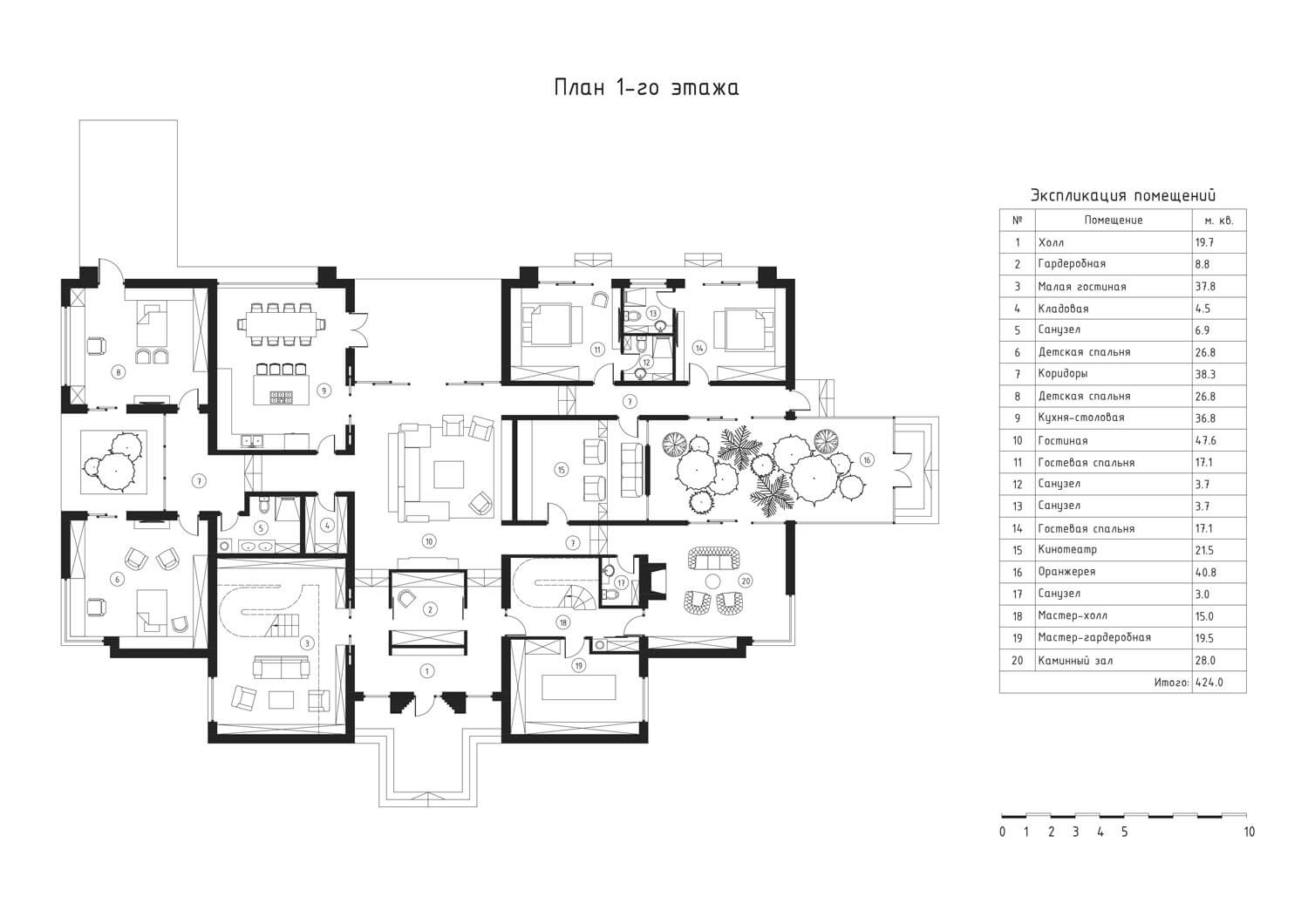 На 1-м этаже расположены помещения гостиной, кухни, гардероба и гостевого санузла, на 2-м этаже – хозяйская спальня с санузлом, детская, спальня няни и постирочная.