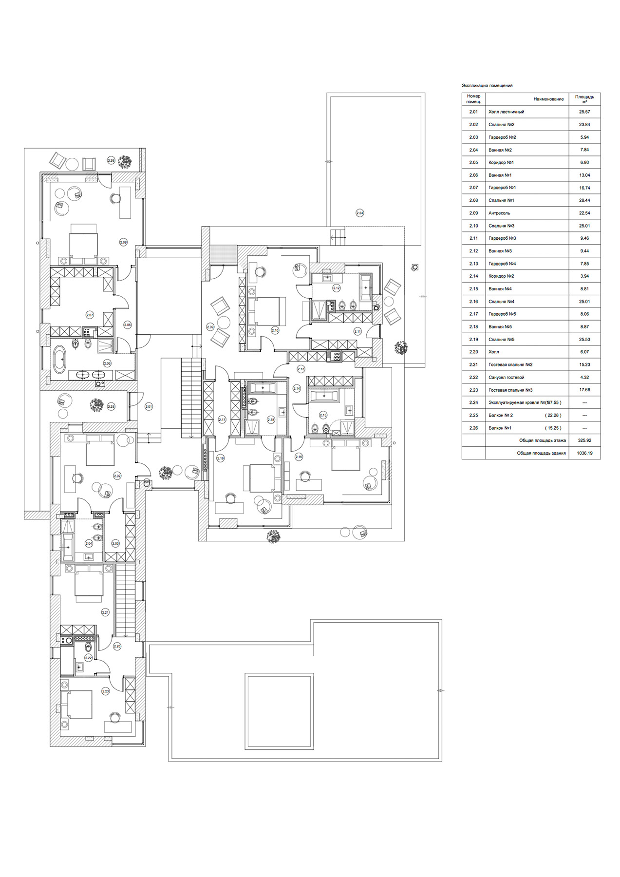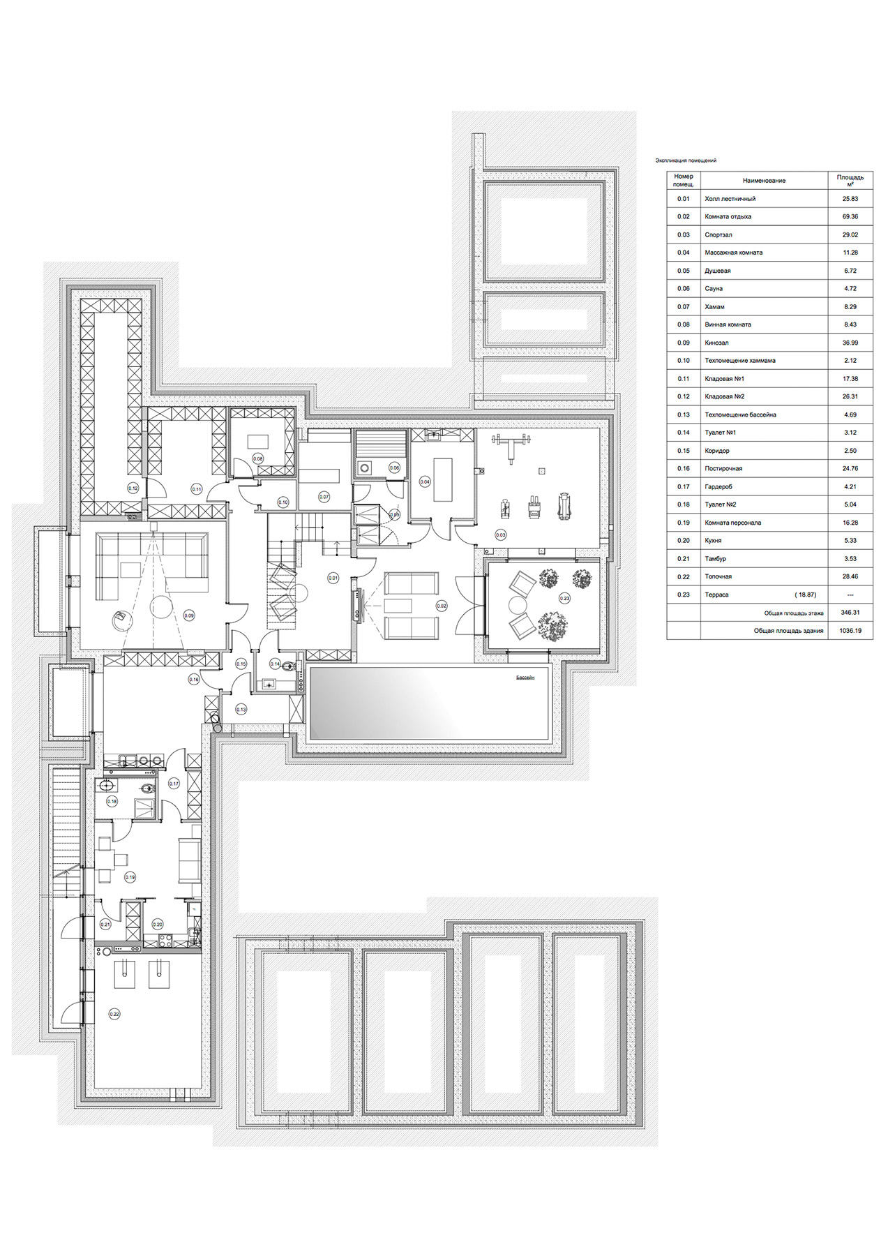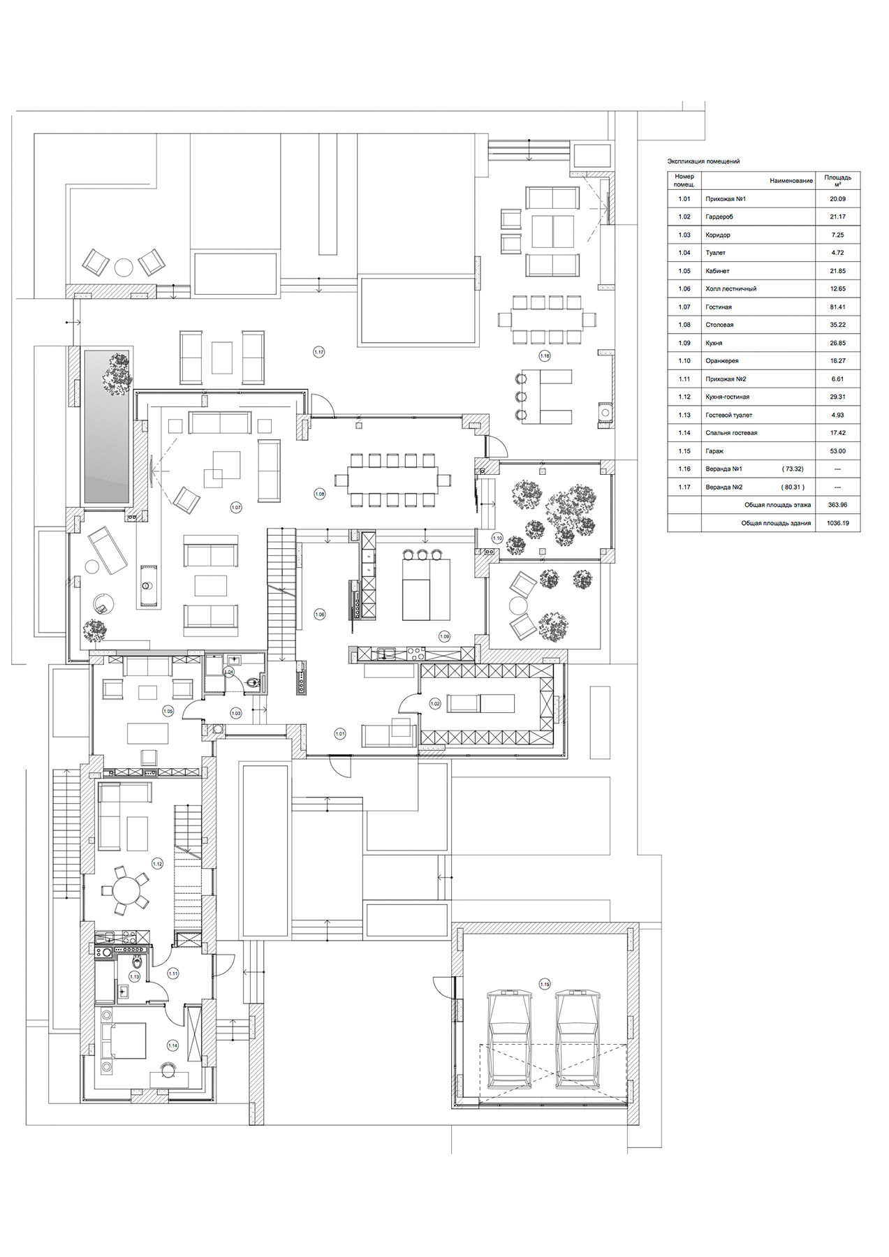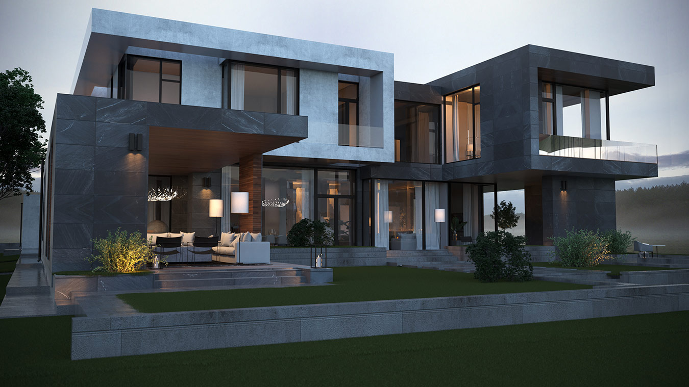 Дом общей площадью 1000 м² предназначен для большой семьи. Участок, отведенный под застройку, имеет неровный рельеф. Что предоставило авторам проекта возможность сделать террасированное сложное пространство как снаружи, так и внутри дома.