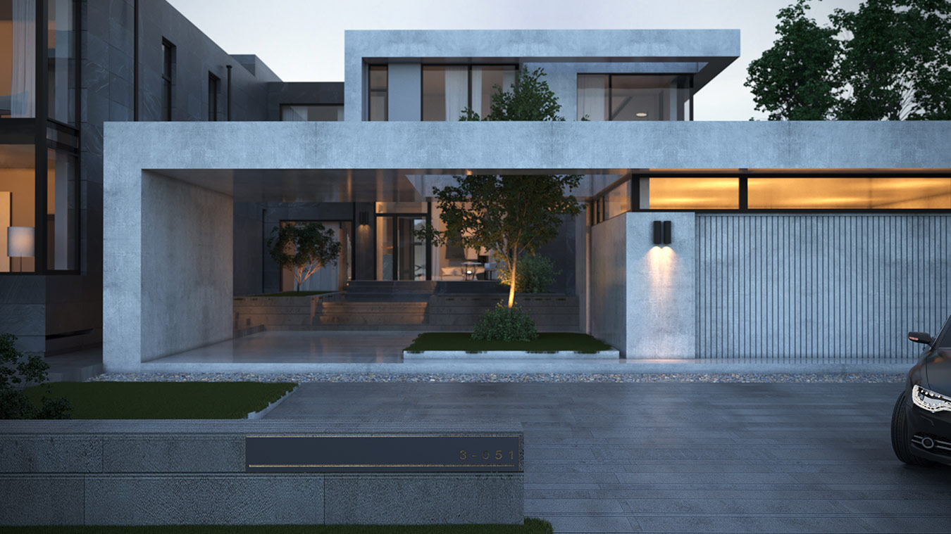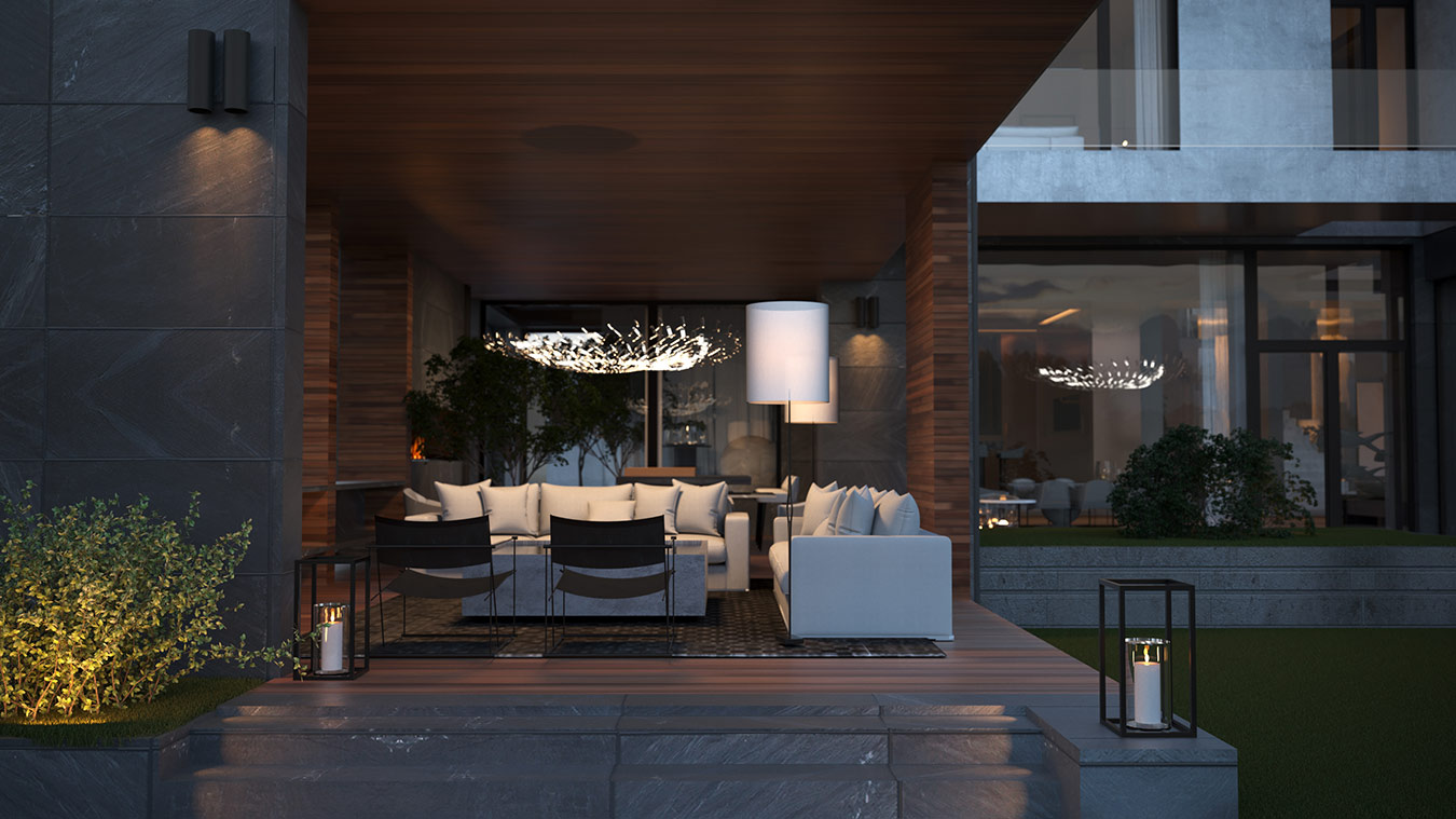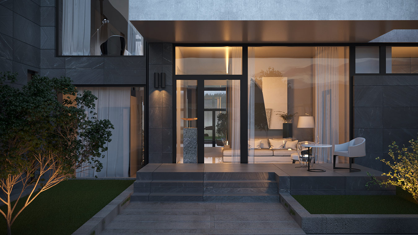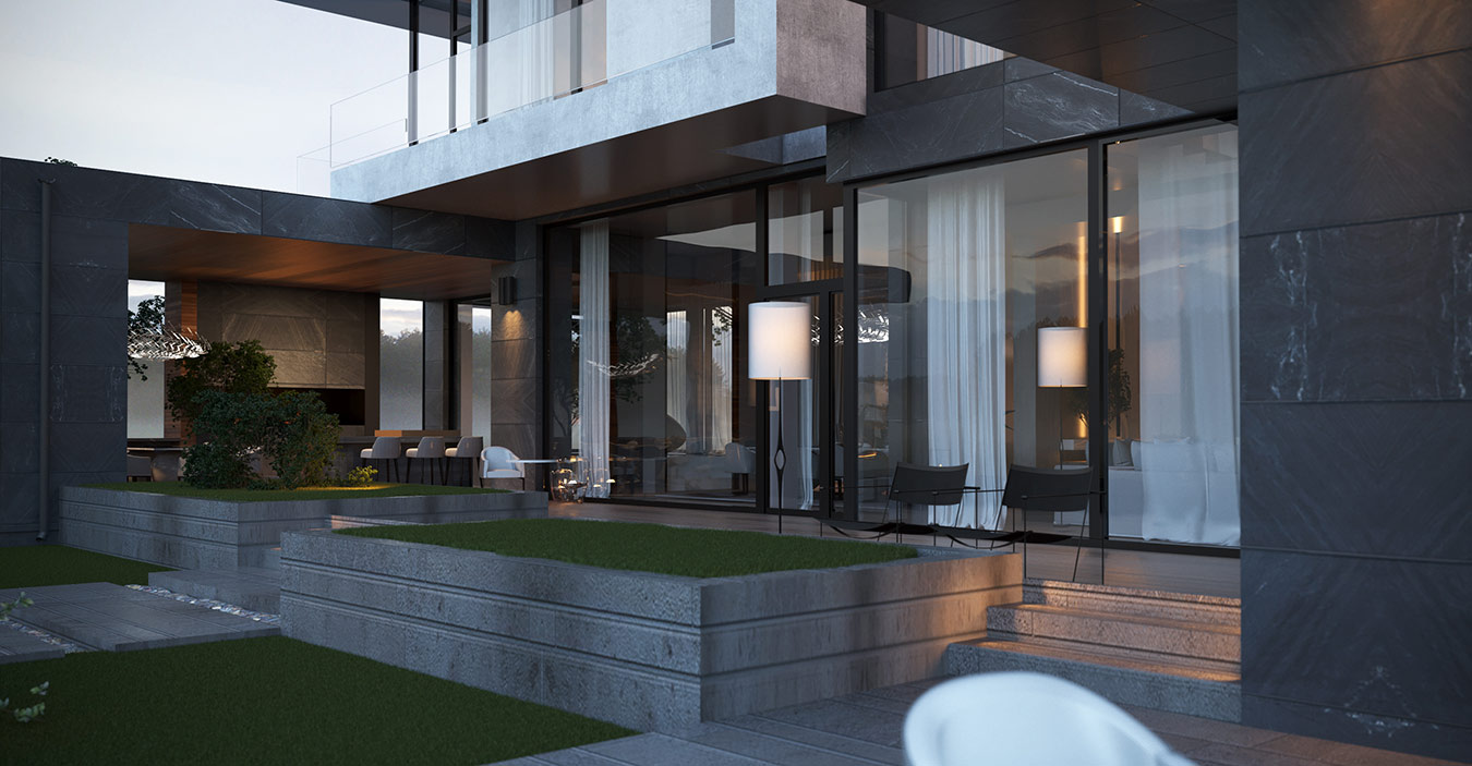 Концепция перетекающих друг в друга объемов обусловила объединение трех этажей в одно целое. При этом постарались выделить объем общественной зоны, сделать его более монолитным, в том числе и за счет цвета, оформив фасады темным сланцем. Блок приватной зоны спален, наоборот, сделали более структурированным, легким и в светлом материале. Также было придумано решение с патио на цокольном этаже, которое дает возможность получить в зоне бассейна хорошо освещенное пространство с окнами в пол и выходом на террасу.