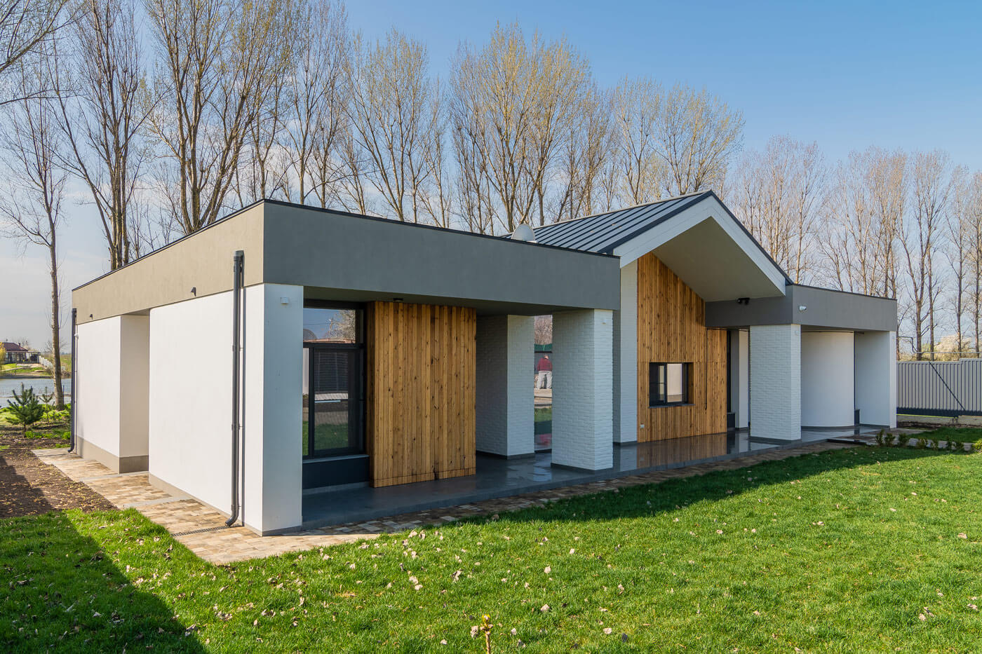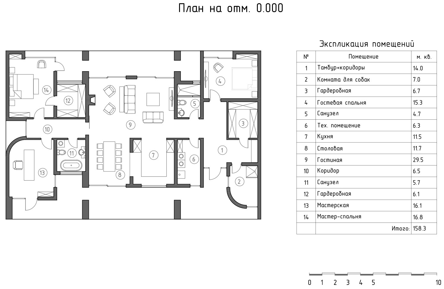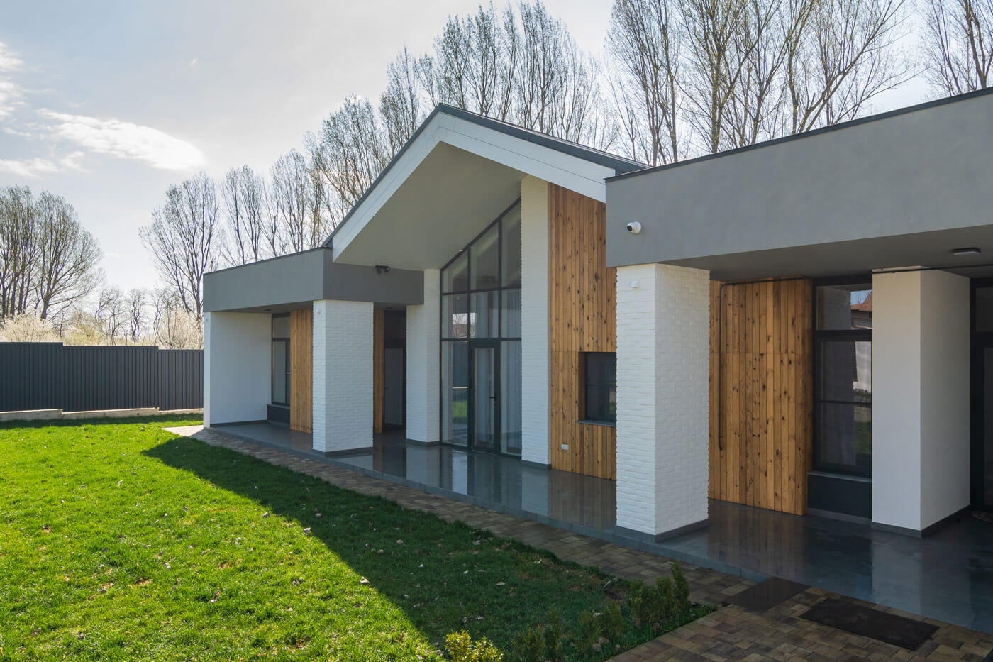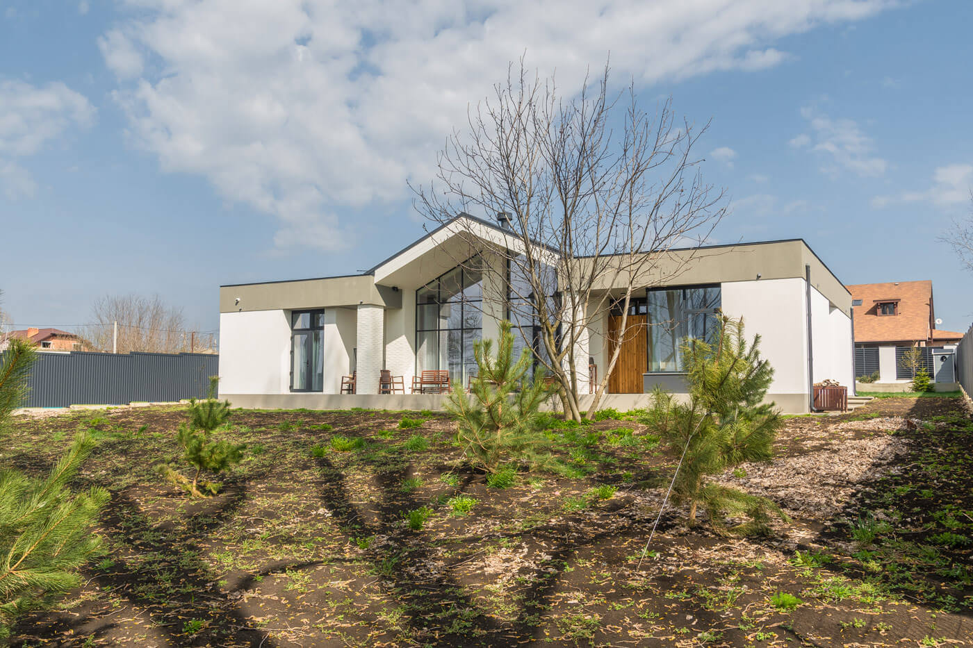 Дом расположен на участке 14 соток в селе Первореченское. Внутренний объём разделён на 3 части: входная зона, общая и приватная. В первой части расположились гардеробная, комната для собак, тех. помещение с санузлом и гостевая спальня. Далее, самая объёмная часть дома с потолками под скат кровли, высотой 5 м – здесь запроектированы кухня, столовая и гостиная; за ней – комплекс помещений мастер-сюита, включает мастер-спальню, гардеробную, мастерскую и санузел. Участок ориентирован по оси север-юг, на границе, по южной стороне, протекает река и вид из дома направлен в её сторону. Дом запроектирован одноэтажным, без уровней в пределах этажа и с несколькими террасами в разных зонах.