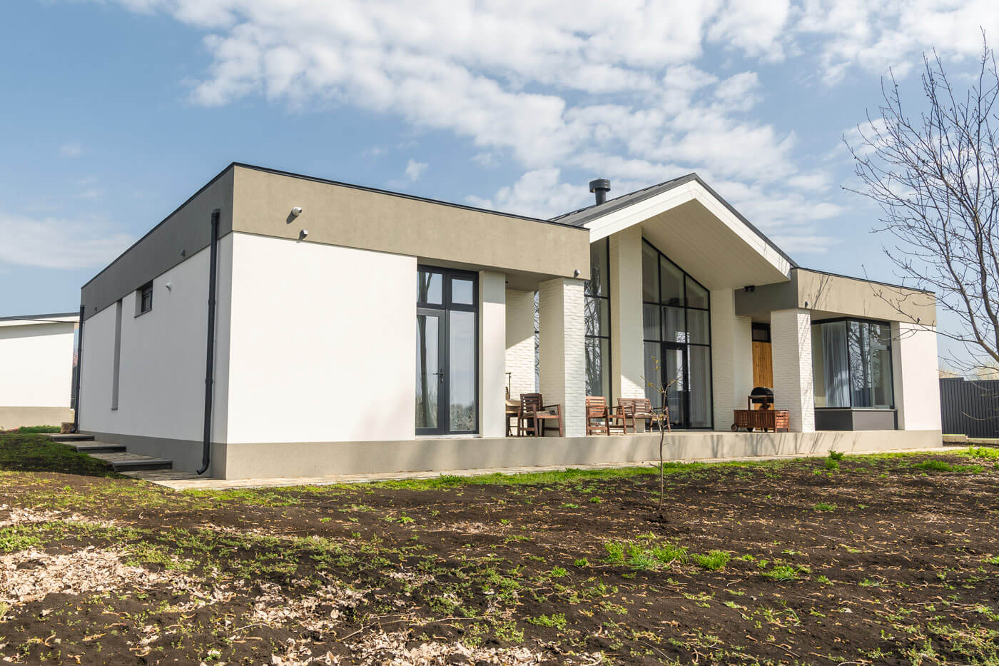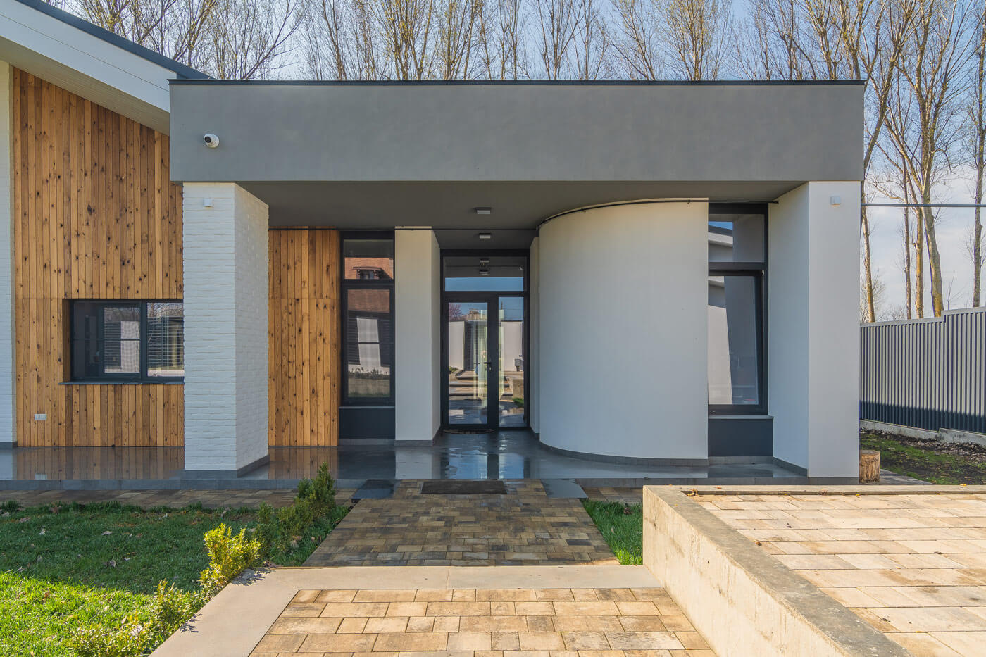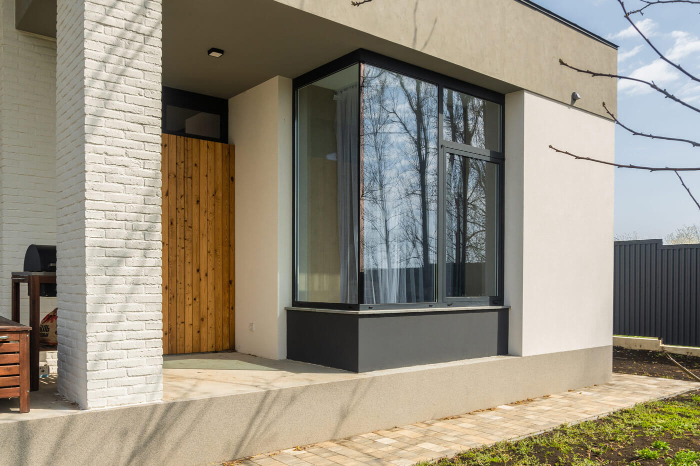 Дом расположен на участке 14 соток в селе Первореченское. Внутренний объём разделён на 3 части: входная зона, общая и приватная. В первой части расположились гардеробная, комната для собак, тех. помещение с санузлом и гостевая спальня. Далее, самая объёмная часть дома с потолками под скат кровли, высотой 5 м – здесь запроектированы кухня, столовая и гостиная; за ней – комплекс помещений мастер-сюита, включает мастер-спальню, гардеробную, мастерскую и санузел. Участок ориентирован по оси север-юг, на границе, по южной стороне, протекает река и вид из дома направлен в её сторону. Дом запроектирован одноэтажным, без уровней в пределах этажа и с несколькими террасами в разных зонах.