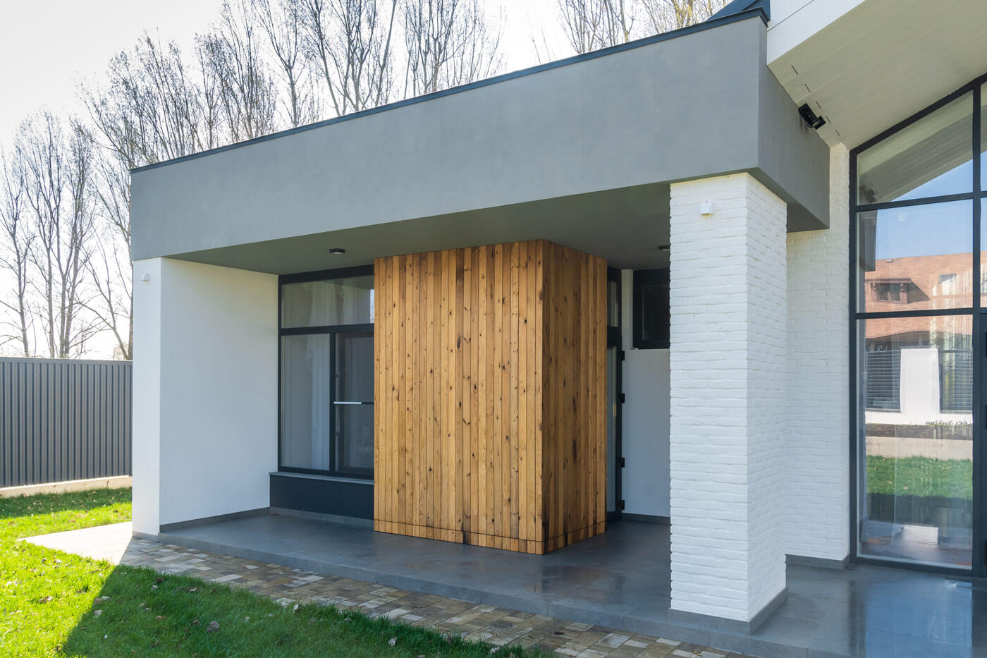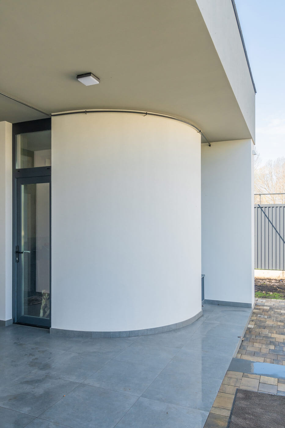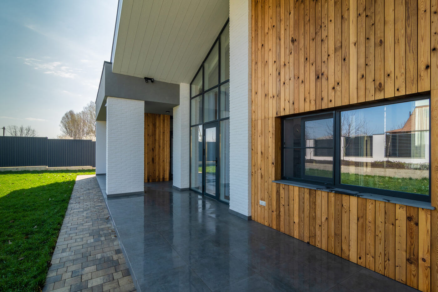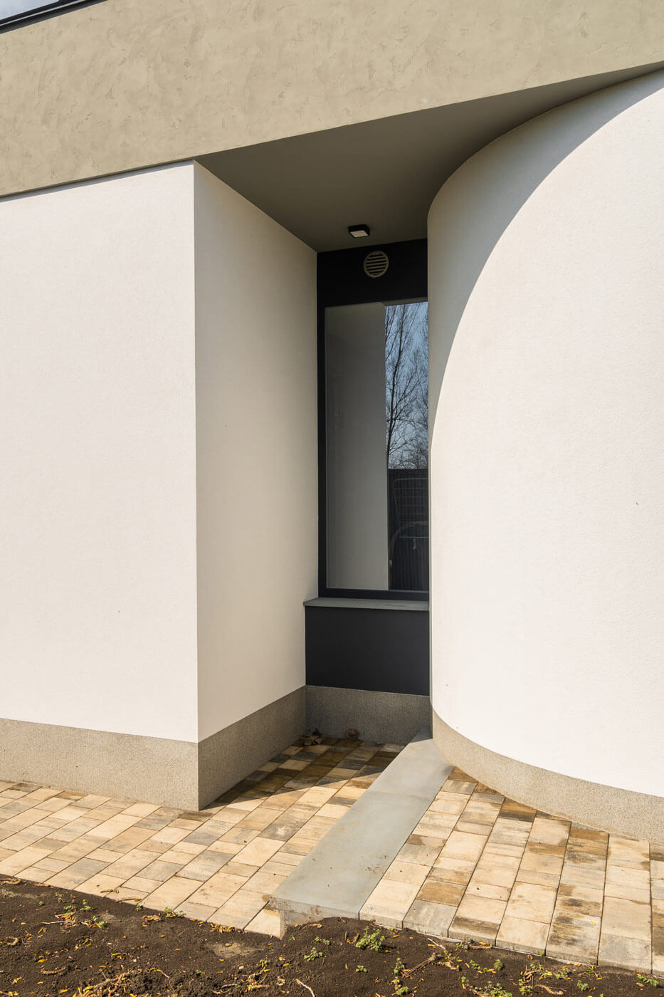 Дом расположен на участке 14 соток в селе Первореченское. Внутренний объём разделён на 3 части: входная зона, общая и приватная. В первой части расположились гардеробная, комната для собак, тех. помещение с санузлом и гостевая спальня. Далее, самая объёмная часть дома с потолками под скат кровли, высотой 5 м – здесь запроектированы кухня, столовая и гостиная; за ней – комплекс помещений мастер-сюита, включает мастер-спальню, гардеробную, мастерскую и санузел. Участок ориентирован по оси север-юг, на границе, по южной стороне, протекает река и вид из дома направлен в её сторону. Дом запроектирован одноэтажным, без уровней в пределах этажа и с несколькими террасами в разных зонах.
