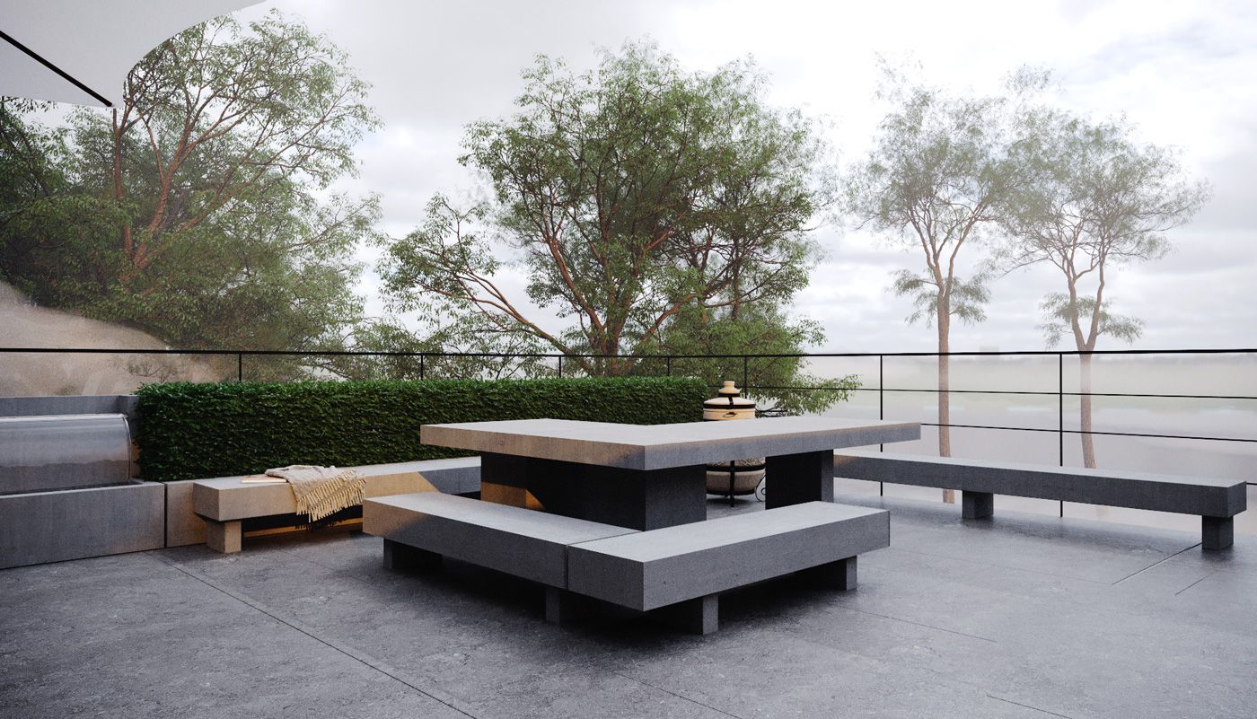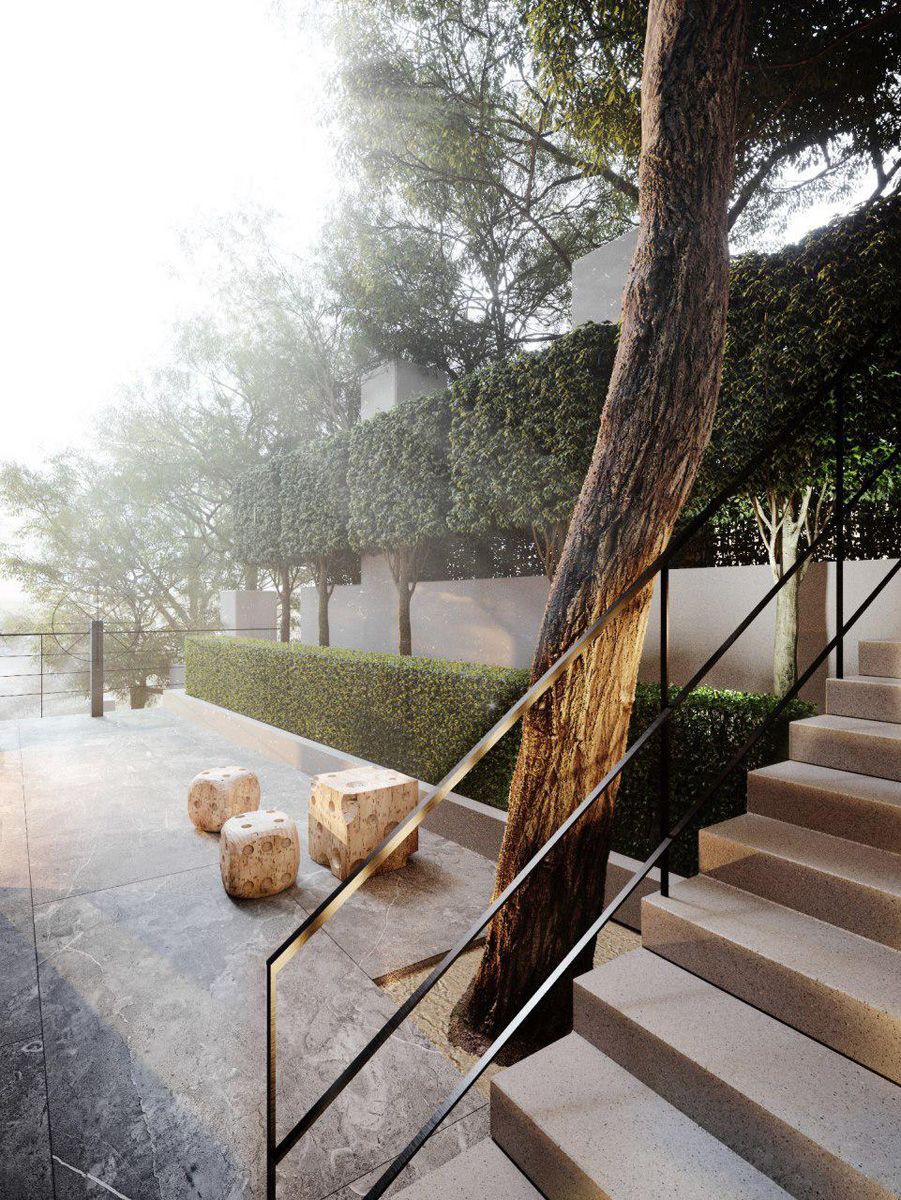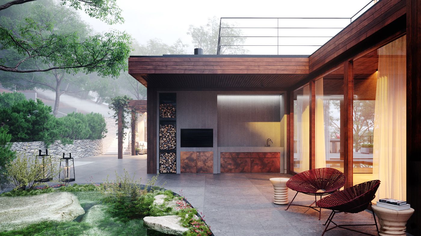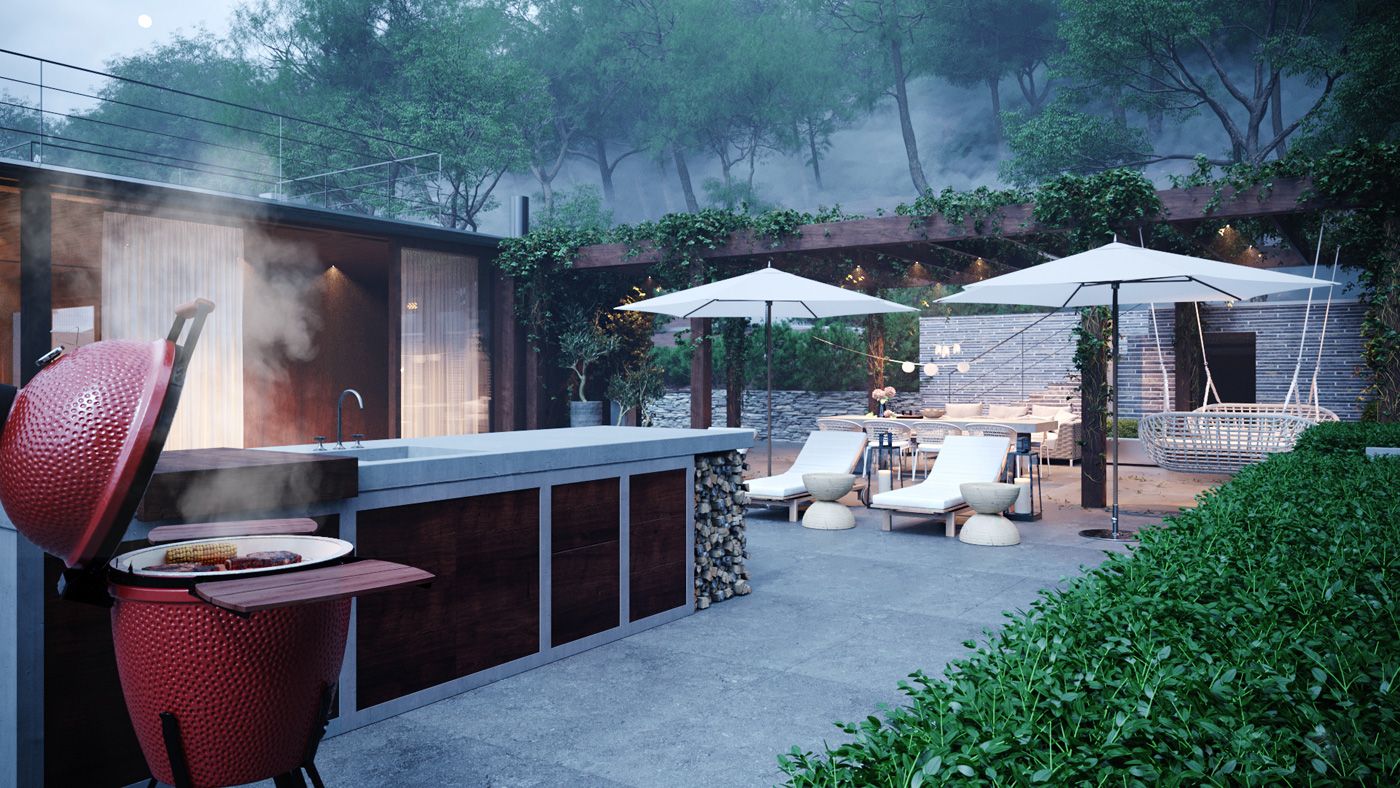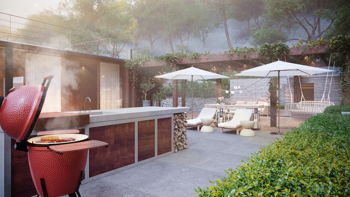 Самая зрелищная часть дома — терраса, откуда открывается панорама города и морской горизонт. В это пространство перенесено сразу несколько функций: столовая, летняя кухня и зона отдыха с лежаками. Рядом со столовой обустроен небольшой грот с водой.