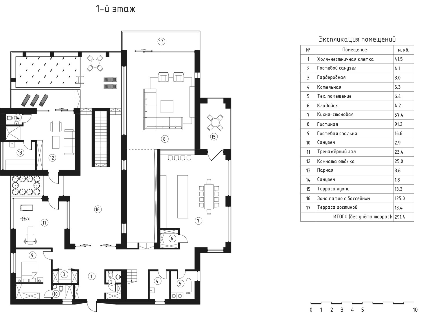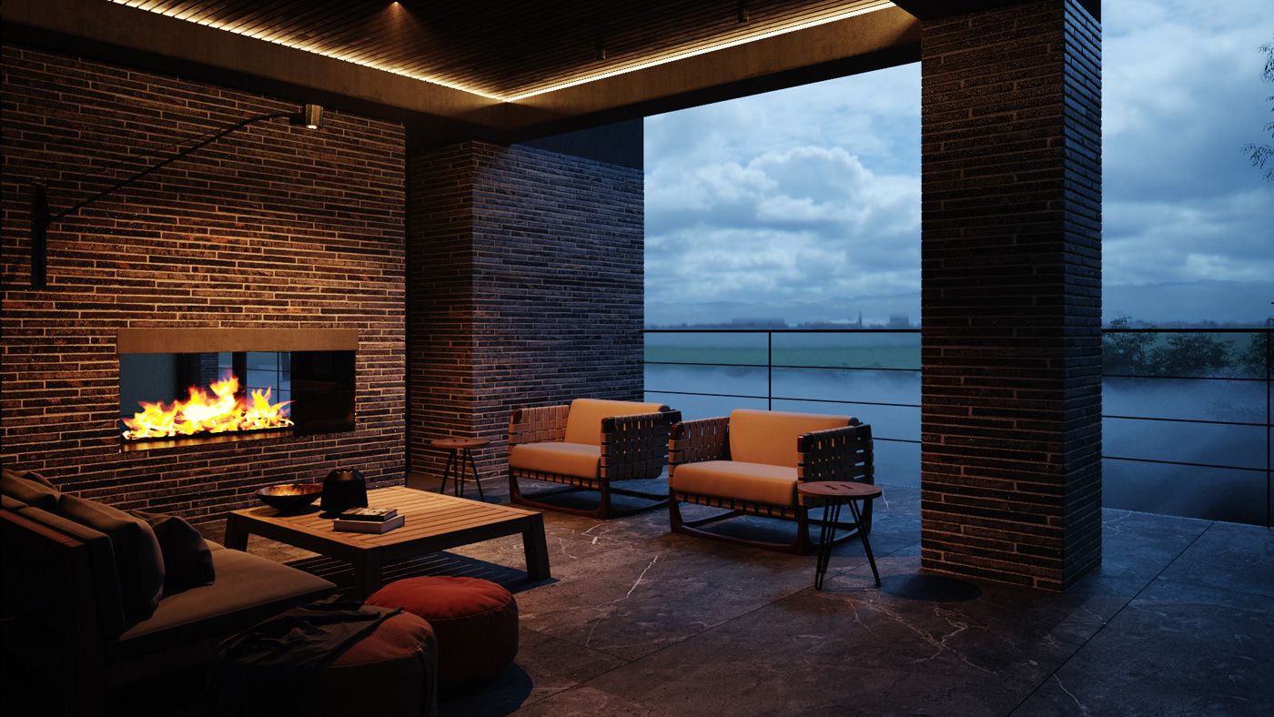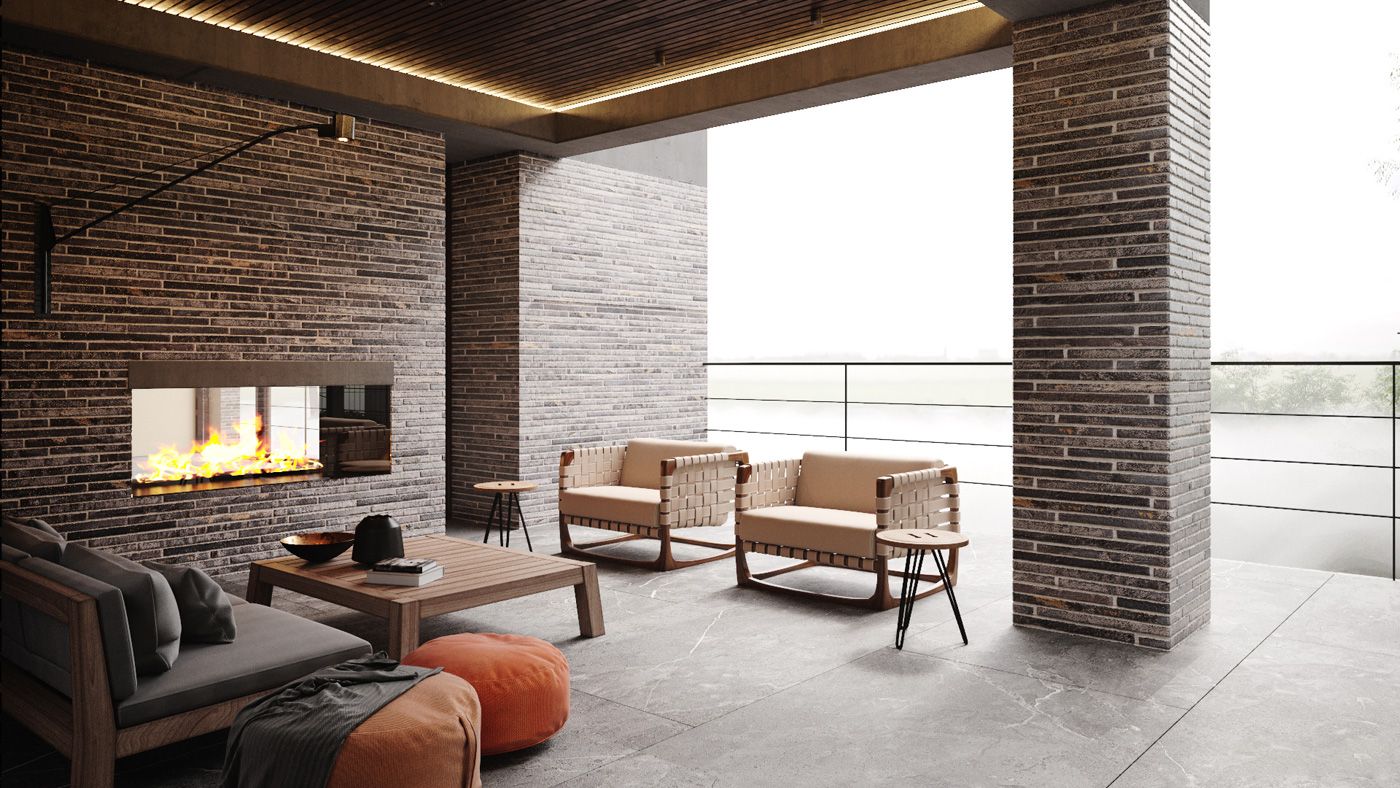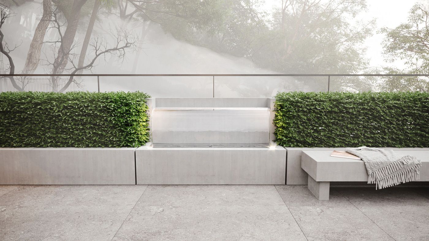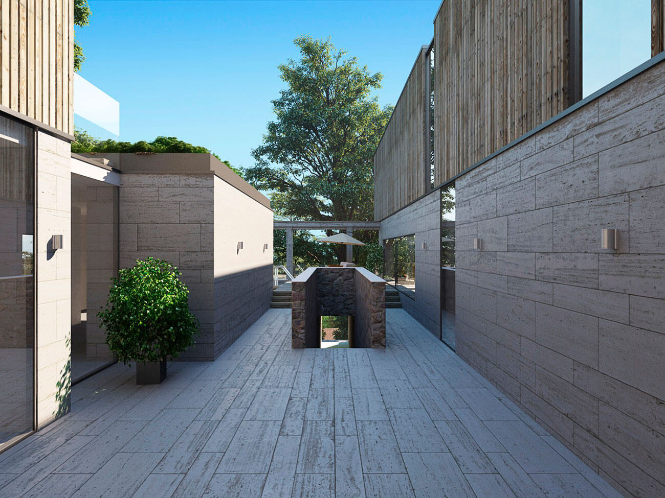 Самая зрелищная часть дома — терраса, откуда открывается панорама города и морской горизонт. В это пространство перенесено сразу несколько функций: столовая, летняя кухня и зона отдыха с лежаками. Рядом со столовой обустроен небольшой грот с водой.