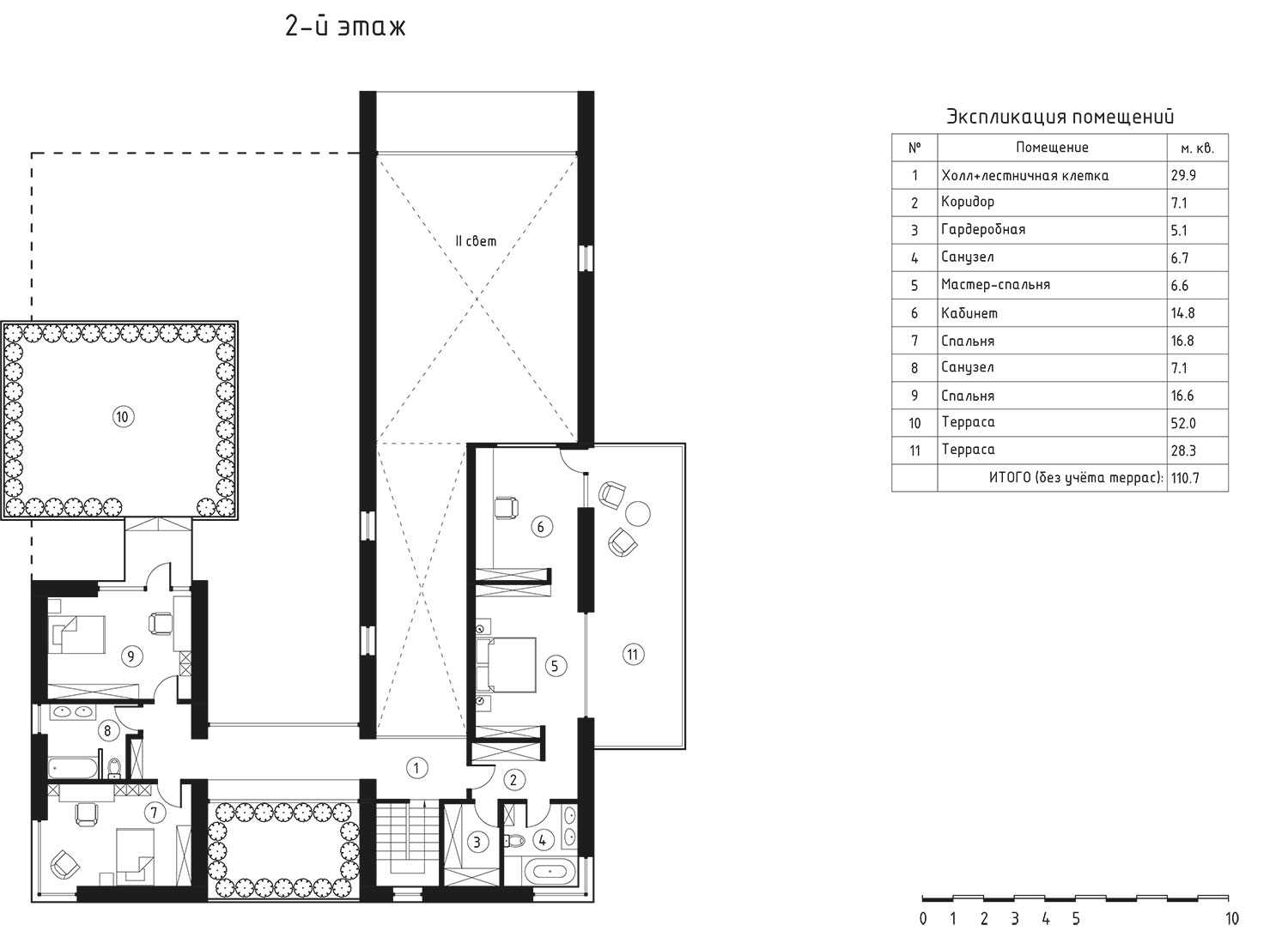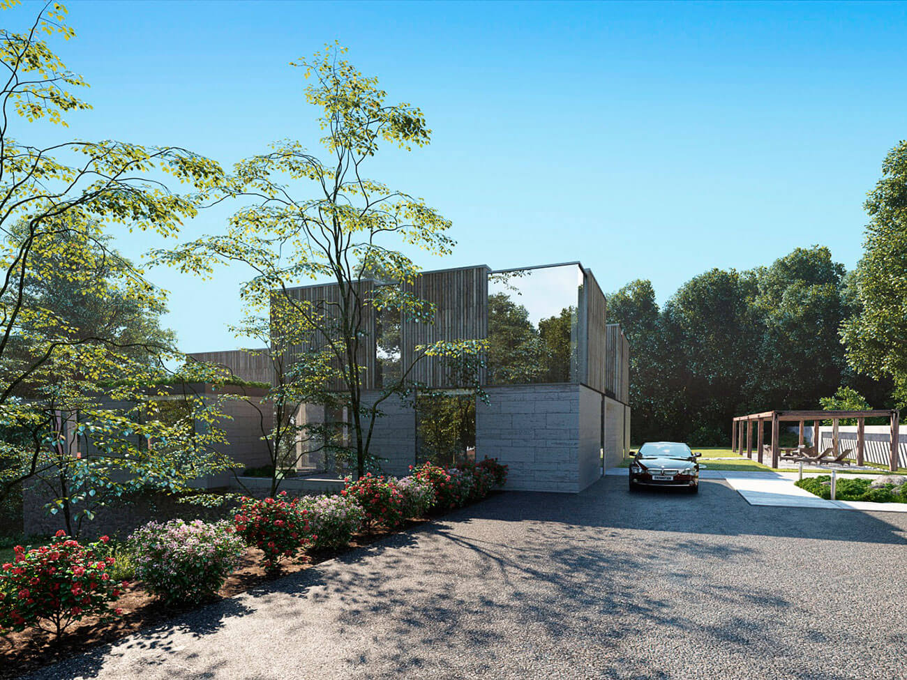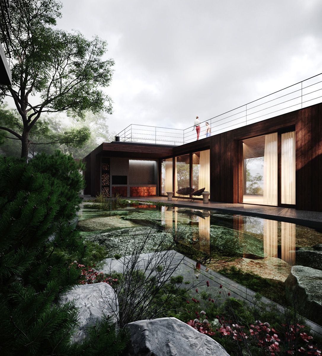 Внутри дома, на втором этаже, находится бассейн. В теплое время года он становится частью пейзажа благодаря большим раздвижным витражам.
