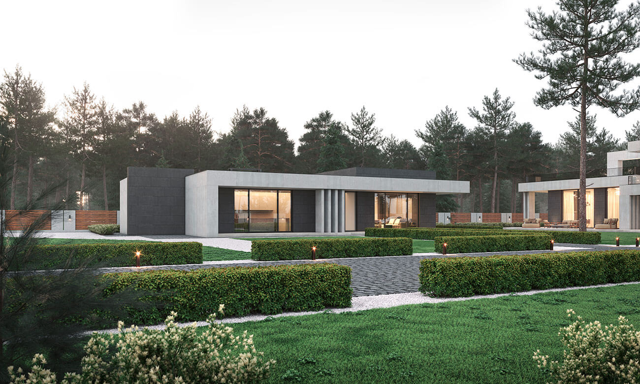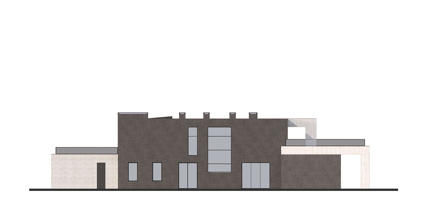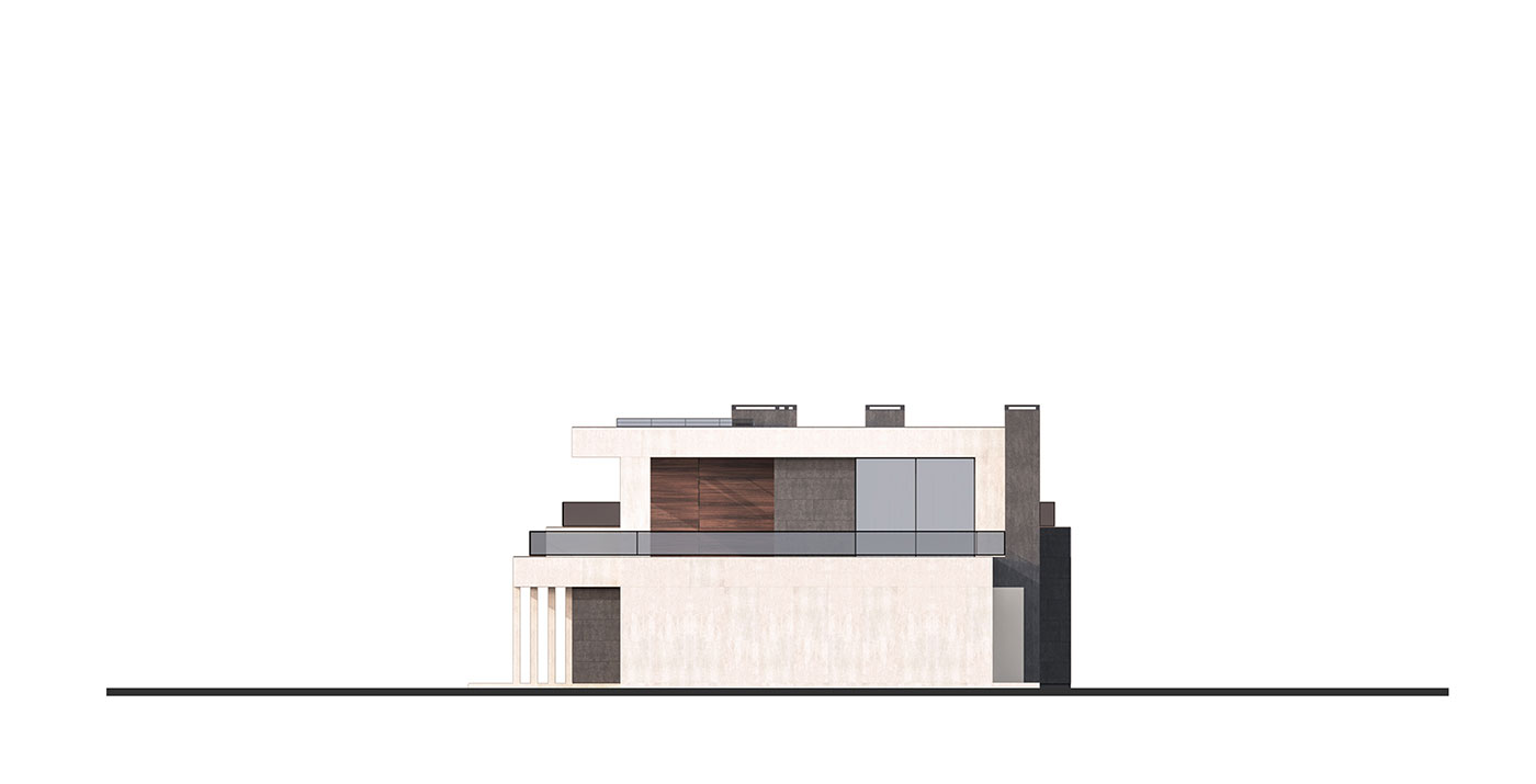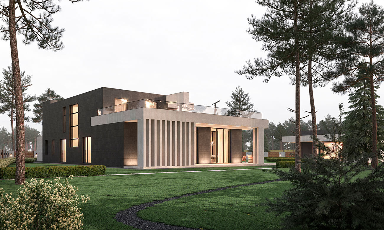 Стилистическое решение дома определено предпочтениями заказчиков и регламентом поселка. Мы соединили эстетику минимализма с максимальной функциональностью. Общее пространство кухни, столовой и гостиной выходит на южную сторону и на главный фасад здания, это позволило использовать обширное остекление и придать подчеркнуто современный облик главному фасаду. Выносы кровли являются навесом над террасами и одновременно служат выразительным декоративным элементом, создают горизонтальные тяги на нескольких уровнях. Они выделены отделочным материалом — фасадной штукатуркой, имитирующей бетонную поверхность. Пилоны, которые стоят либо парами, либо группами, так же являются декоративно-конструктивным элементом. Заглубленные элементы фасада облицованы керамогранитом, похожим на черный сланец, а центральный двухэтажный элемент здания, пересекающий горизонтальные тяги, выделен планкеном из термообработанного ясеня.