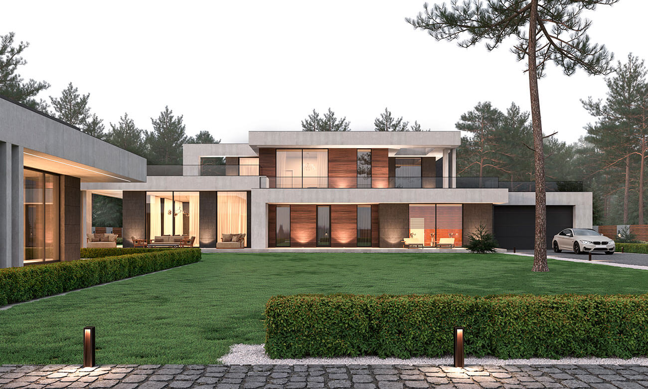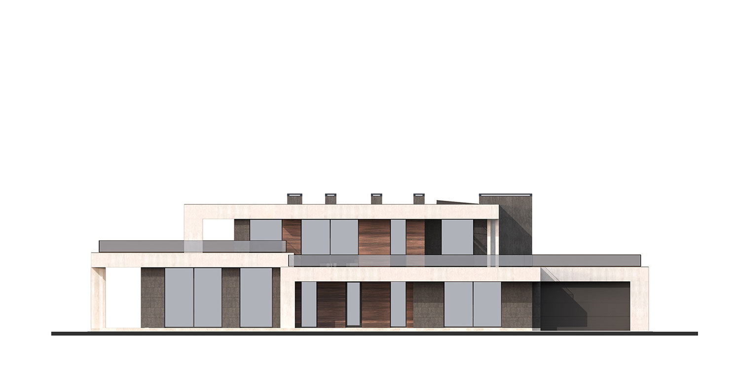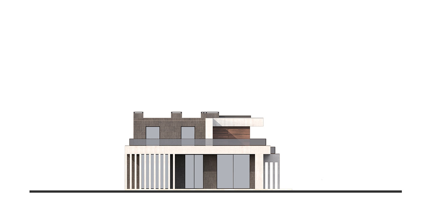Стилистическое решение дома определено предпочтениями заказчиков и регламентом поселка. Мы соединили эстетику минимализма с максимальной функциональностью. Общее пространство кухни, столовой и гостиной выходит на южную сторону и на главный фасад здания, это позволило использовать обширное остекление и придать подчеркнуто современный облик главному фасаду. Выносы кровли являются навесом над террасами и одновременно служат выразительным декоративным элементом, создают горизонтальные тяги на нескольких уровнях. Они выделены отделочным материалом — фасадной штукатуркой, имитирующей бетонную поверхность. Пилоны, которые стоят либо парами, либо группами, так же являются декоративно-конструктивным элементом. Заглубленные элементы фасада облицованы керамогранитом, похожим на черный сланец, а центральный двухэтажный элемент здания, пересекающий горизонтальные тяги, выделен планкеном из термообработанного ясеня.