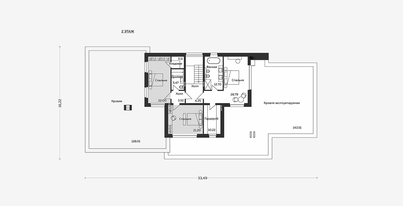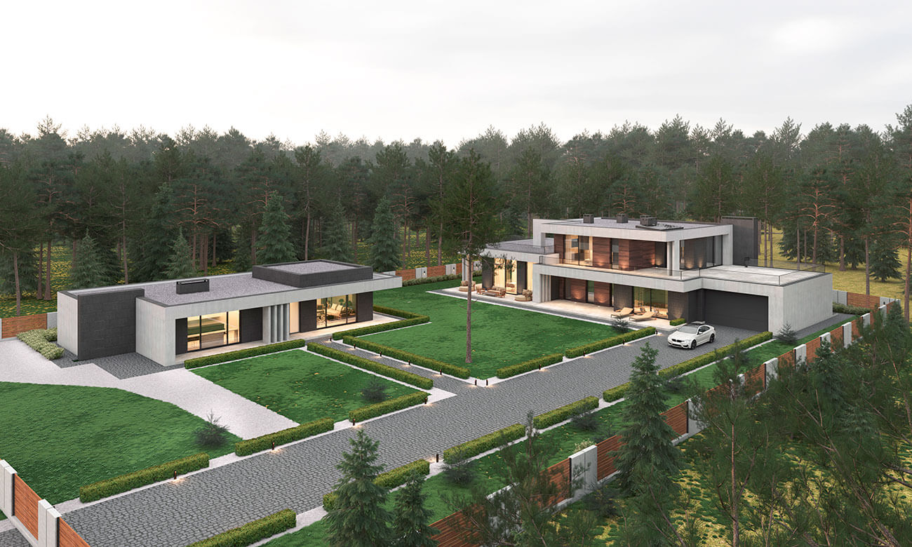 В комплексе с основным домом спроектирован гостевой дом. В нем читаются те же стилистические приемы, при планировании помещений также использован функциональный подход.