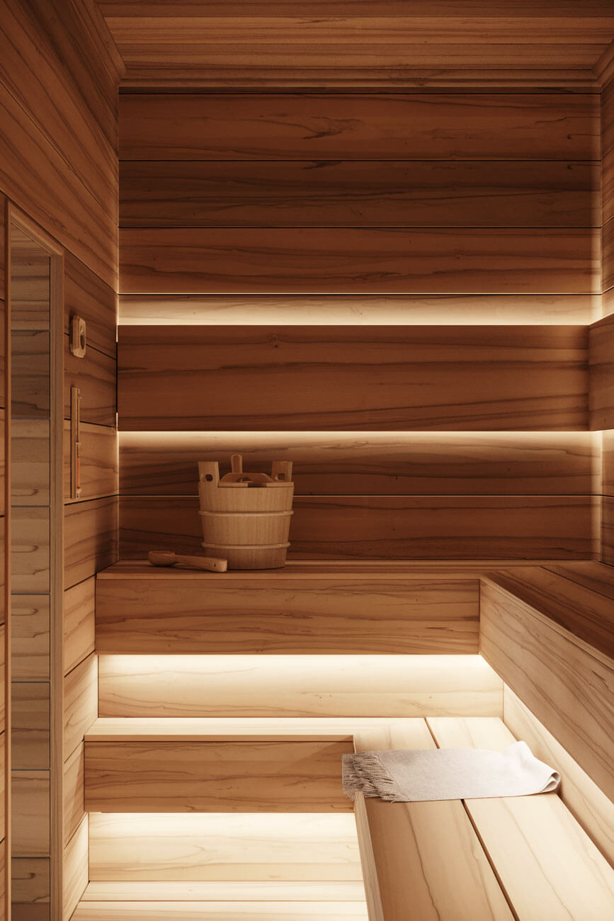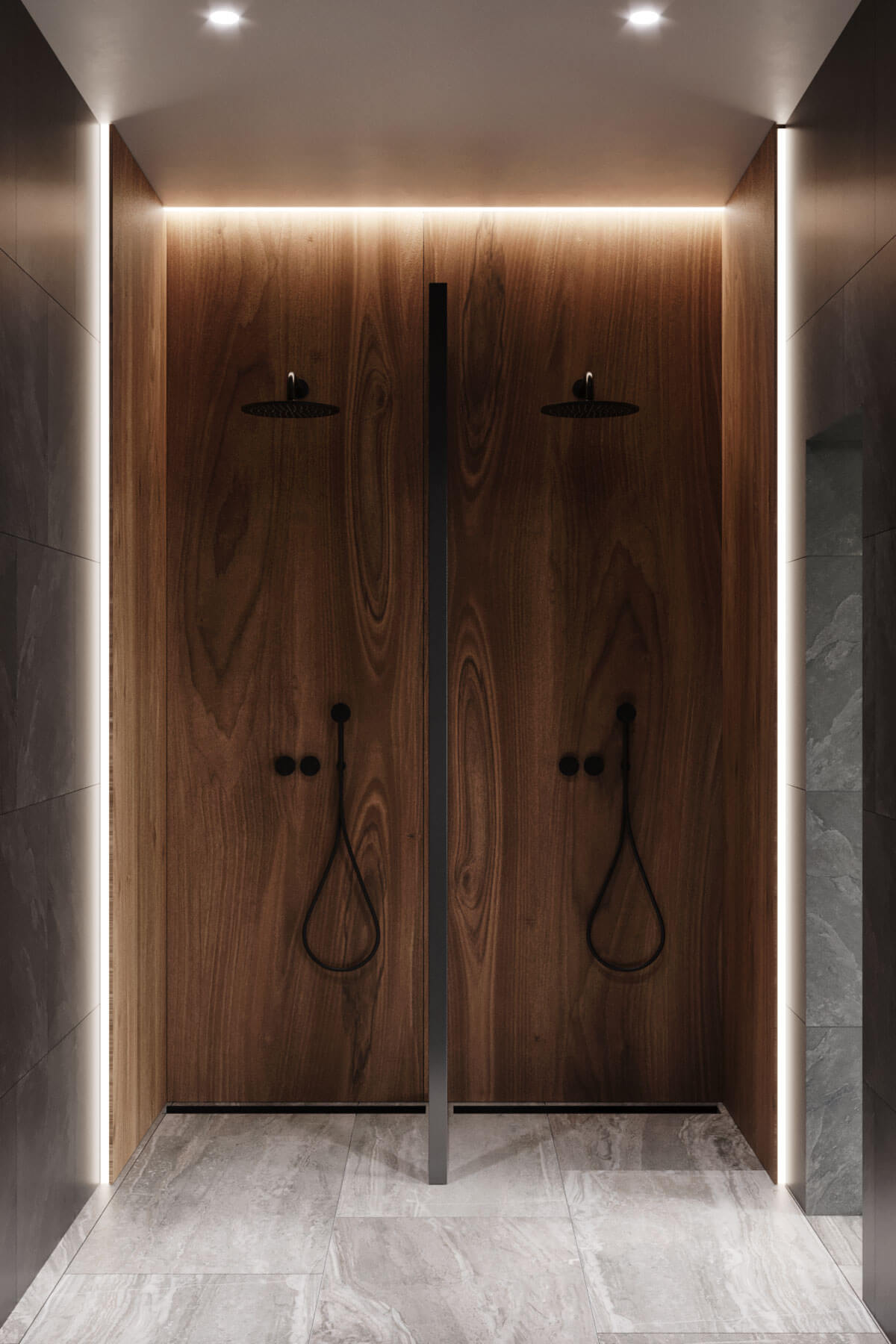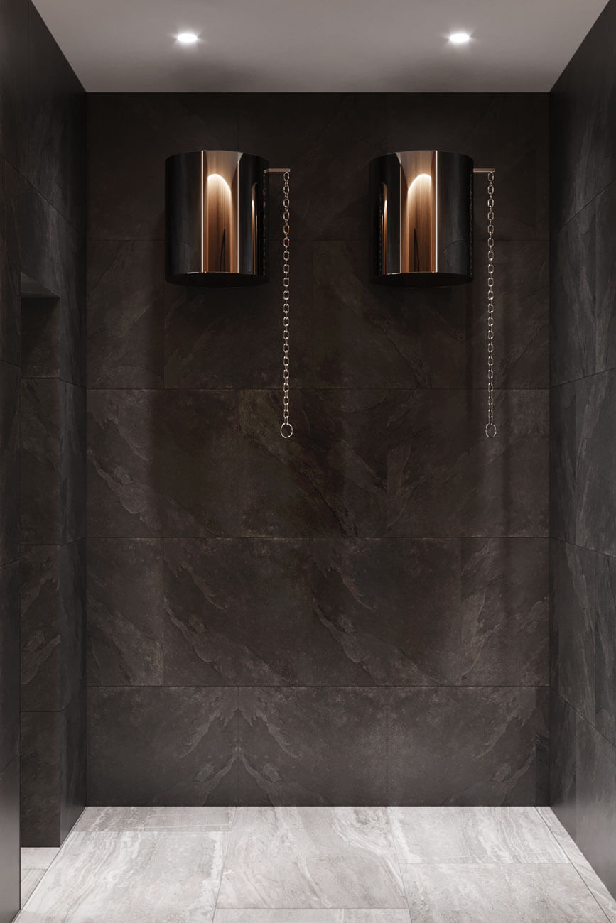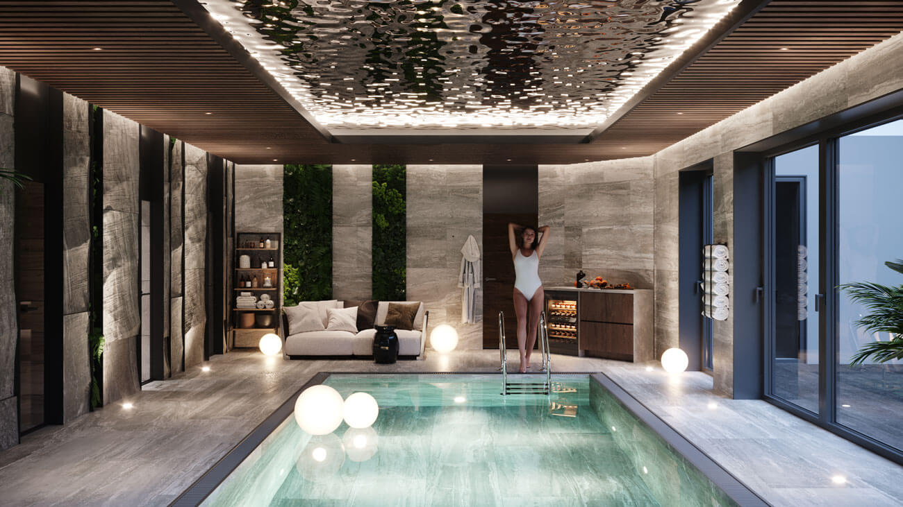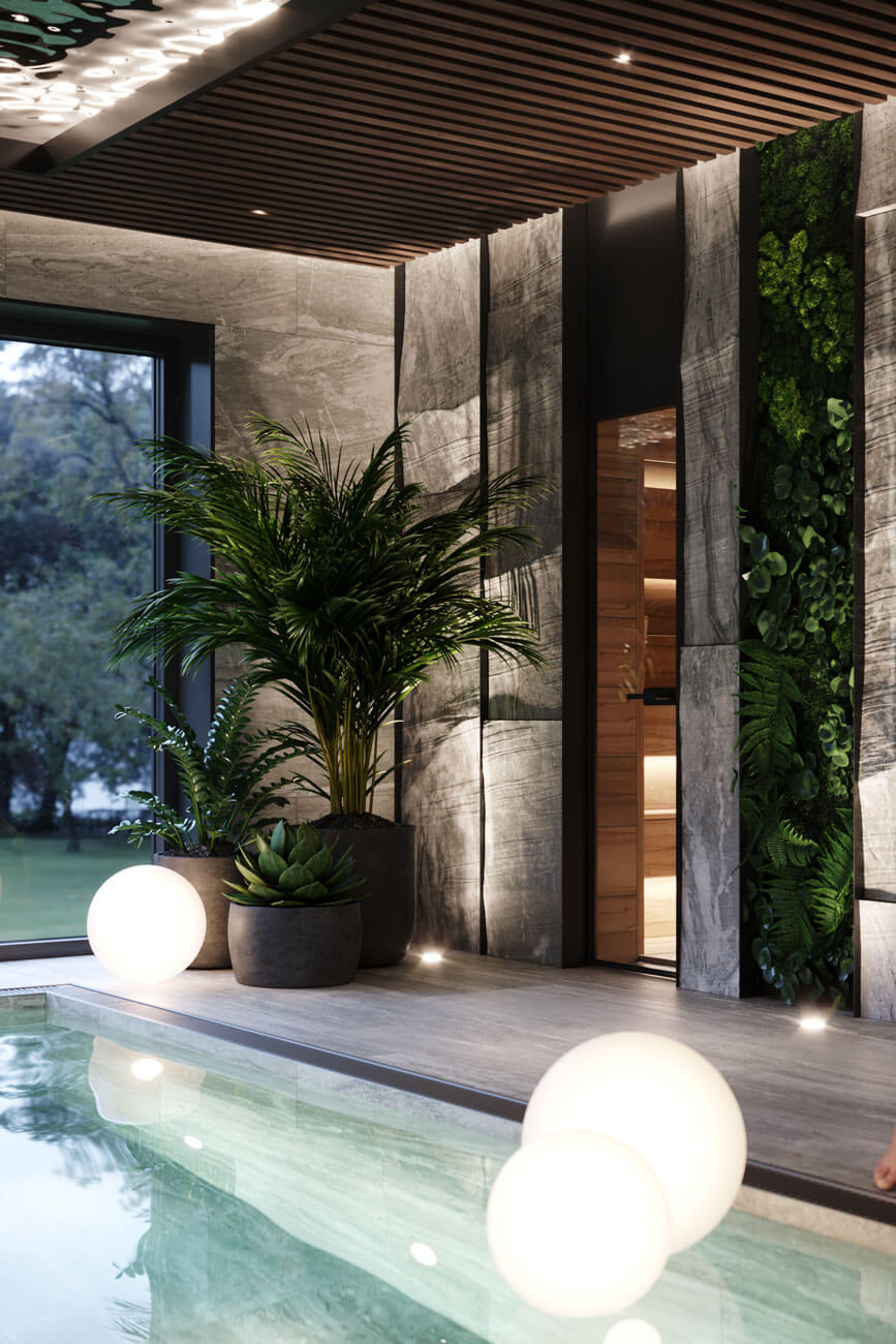 Загородный дом для большой семьи в пригороде Москвы. Под спа зону выделено отдельное крыло дома, где под панорамными окнами расположен плавательный бассейн с помещениями хамама и сауны. Стилистически зона спа — это сочетание современного стиля с элементами лофта, где фактурный, скалистый камень стен соседствует с панорамными окнами, металлическим глянцем панелей и современной мебелью. Бассейн соединяется с ландшафтом и визуально и через конструкцию раздвижных окон, которые открываясь, полностью стирают границы пространства спа с природой.
