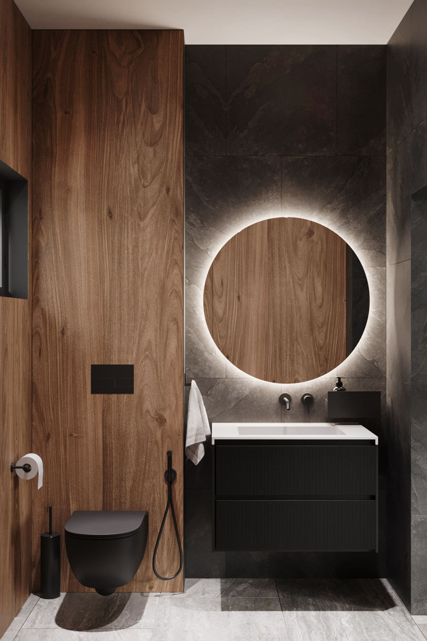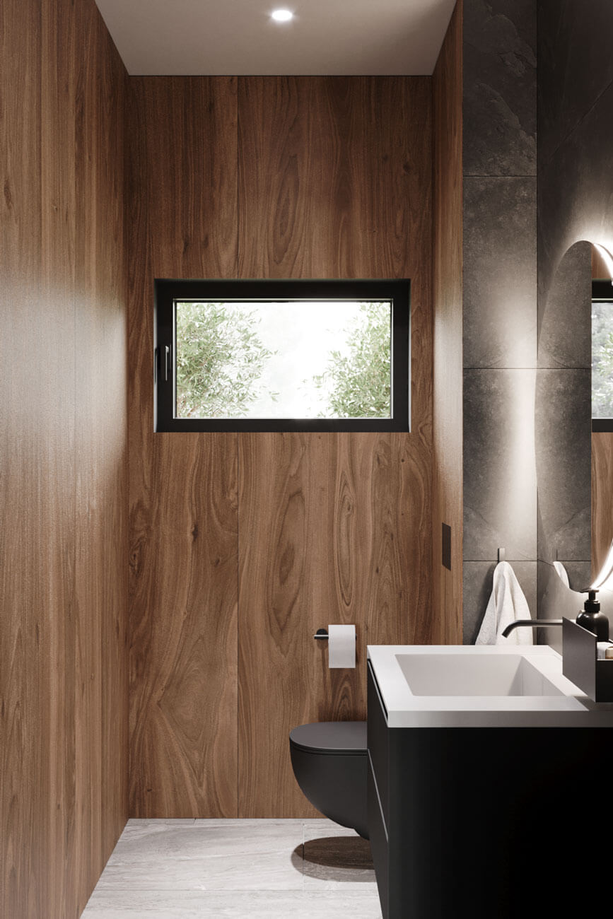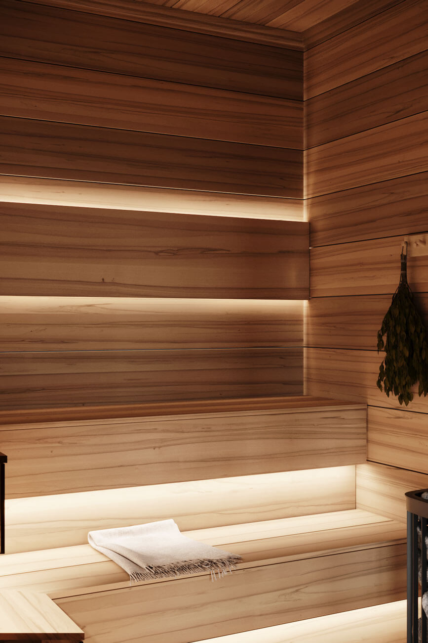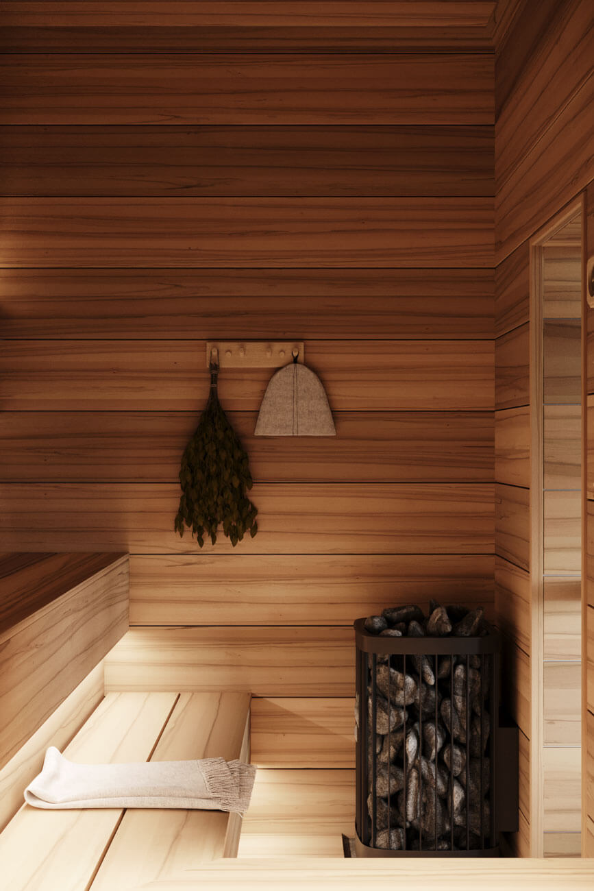 Загородный дом для большой семьи в пригороде Москвы. Под спа зону выделено отдельное крыло дома, где под панорамными окнами расположен плавательный бассейн с помещениями хамама и сауны. Стилистически зона спа — это сочетание современного стиля с элементами лофта, где фактурный, скалистый камень стен соседствует с панорамными окнами, металлическим глянцем панелей и современной мебелью. Бассейн соединяется с ландшафтом и визуально и через конструкцию раздвижных окон, которые открываясь, полностью стирают границы пространства спа с природой.