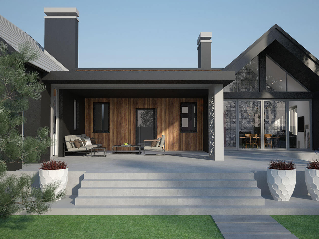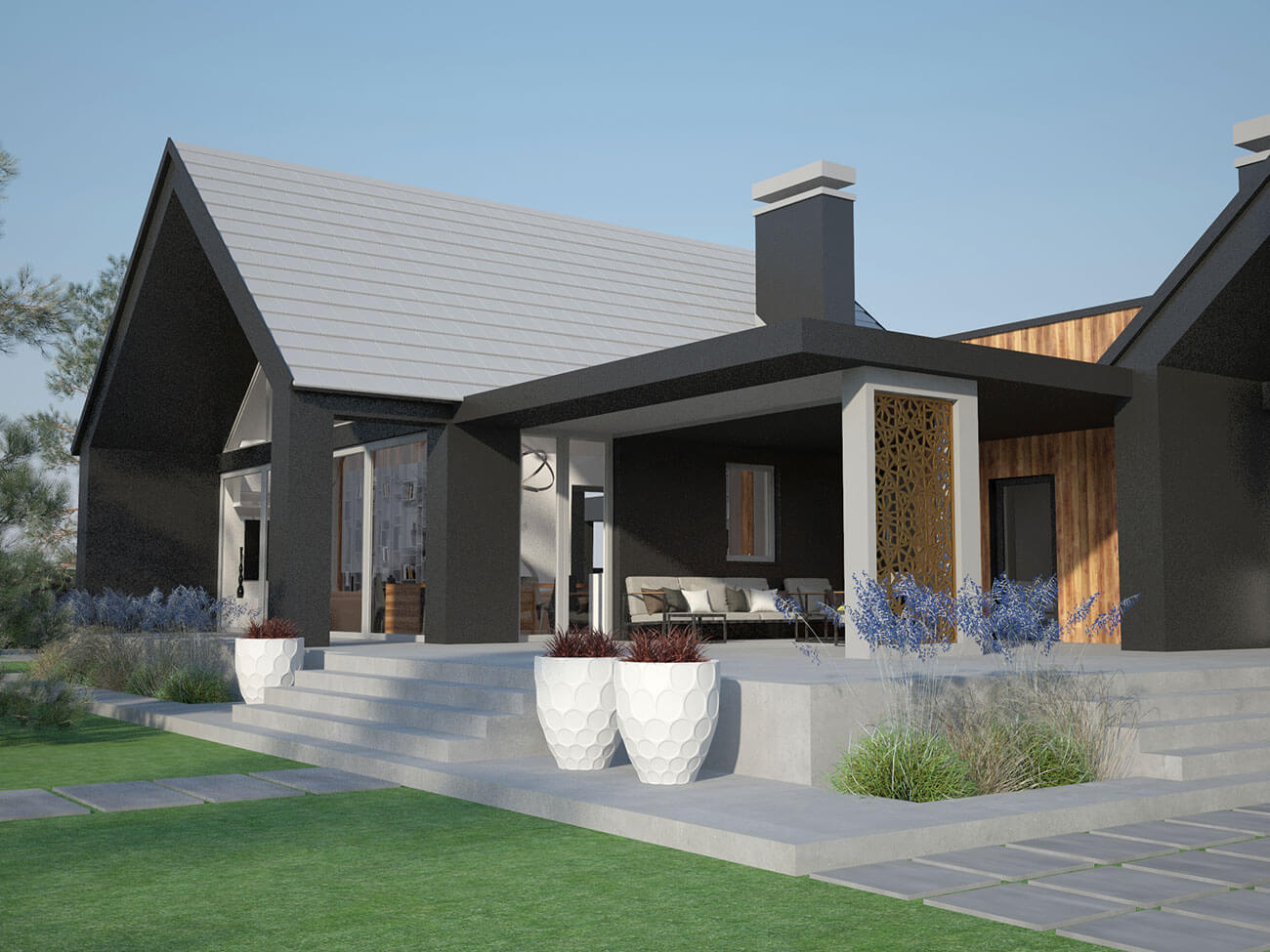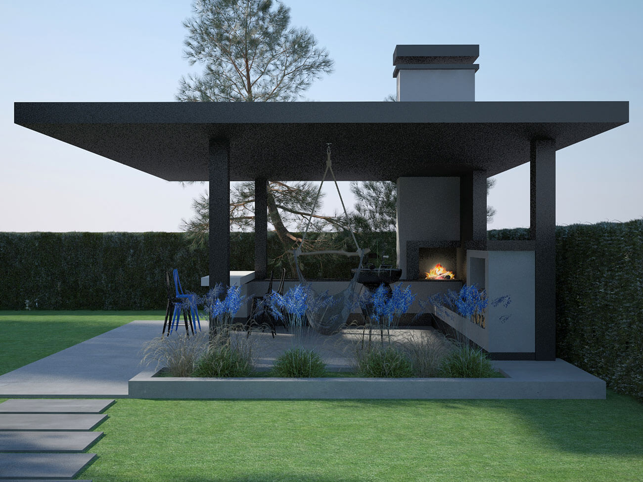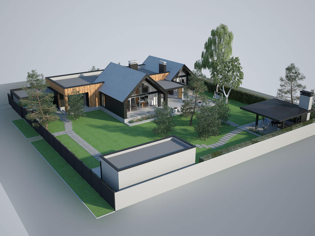 Зону отдыха-барбекю расположили напротив главных фронтонов фасада и немного в сторону от группы сосновых деревьев. Таким образом, сохранился массив существующих деревьев, а с места зоны отдыха семья может обозревать всю прелесть фасада дома. Этим подчеркиваю, насколько важна не только функциональная связь между объемами двора, но и визуальная. Пространство участка получилось максимально простое, лаконичное и функциональное, имеет линейные переходы от одной зоны в другую. С помощью композиционного взаимодействия, объединяется в общий, единый организм.