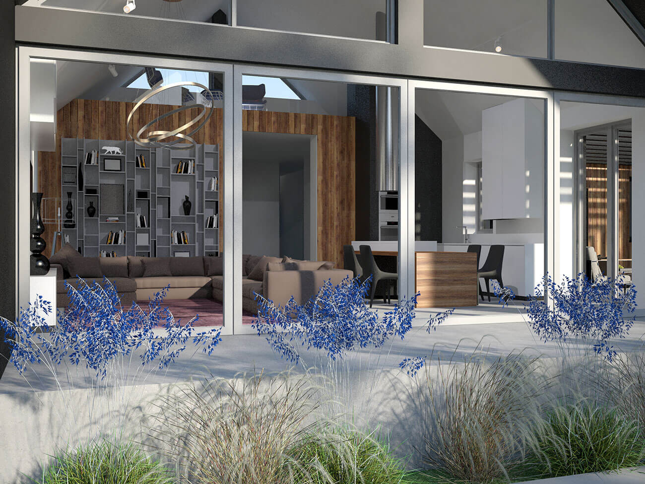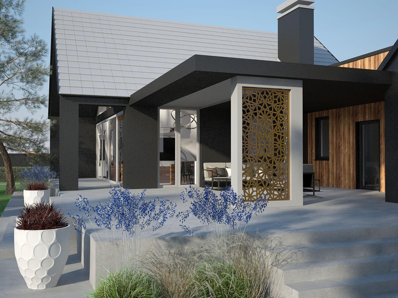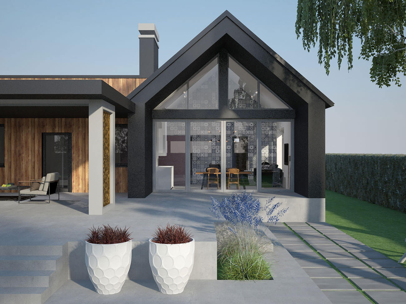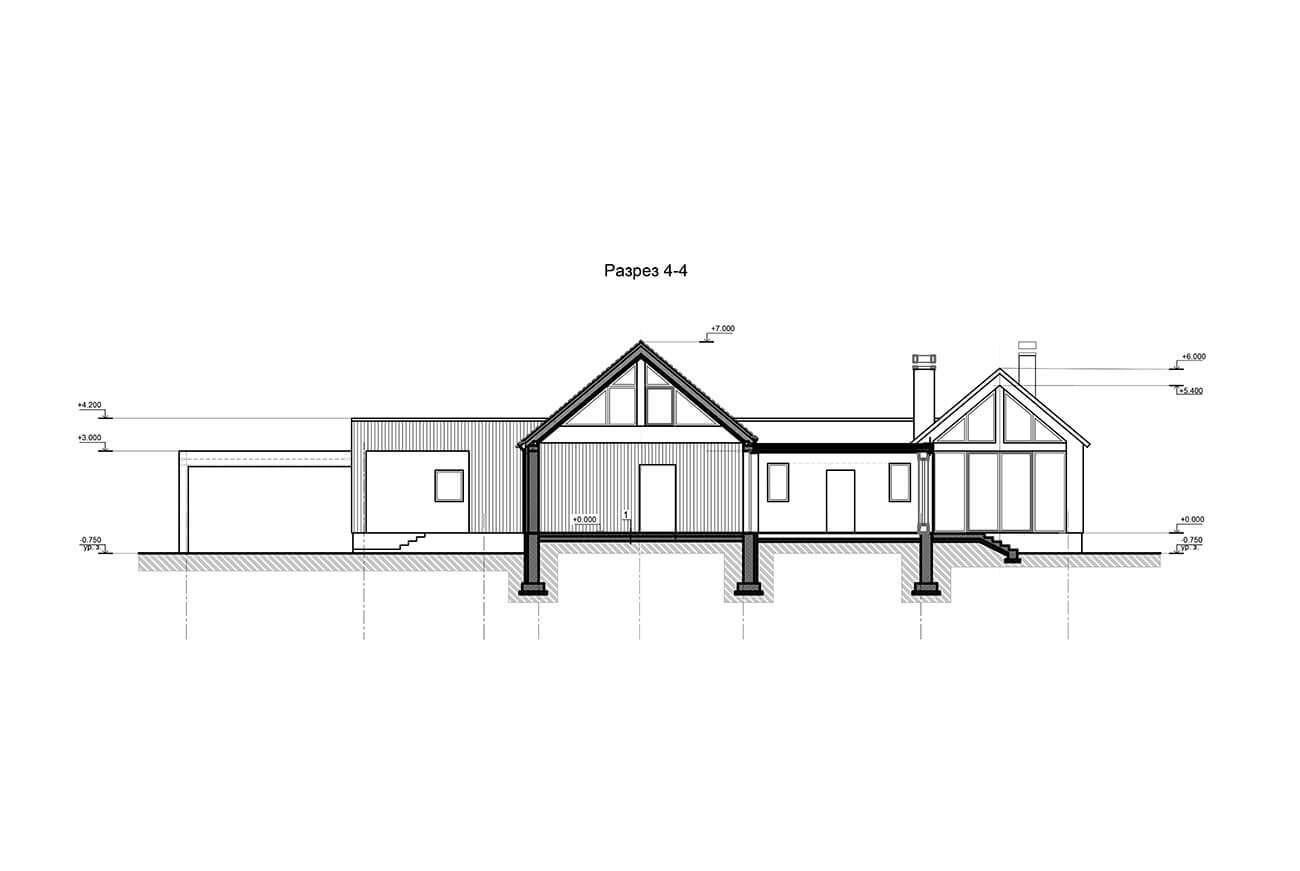 Зону отдыха-барбекю расположили напротив главных фронтонов фасада и немного в сторону от группы сосновых деревьев. Таким образом, сохранился массив существующих деревьев, а с места зоны отдыха семья может обозревать всю прелесть фасада дома. Этим подчеркиваю, насколько важна не только функциональная связь между объемами двора, но и визуальная. Пространство участка получилось максимально простое, лаконичное и функциональное, имеет линейные переходы от одной зоны в другую. С помощью композиционного взаимодействия, объединяется в общий, единый организм.